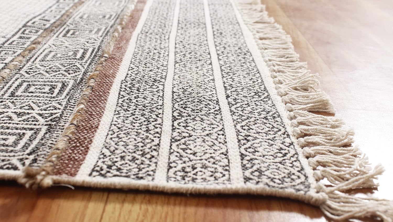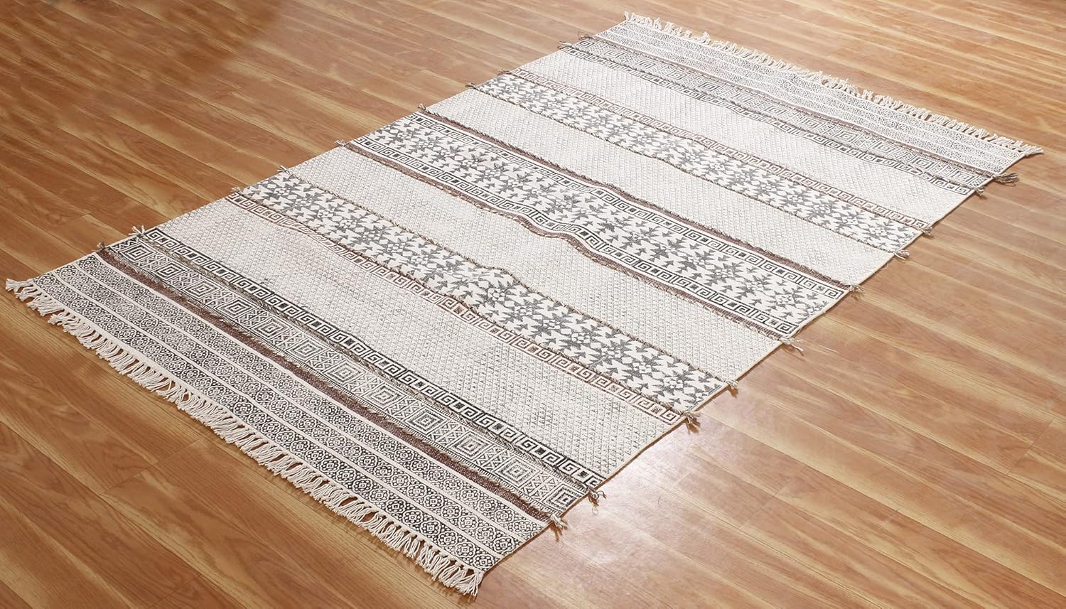 Ein handgeknüpfter Orientteppich ist nicht nur ein Bodenbelag – er ist Kunst, Kultur und Wertanlage zugleich. Mit dem Striped Flat Weave Rug Hand Printed 9×12 Kilim Living Room Handmade Boho Grey Beige Thick 0.2 Inch Cotton Easy Washable Indoor Outdoor Bedroom Rug holen Sie sich ein Stück Geschichte in Ihre vier Wände.