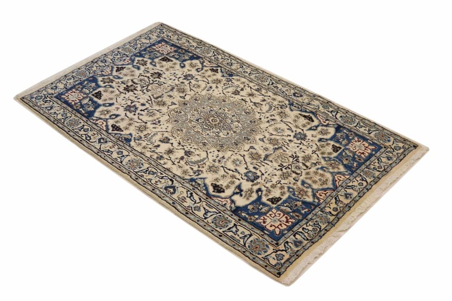 12-lagiger Nain-Teppich | Knotendichte: 200.000 – 250.000 Knoten/m² | Material: Handgesponnene Wolle & Baumwolle | Größe: 198×114 cm | Zustand: Neu | Farbe: Weiß/Beige | Verarbeitung: Handgeknüpft | Ursprung: Iran / Persien