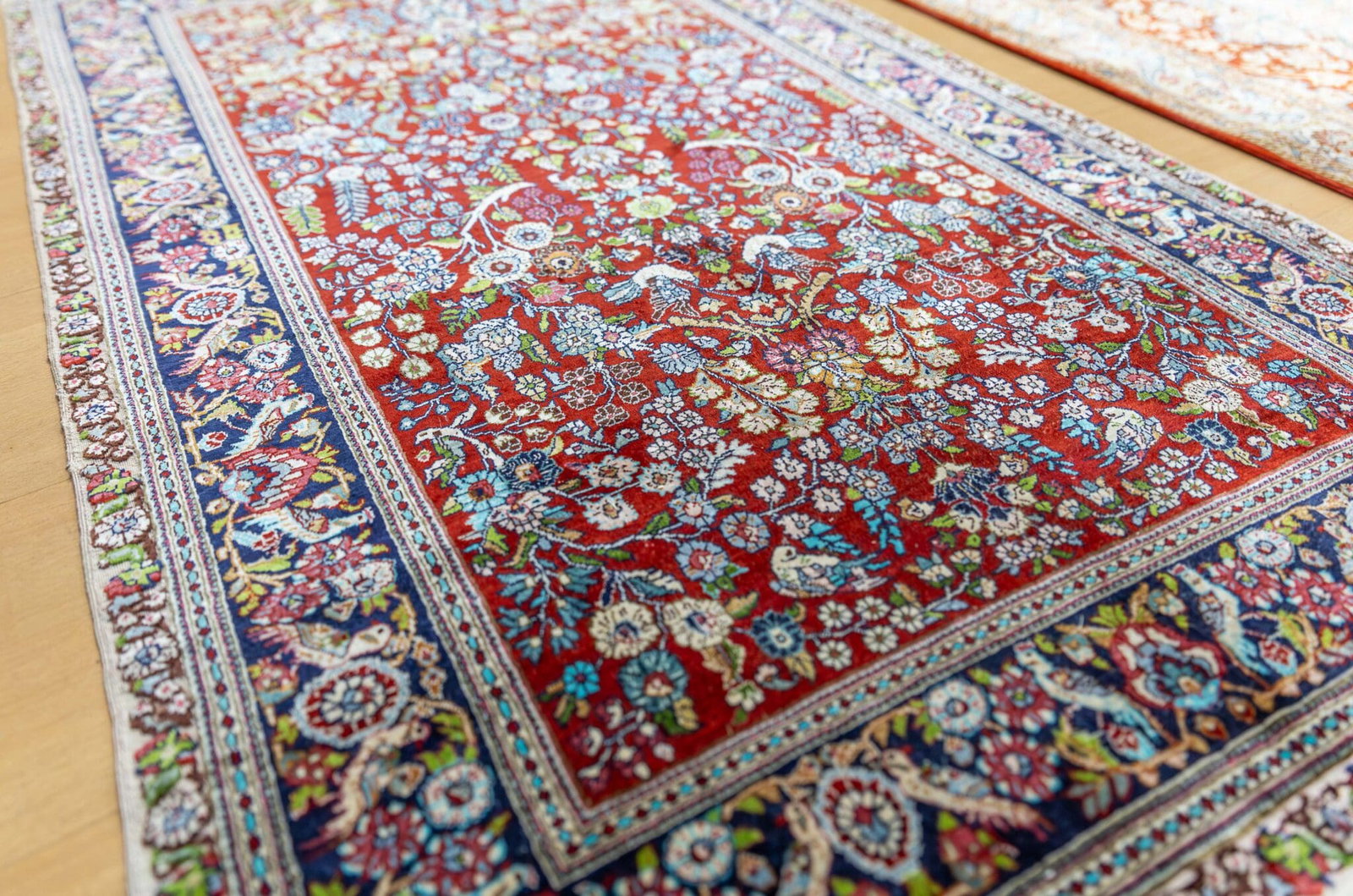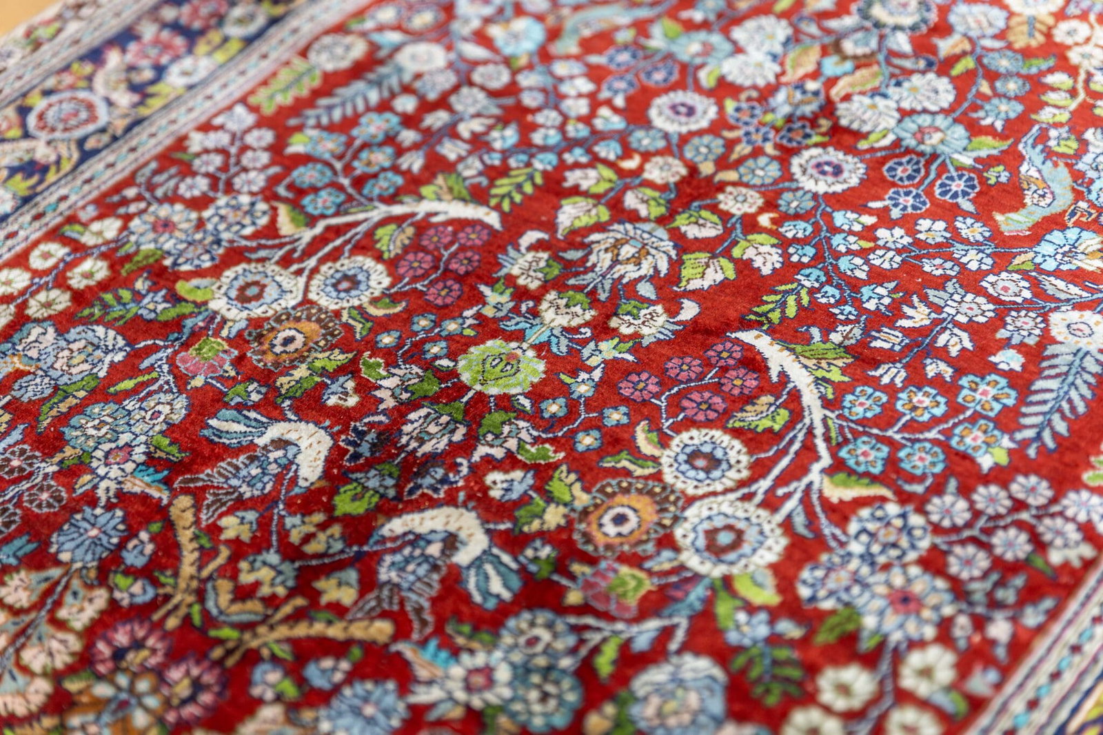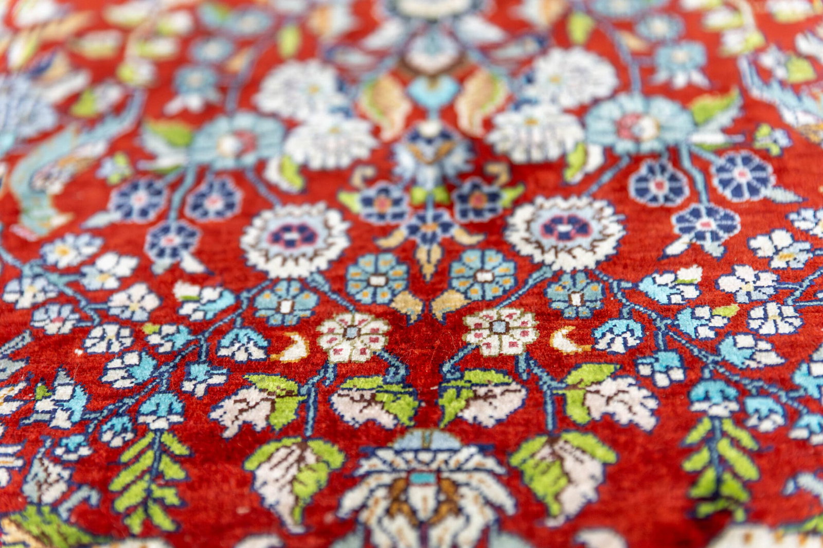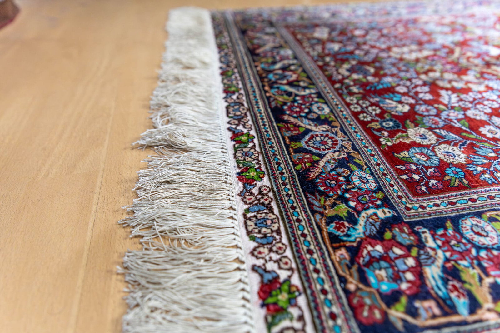 Der Teppich befindet sich in sehr gutem Zustand. Die Seidenstruktur ist hervorragend erhalten und zeigt einen natürlichen Glanz, der die Qualität dieses Stücks unterstreicht.