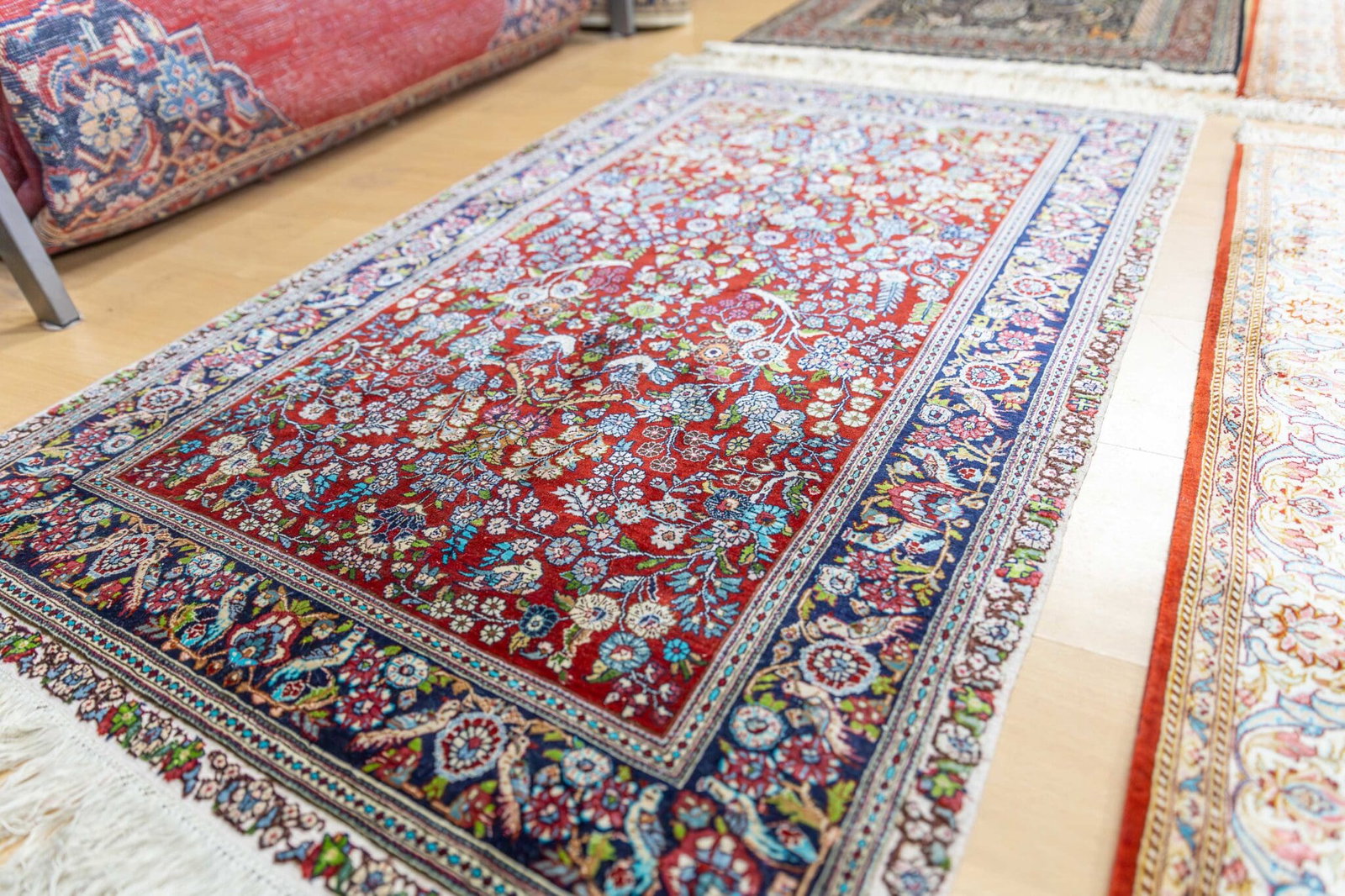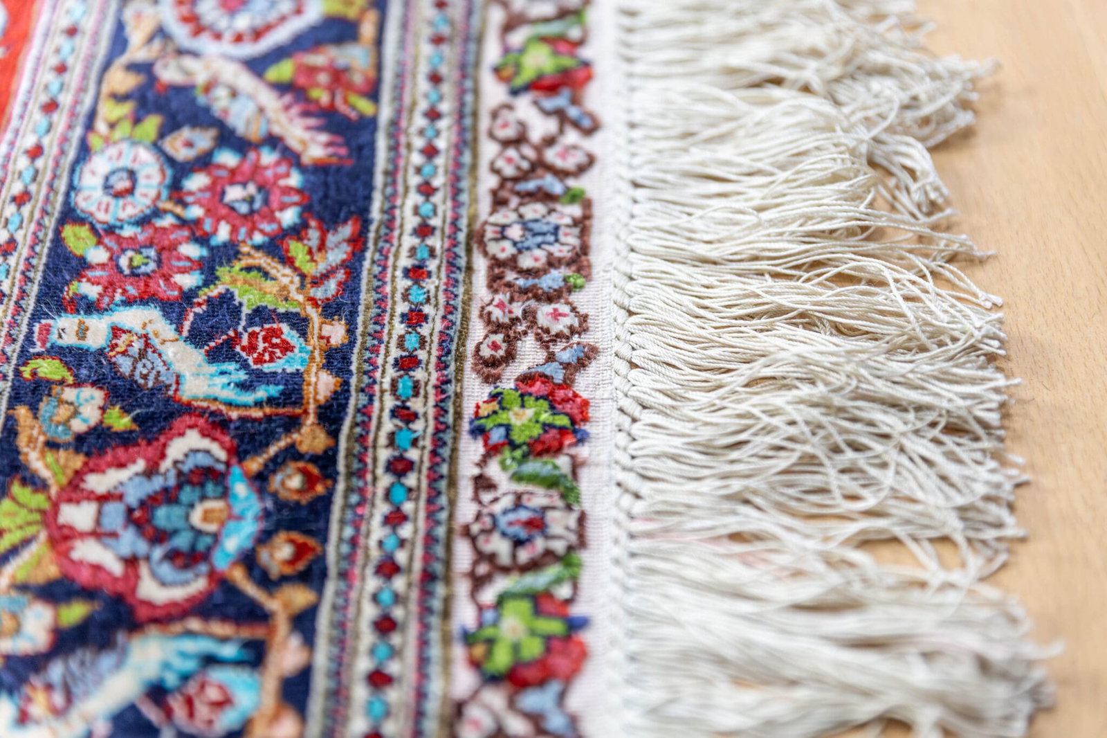 Dieser handgeknüpfte Seidenteppich besteht vollständig aus reiner Naturseide – sowohl im Flor als auch in Kette und Schuss (Seide auf Seide). Mit einer Knotendichte von ca. 1.000.000 Knoten pro Quadratmeter gehört dieses Stück zur absoluten Spitzenklasse feinster Orientteppiche. Die präzise Knüpfung ermöglicht eine außergewöhnlich detaillierte Darstellung feinster Muster und verleiht dem Teppich einen edlen, seidigen Glanz.