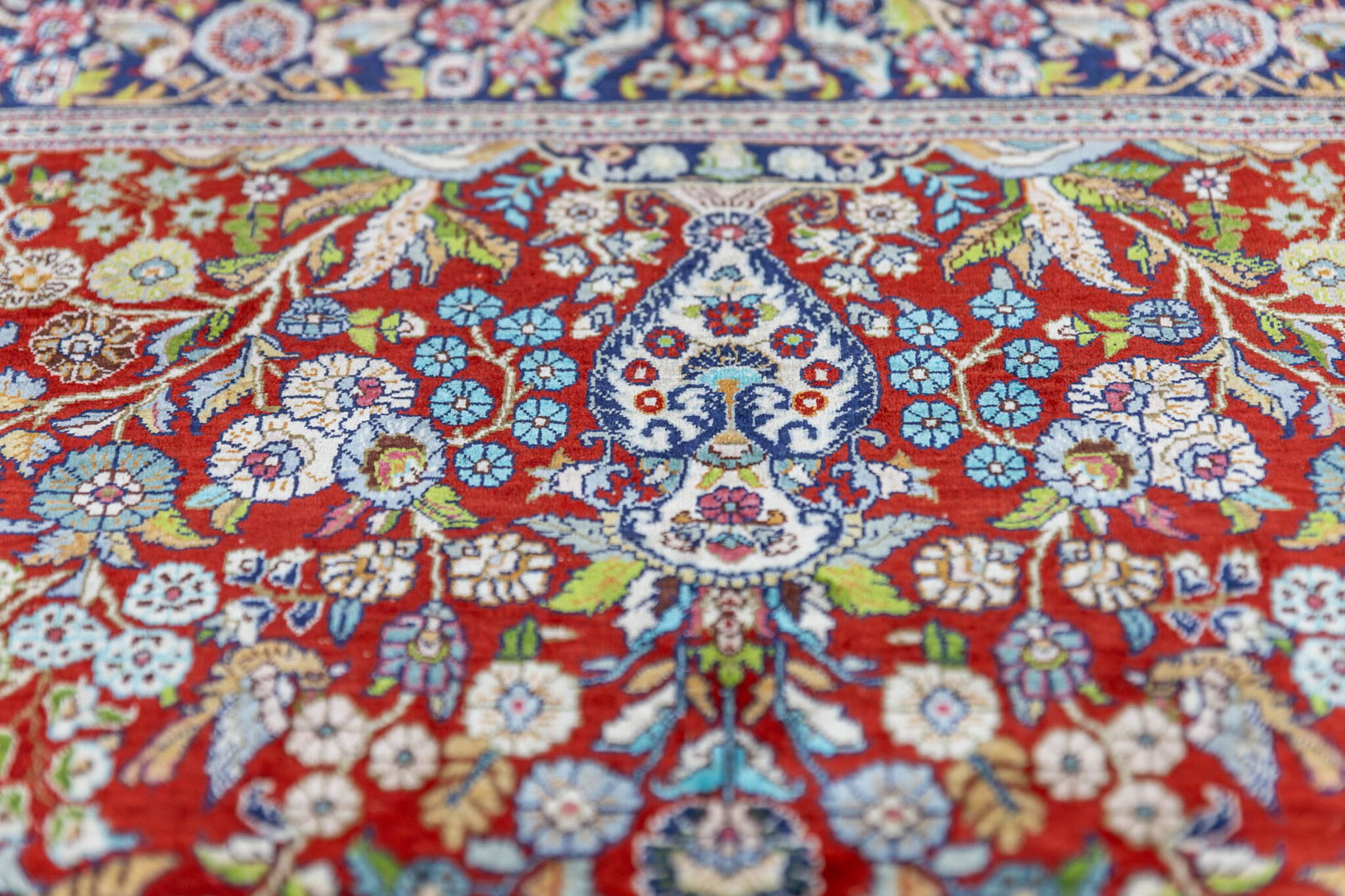 Mit seiner extrem hohen Knotendichte und der Verarbeitung aus reiner Seide ist dieser Teppich ein hochwertiges Einzelstück. Die Kombination aus feinster Knüpfung und klassischem Design macht ihn zu einem eleganten Blickfang und wertigen Dekorationsobjekt.