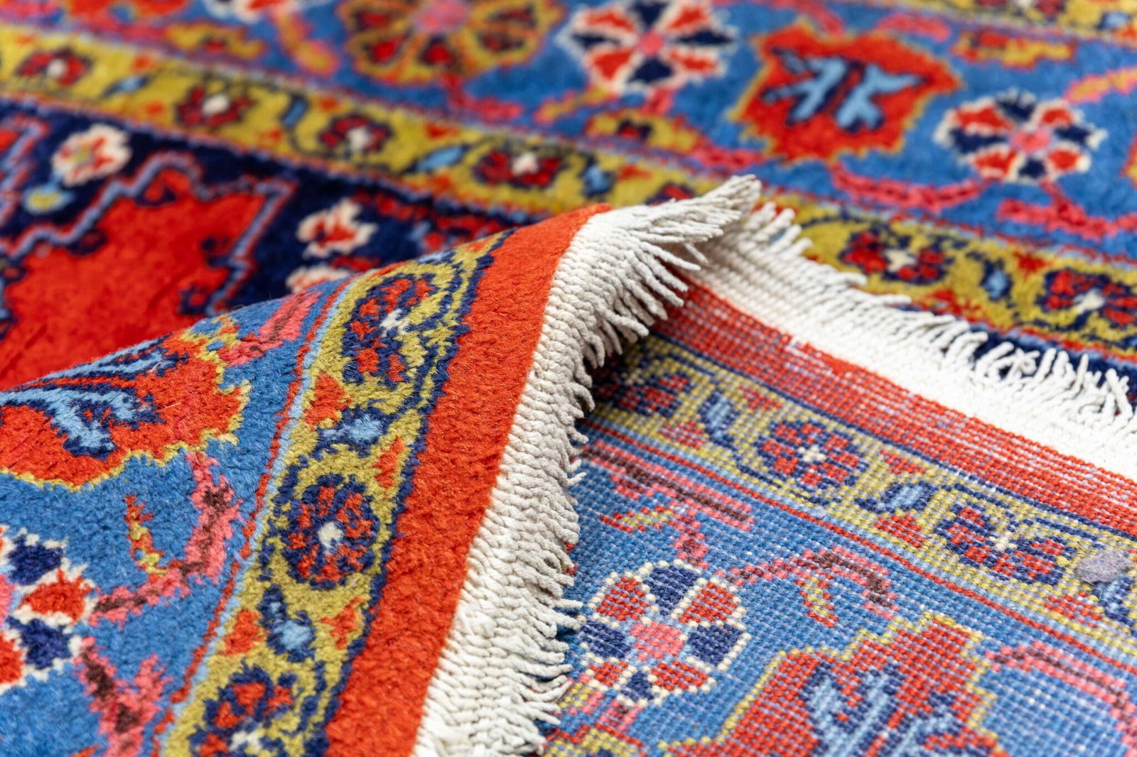 Der Flor besteht aus natürlicher Wolle, während die Kette aus Baumwolle gefertigt ist. Diese Kombination ist typisch für viele traditionelle persische Teppiche und sorgt für Stabilität sowie angenehme Haptik.