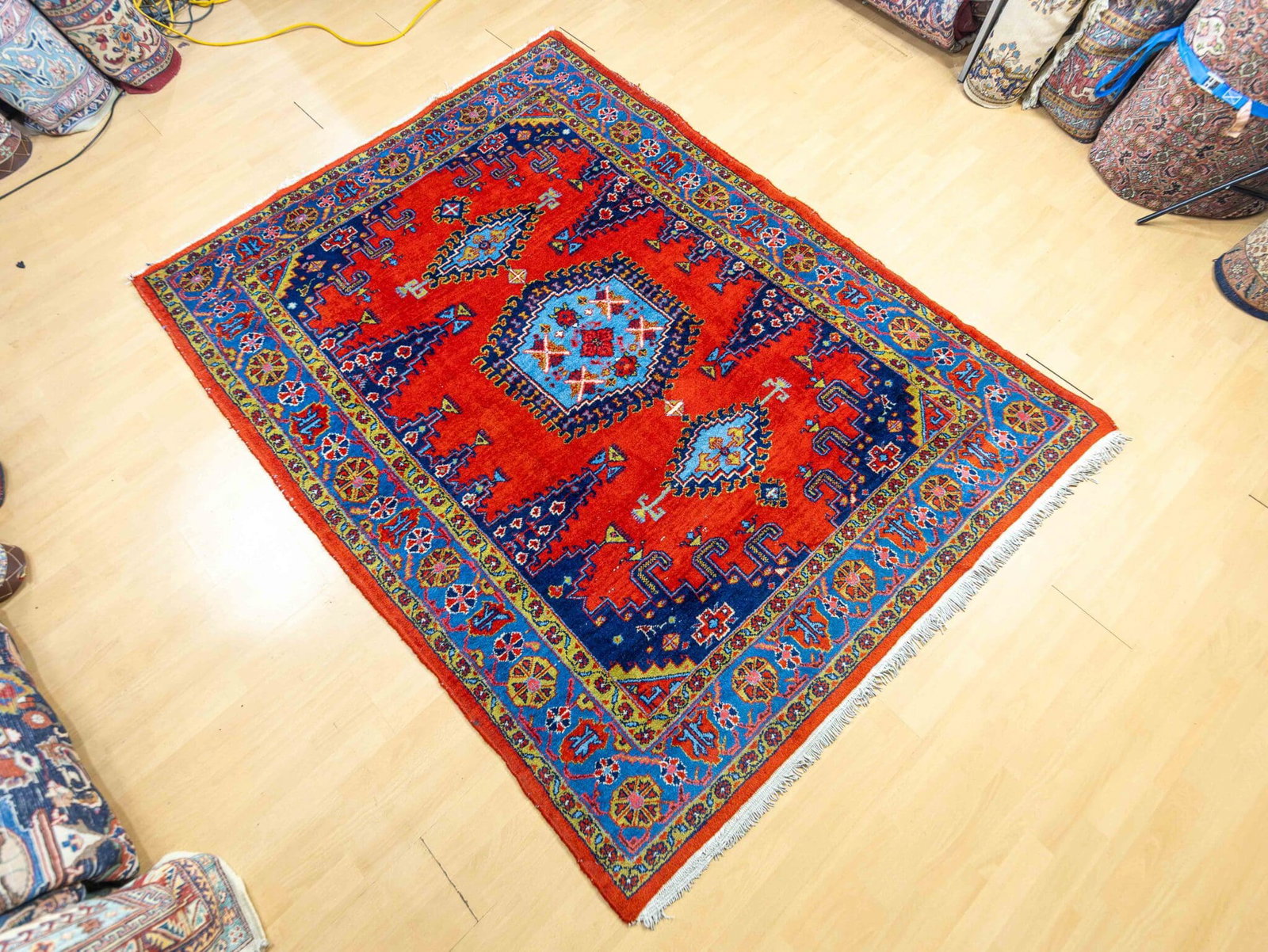Dieser handgeknüpfte Vintage Perserteppich besteht aus hochwertiger Schurwolle auf einer stabilen Baumwollkette. Mit einer Knotendichte von ca. 120.000 Knoten pro Quadratmeter bietet der Teppich eine solide und langlebige Struktur. Die traditionelle Handknüpftechnik verleiht jedem Teppich eine einzigartige Ausstrahlung und garantiert eine lange Lebensdauer.