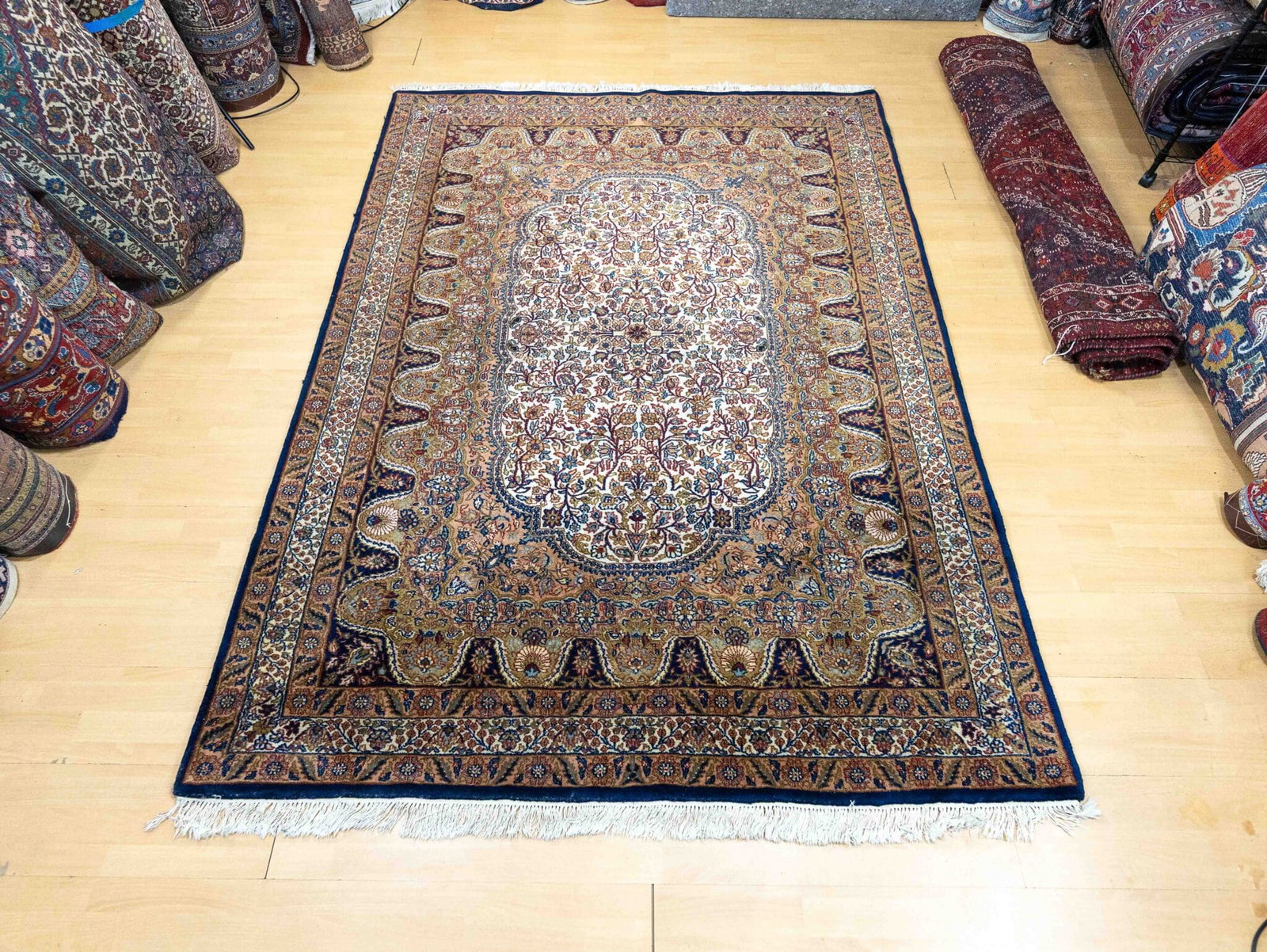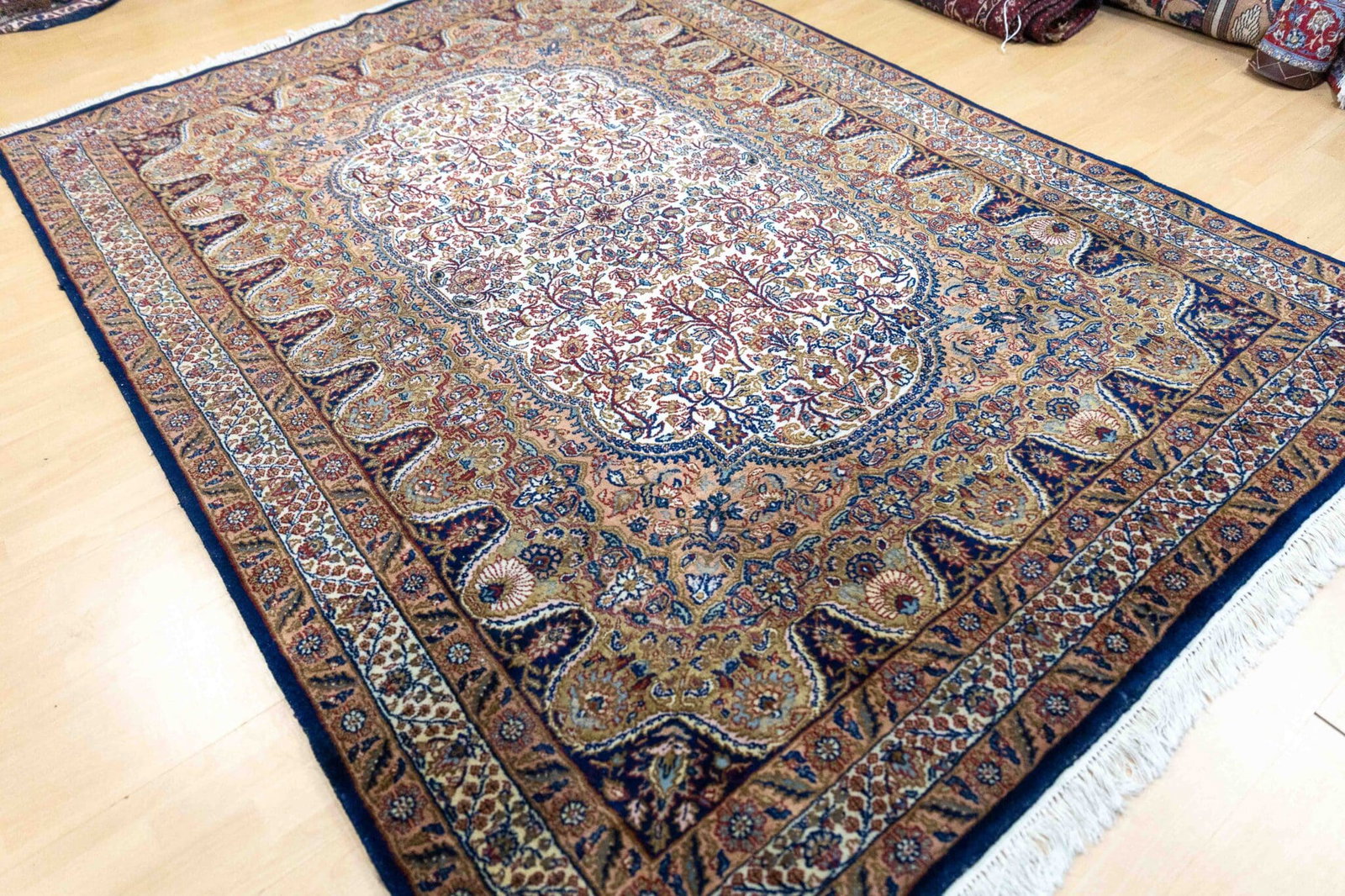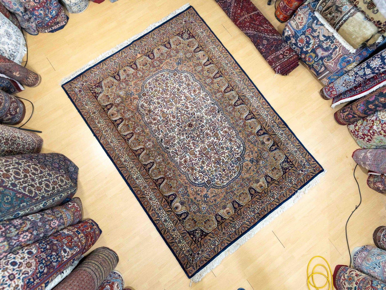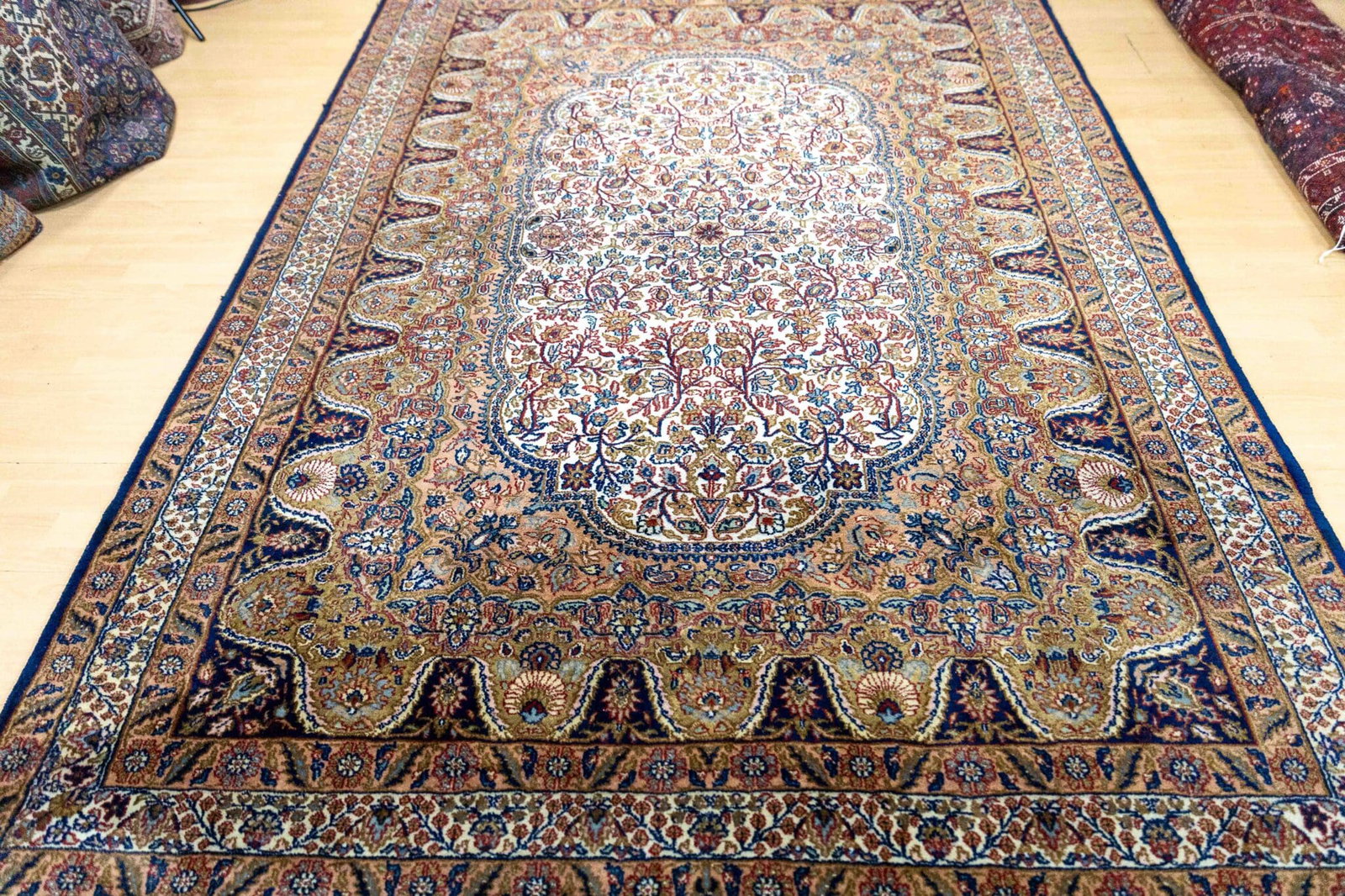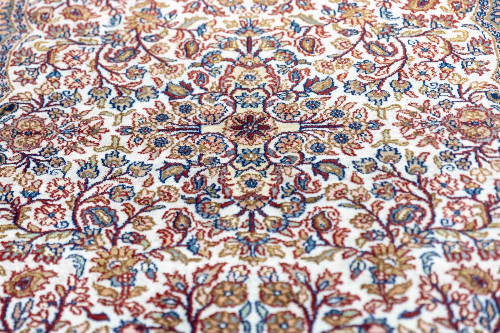 Typisch für Kerman-Designs sind filigrane florale Muster mit zentralem Medaillon oder reich verzierter Feldgestaltung – stilvoll und repräsentativ zugleich.