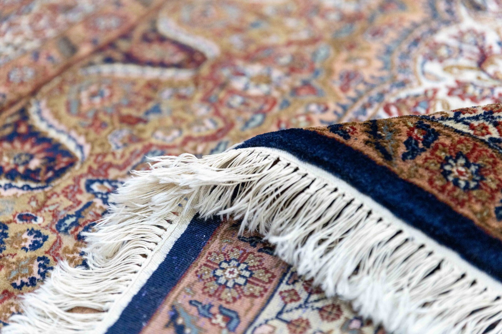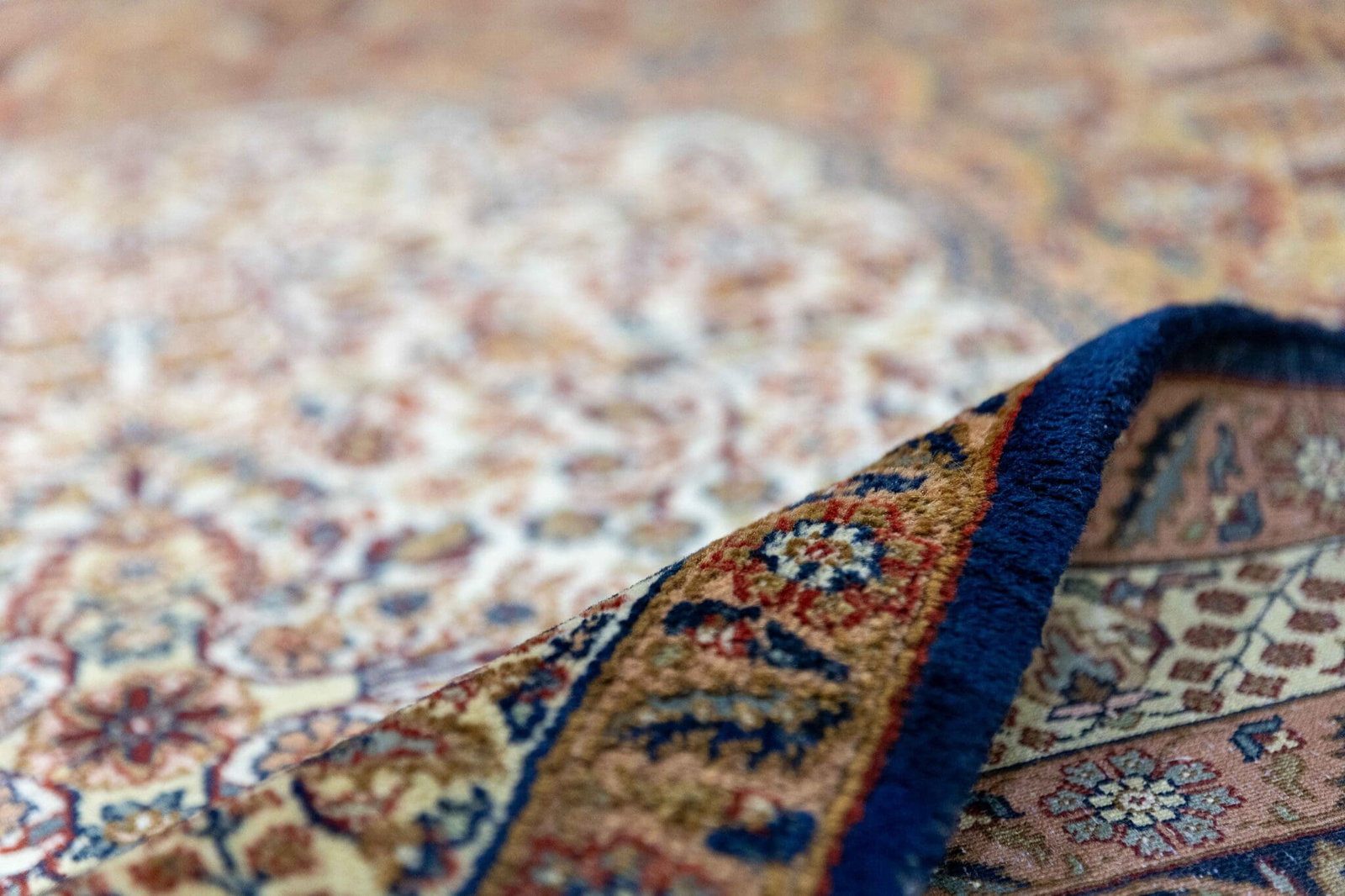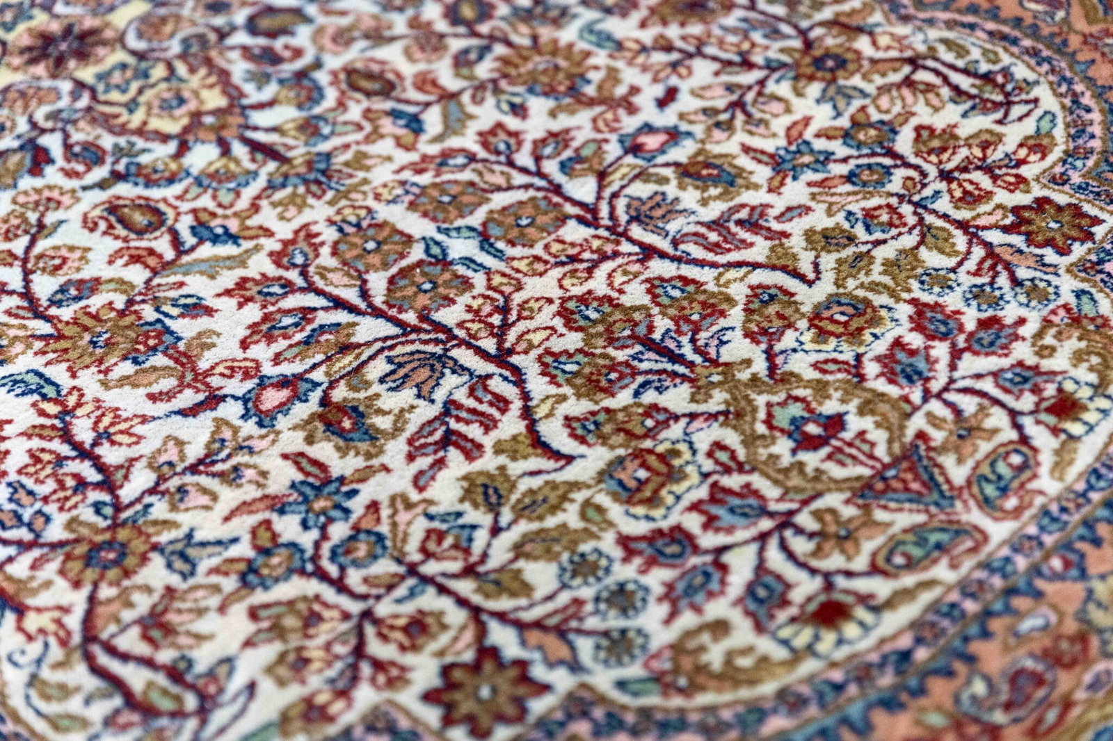 Die dichte Knüpfung ermöglicht eine präzise Ausarbeitung der floralen Ornamente und verleiht dem Teppich eine elegante Detailtiefe.