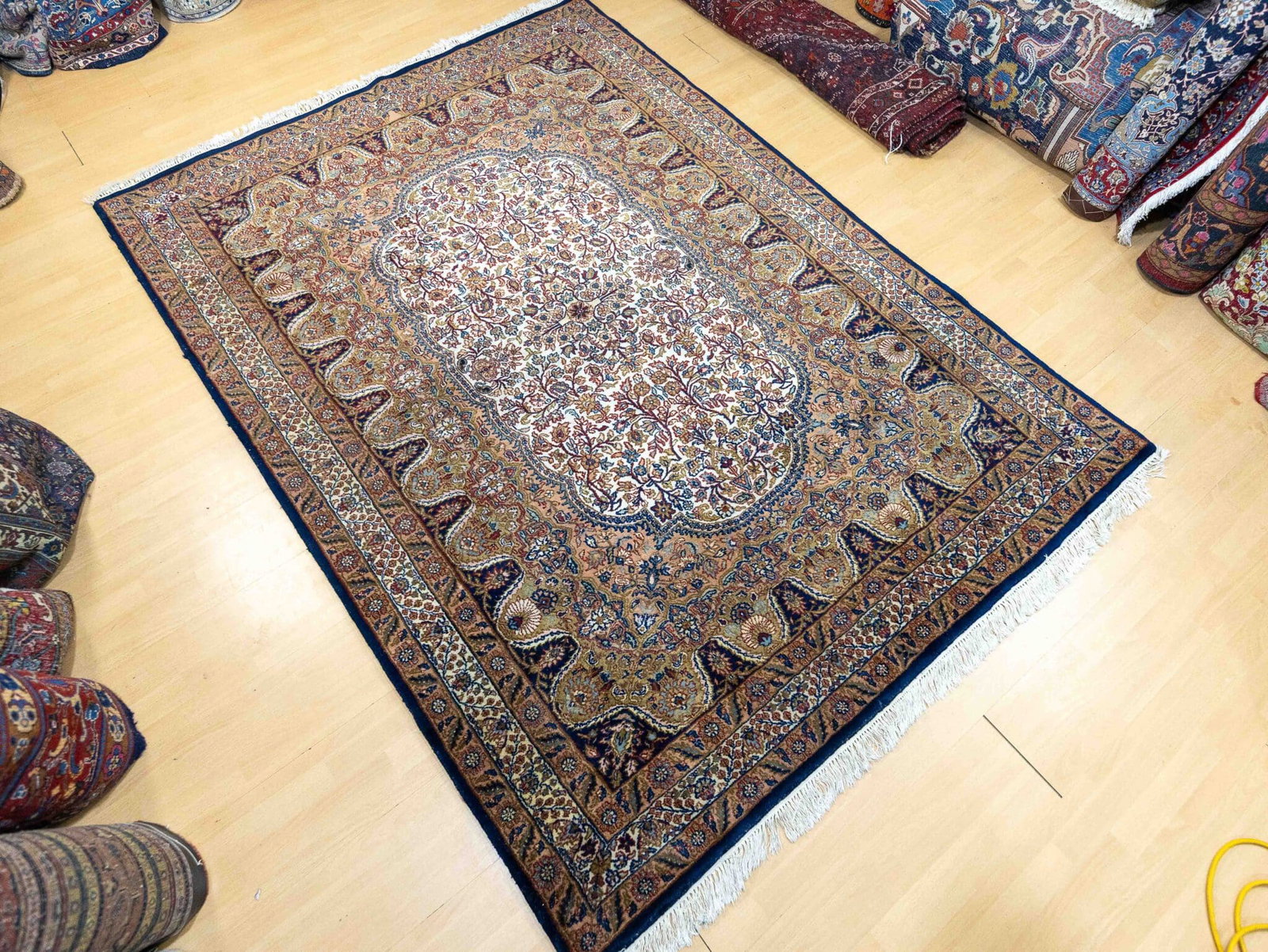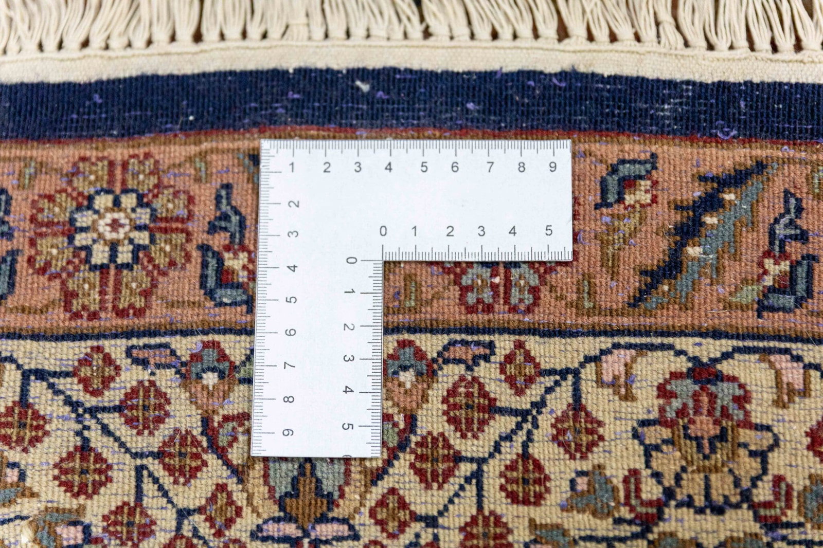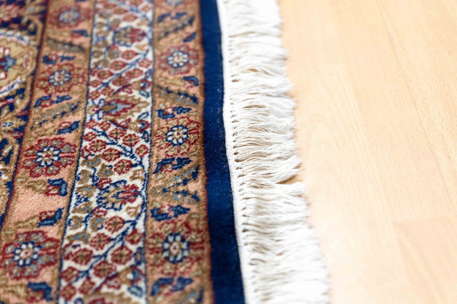 Die dichte Knüpfung ermöglicht eine präzise Ausarbeitung der floralen Ornamente und verleiht dem Teppich eine elegante Detailtiefe.