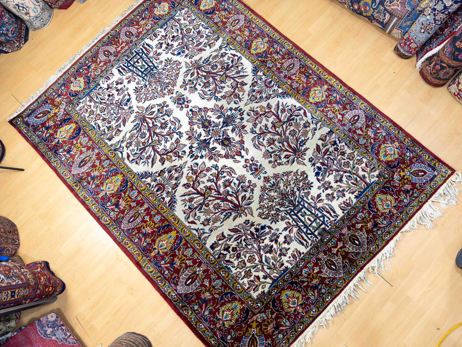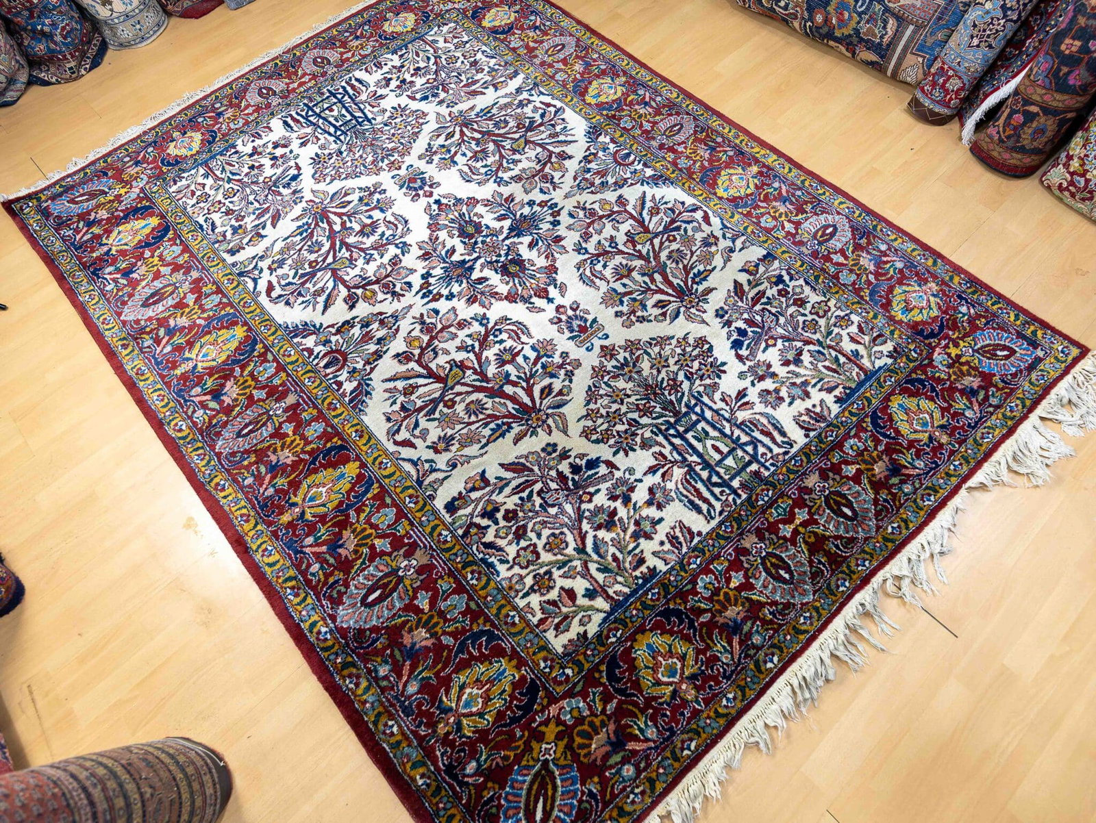 Ein handgeknüpfter Orientteppich, der persische Designtraditionen mit indischer Handwerkskunst verbindet. Typisch sind klare Muster, harmonische Farben und hohe Knotendichte.