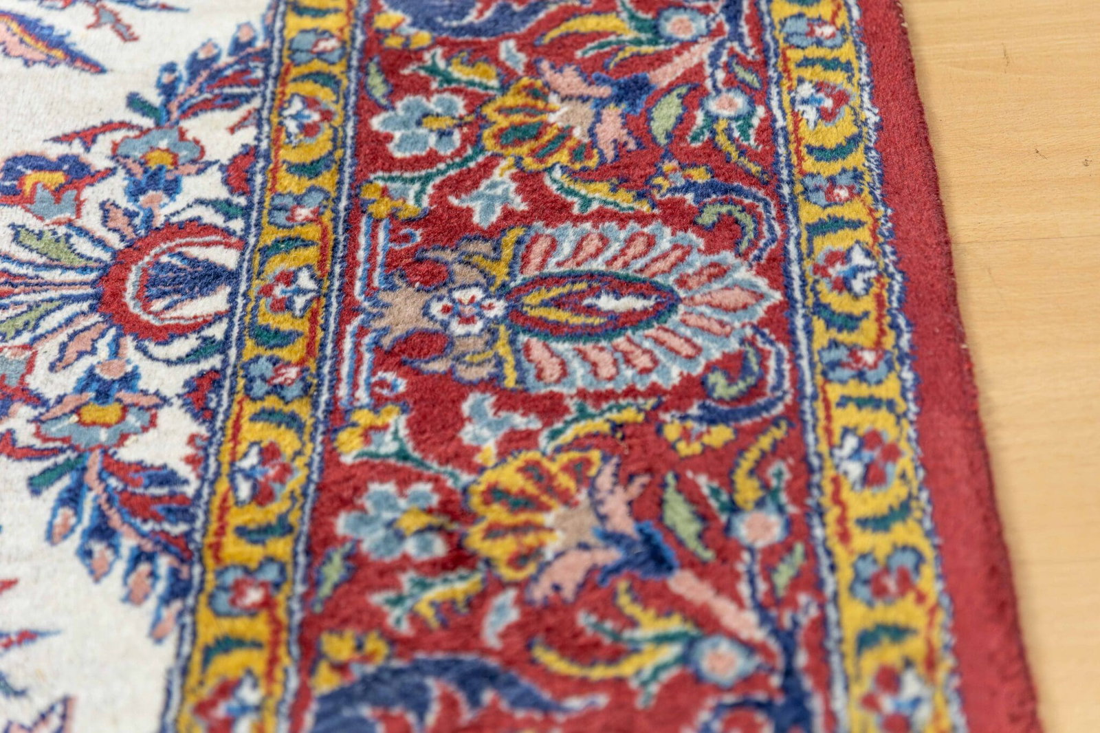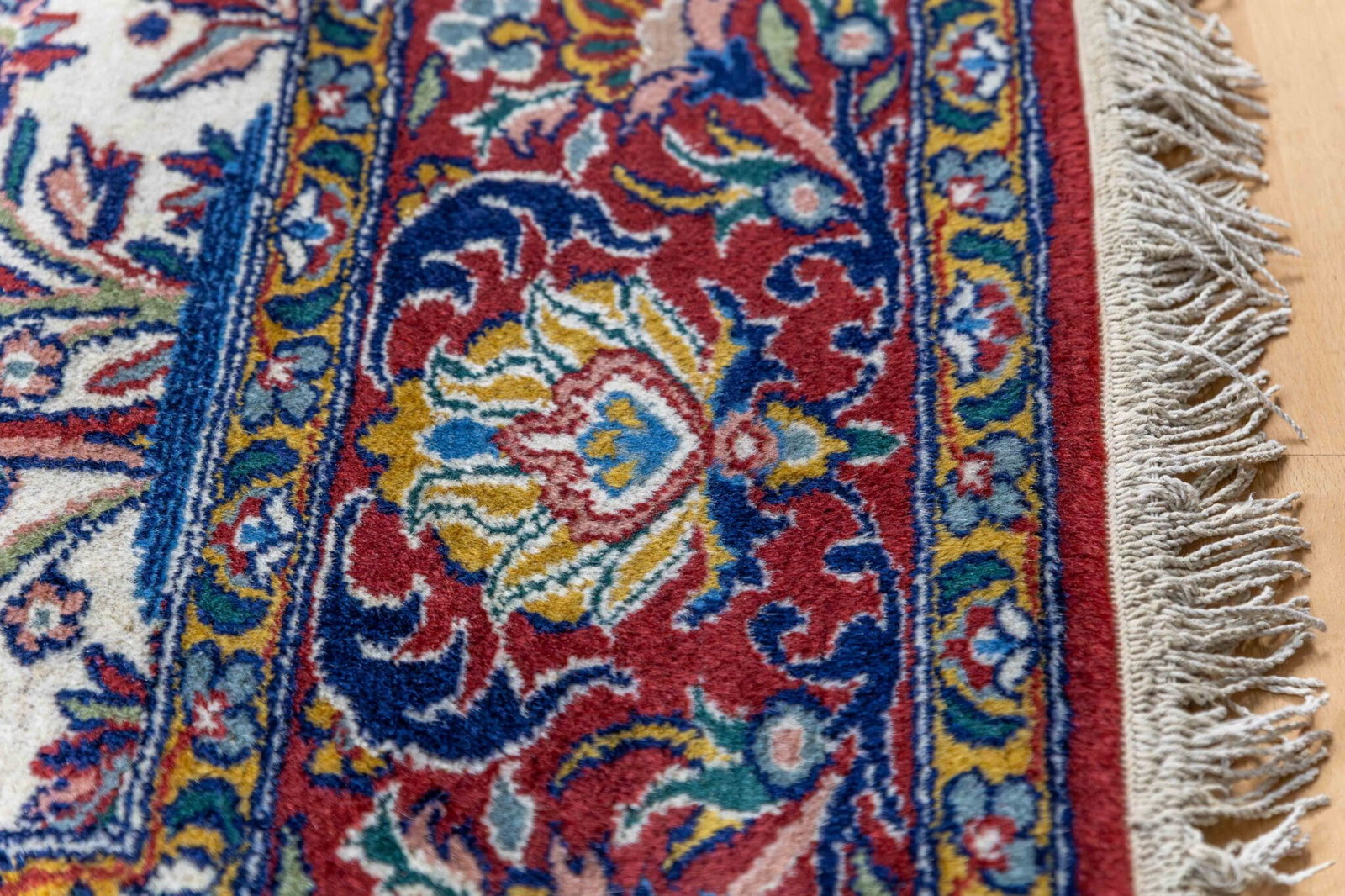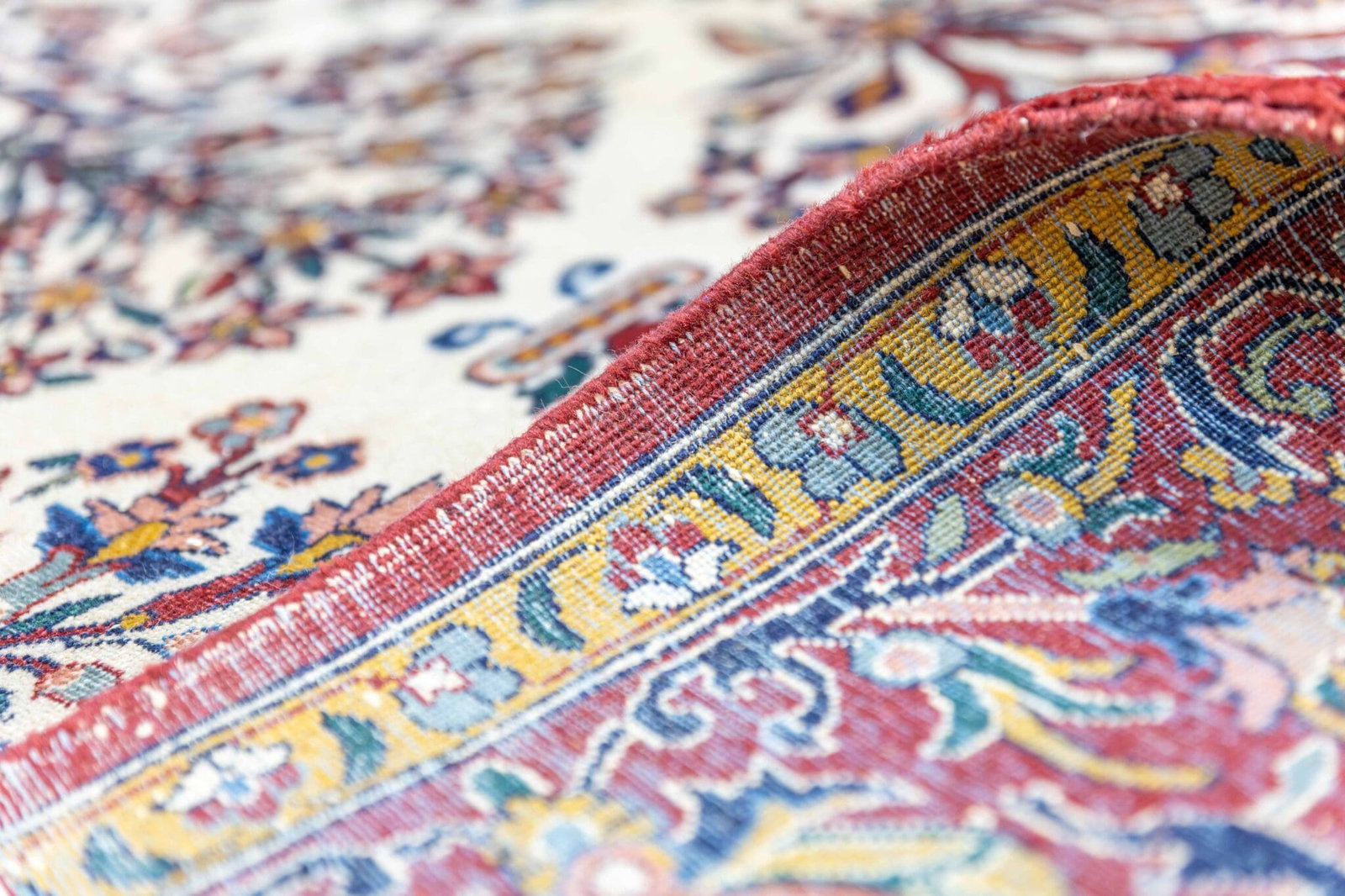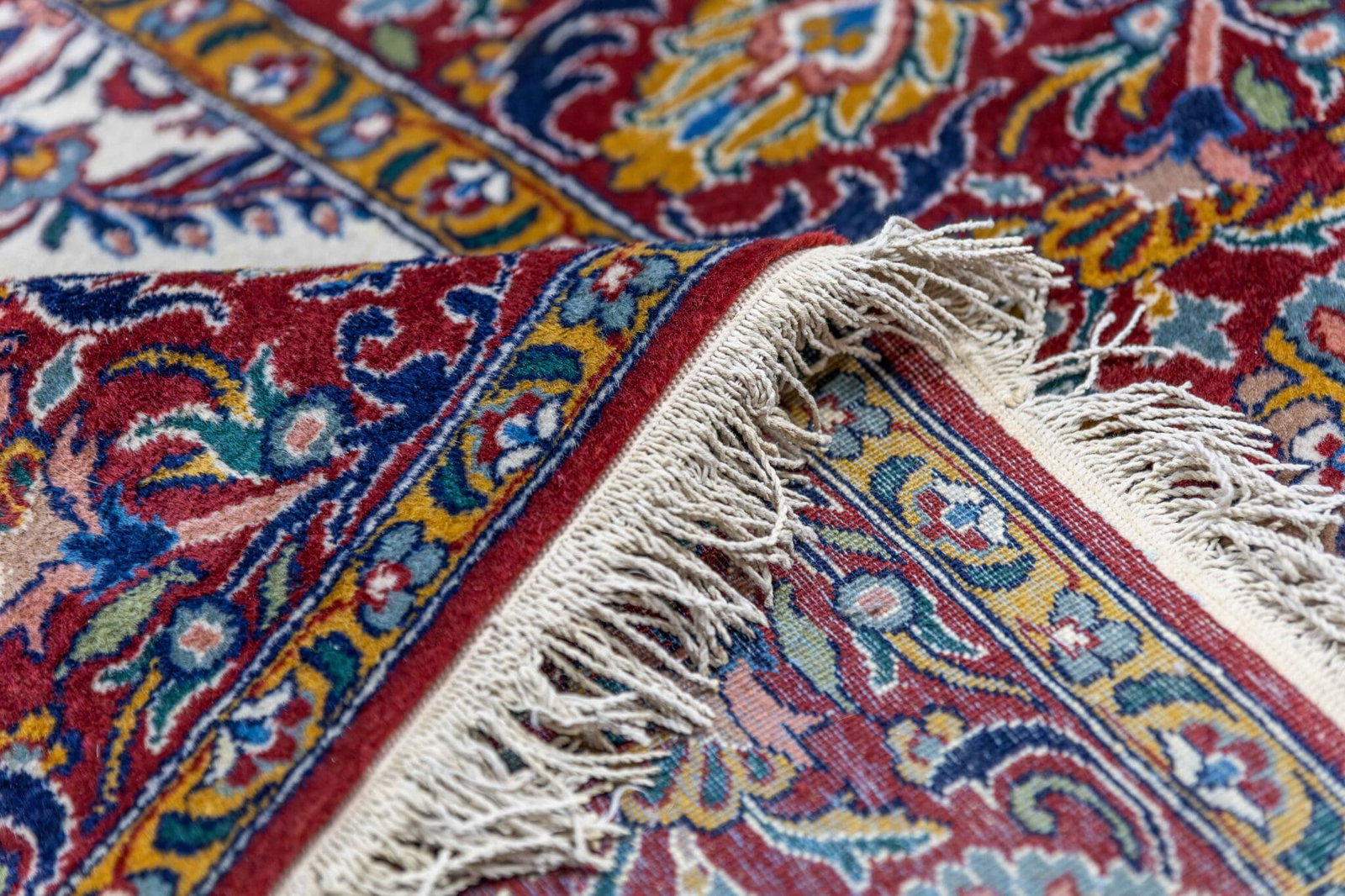 Dieser handgeknüpfte Orientteppich besteht aus hochwertiger Wolle auf Baumwolle. Die Knotendichte von ca. 250.000 Knoten/m² ermöglicht feine Details und ein harmonisches Musterbild. Der Teppich wurde gewaschen und mit Motten-Schutz behandelt, um Langlebigkeit und Pflegeleichtigkeit zu gewährleisten.