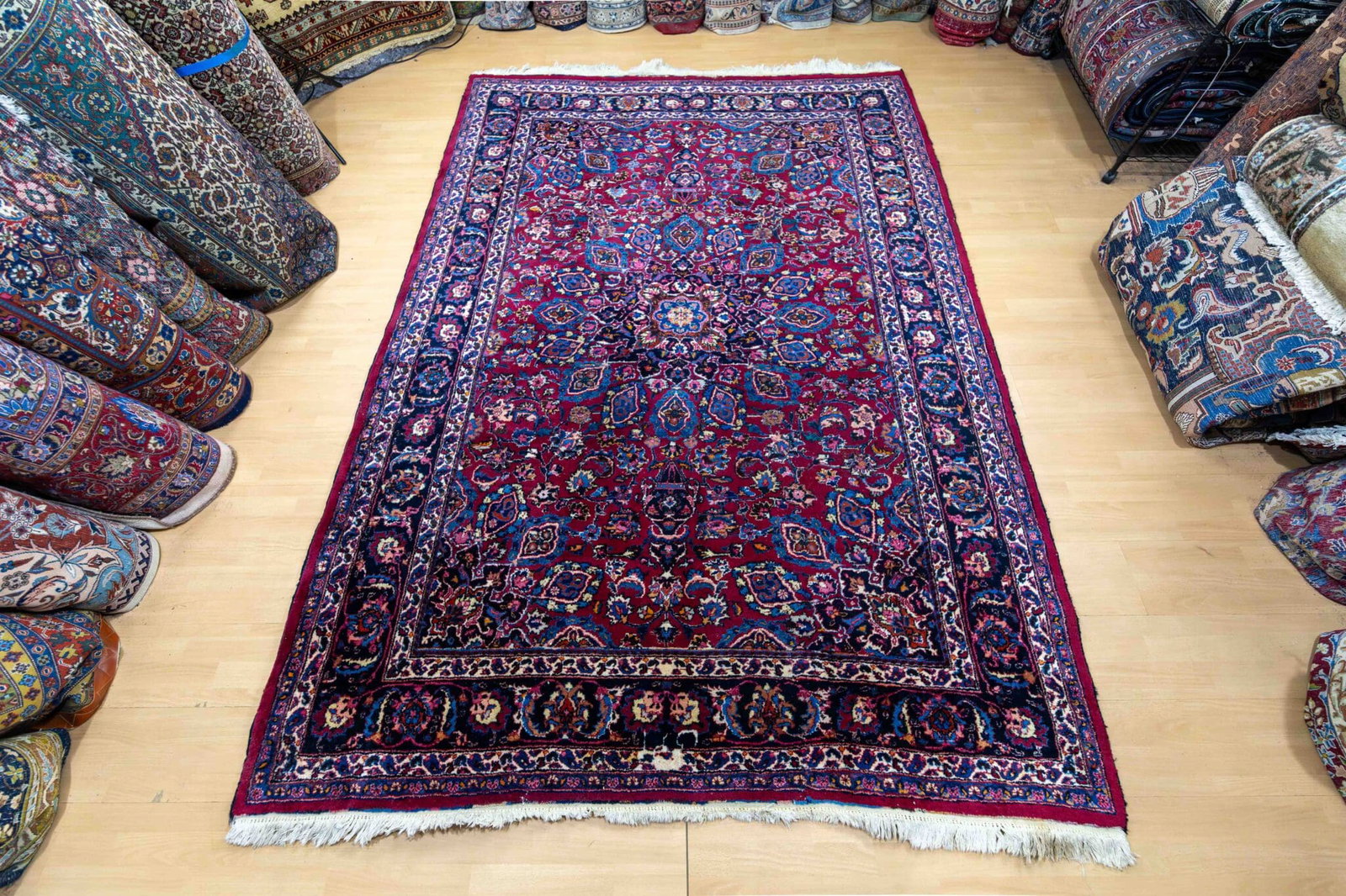 Der Teppich befindet sich in gebrauchtem, sehr gutem Zustand mit sichtbaren, altersbedingten Gebrauchsspuren, die seinen authentischen Charakter unterstreichen. Er wurde fachgerecht gewaschen, wodurch die Farben aufgefrischt und die Wollstruktur belebt wurden. Die Oberfläche ist gleichmäßig, das Muster klar erkennbar und insgesamt sehr gut erhalten.