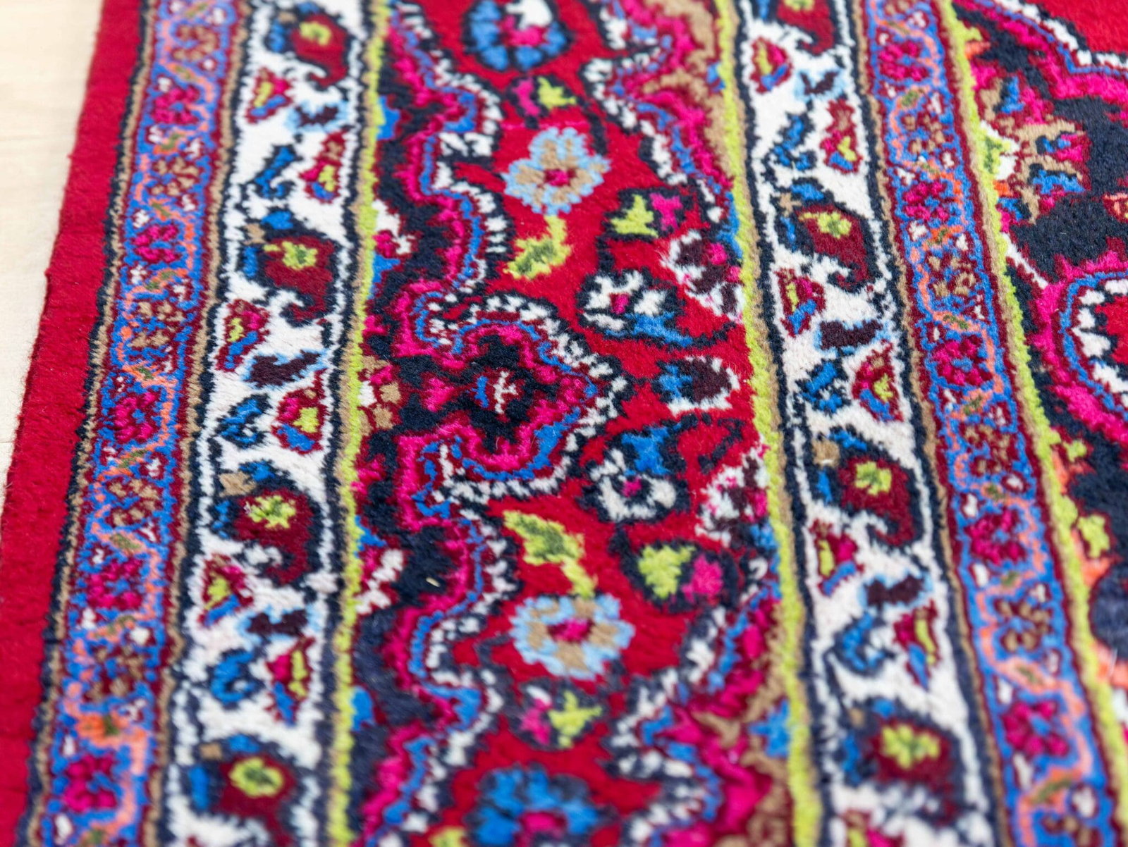Der Teppich befindet sich in gebrauchtem, sehr gutem Zustand und wurde fachgerecht gewaschen. Dadurch sind die Farben klar und frisch erhalten, die Oberfläche gleichmäßig und das Muster gut erkennbar. Leichte altersbedingte Spuren unterstreichen den authentischen Charakter dieses handgeknüpften Einzelstücks.