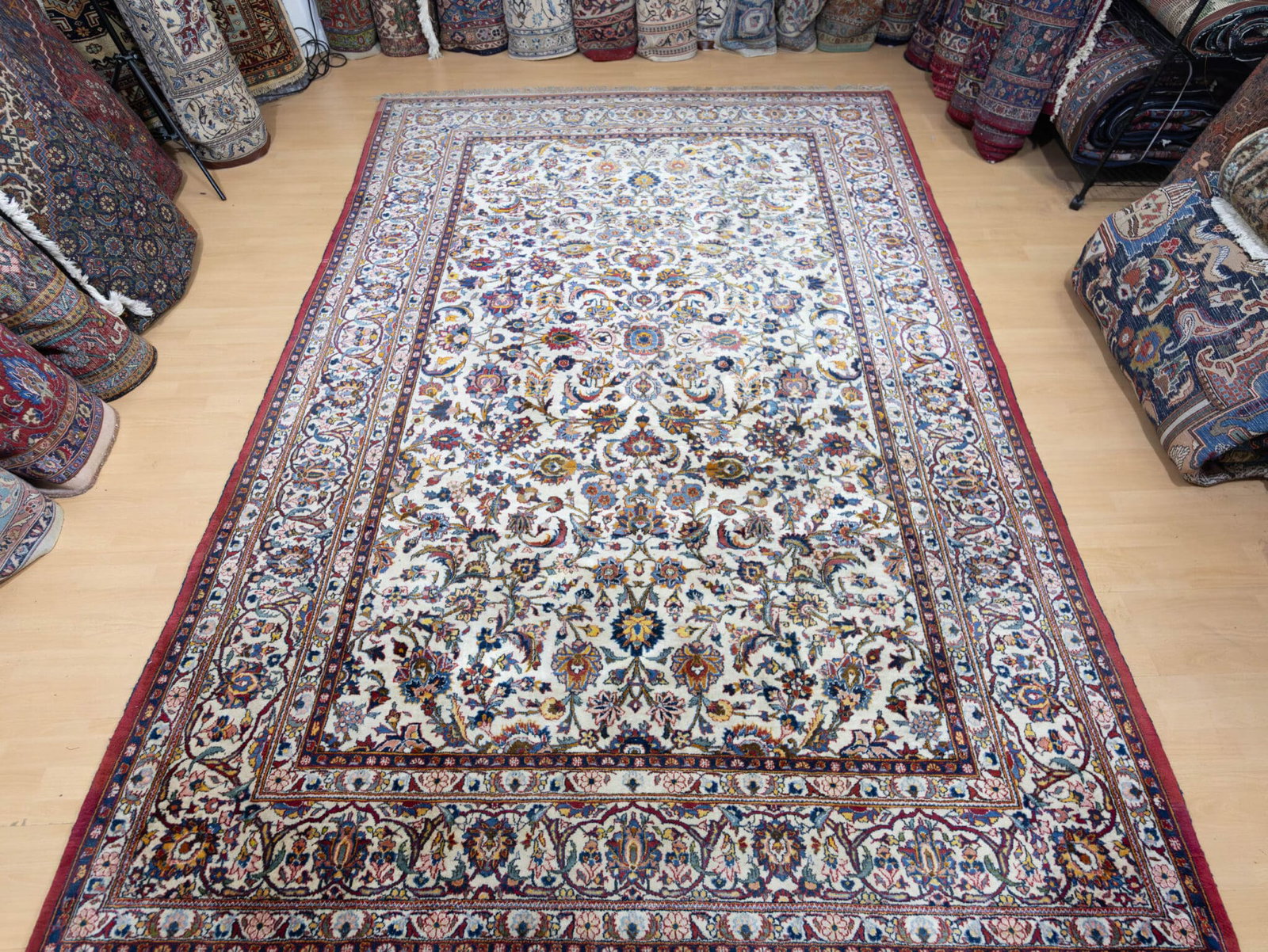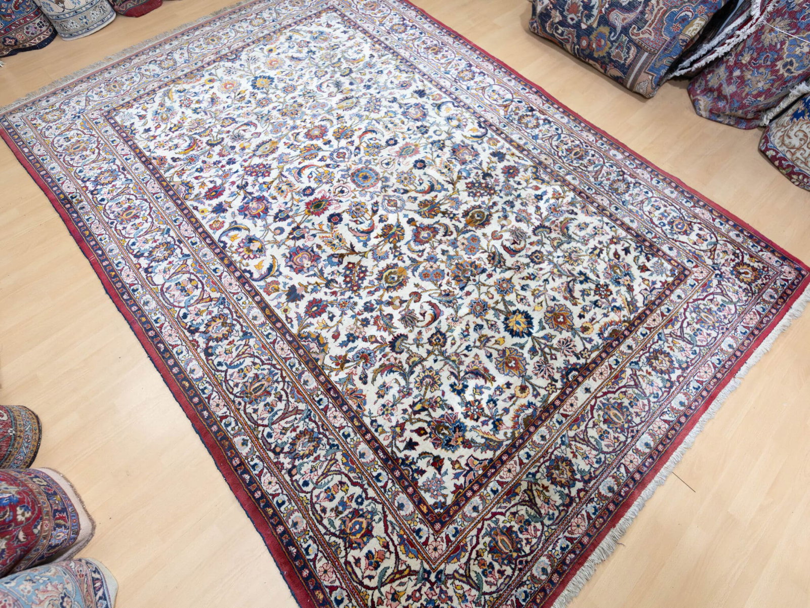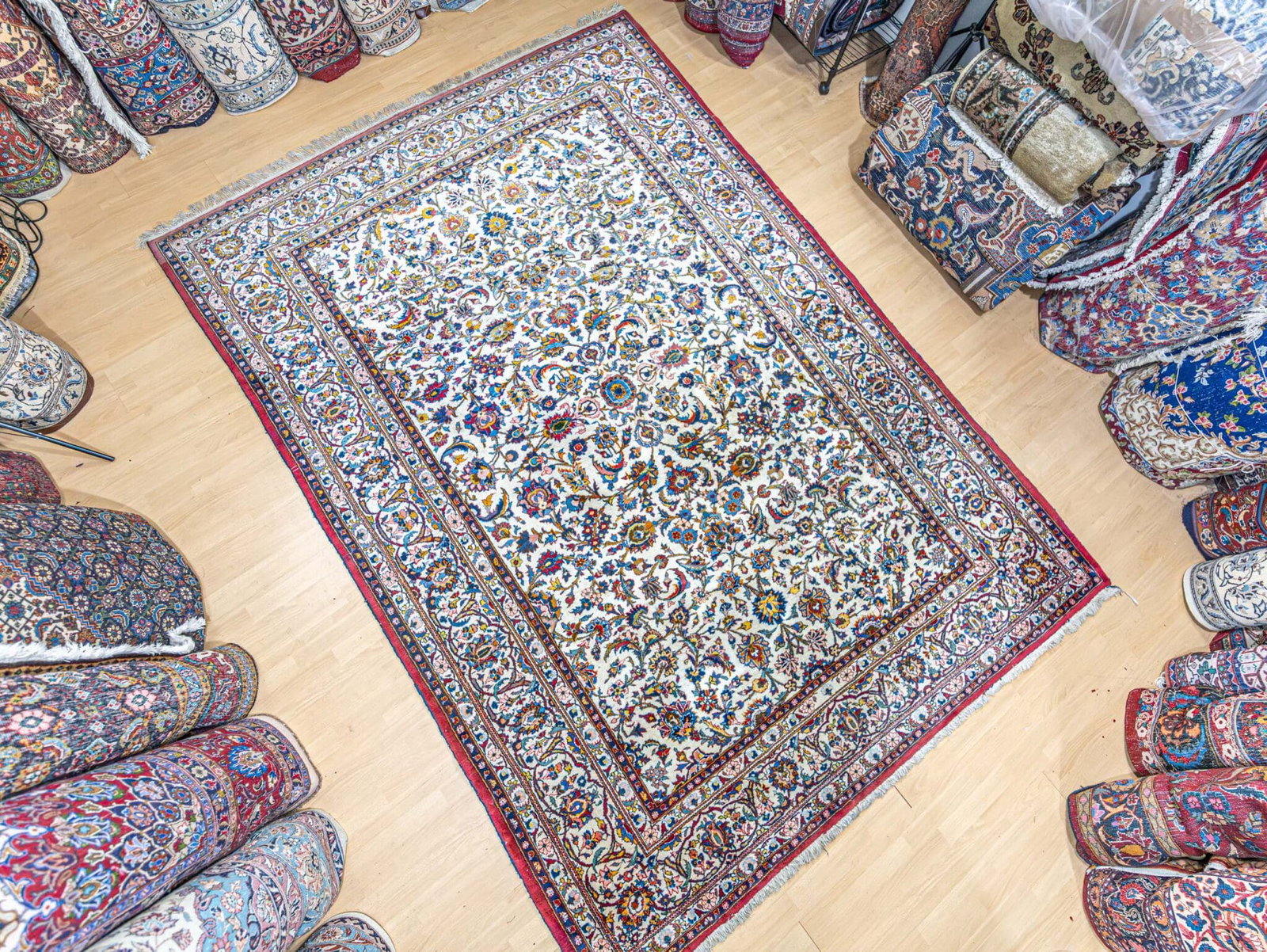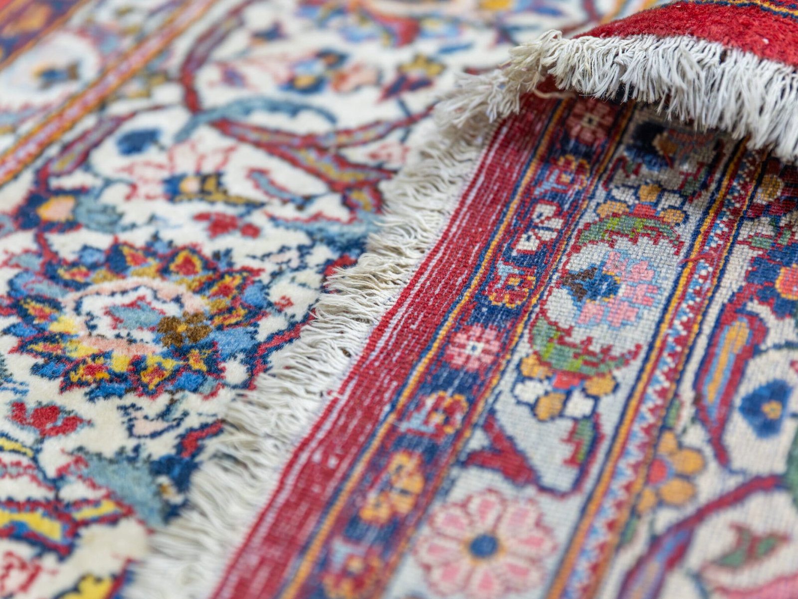 Die Kombination aus klassischer Kashan-Struktur und den selteneren Randdetails verleiht dem Teppich einen Hauch von Rarität innerhalb eines bekannten Motivs.