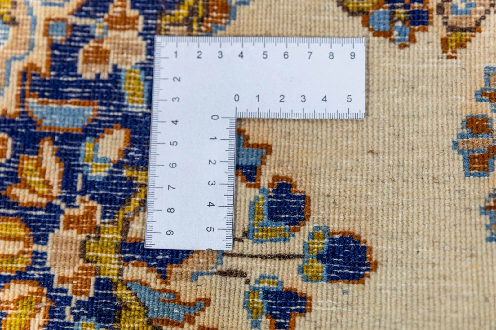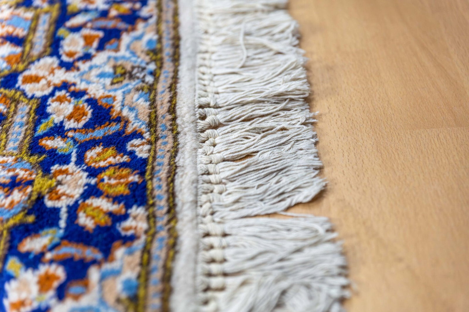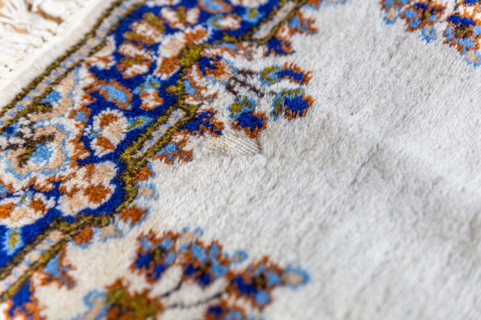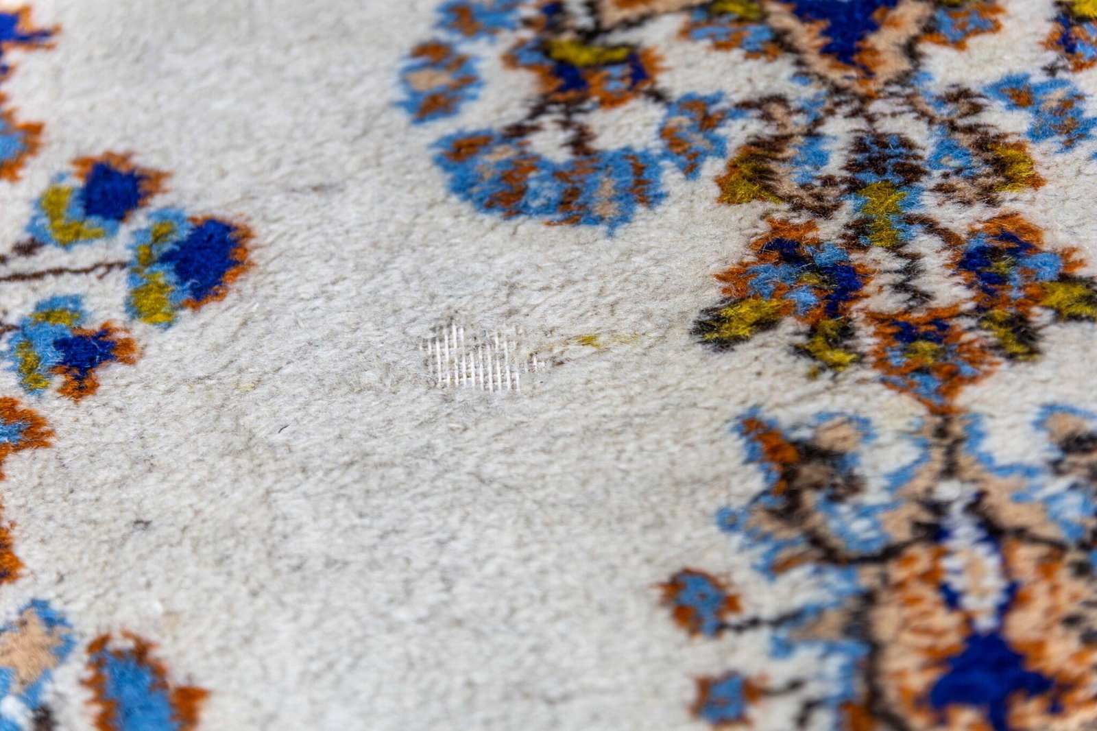 Der Teppich befindet sich in sehr gutem Zustand. Es gibt lediglich zwei kleine Stellen von etwa 2–3 cm, die auf den Produktbildern sichtbar sind.