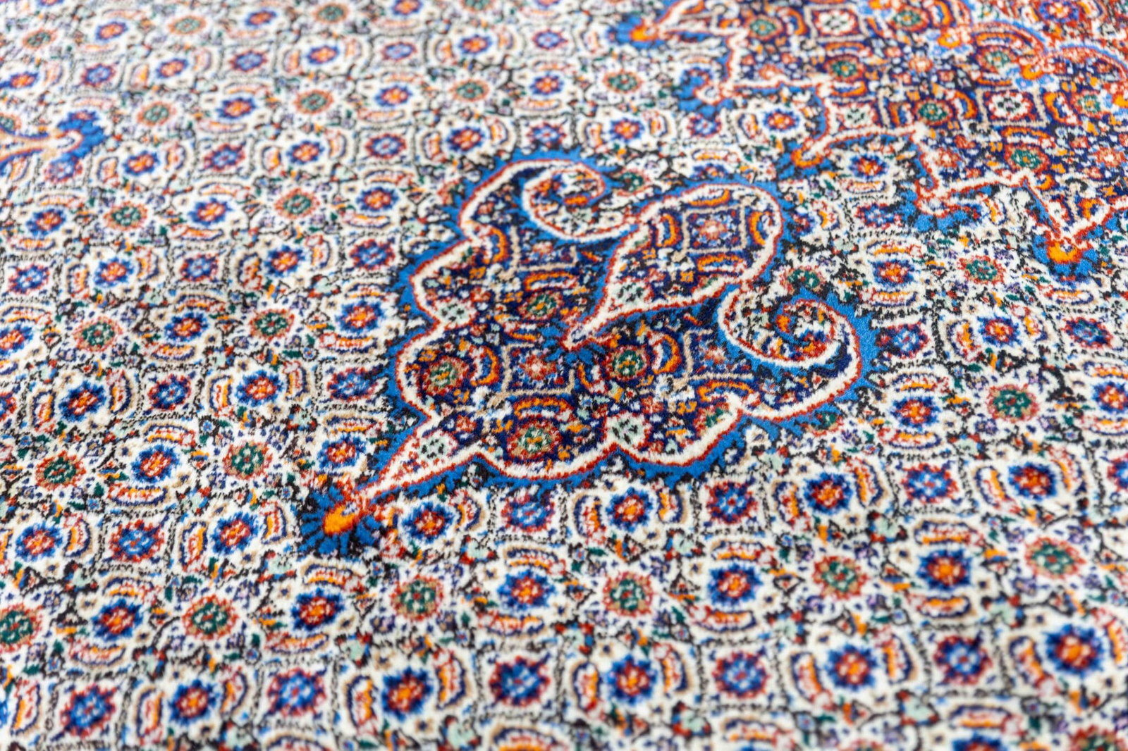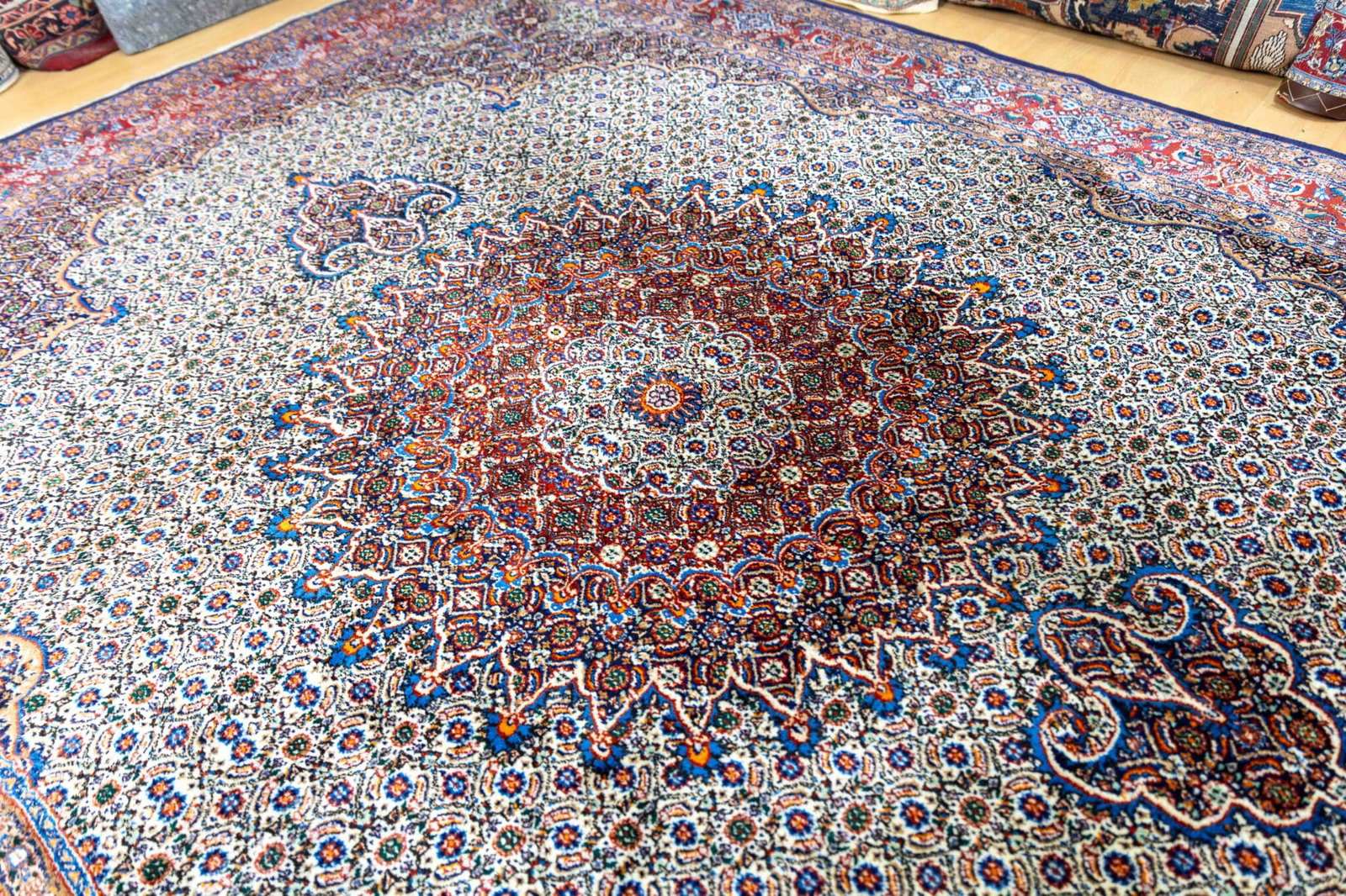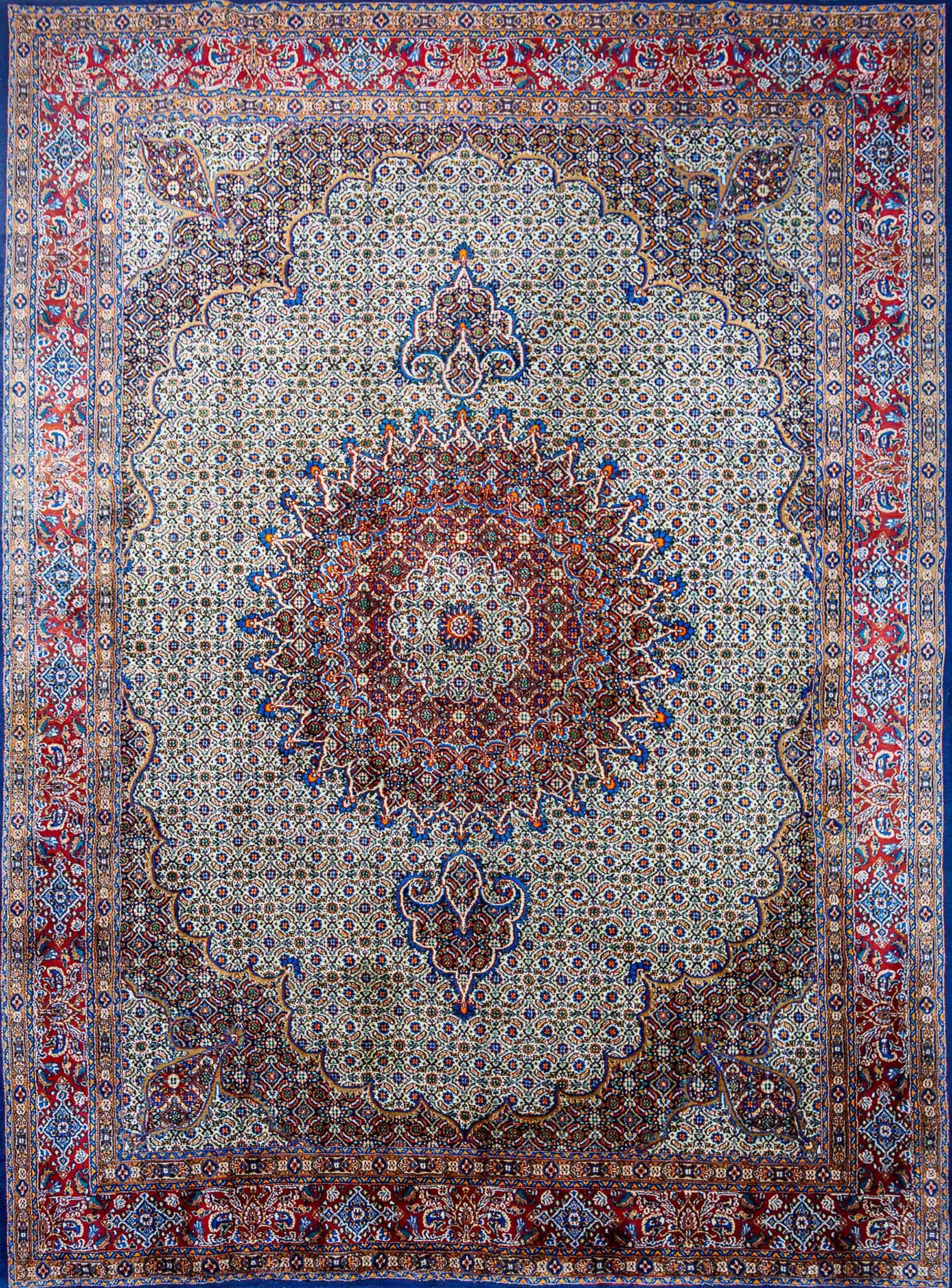 Moud-Teppiche sind traditionelle handgeknüpfte Perserteppiche aus der Region Moud im Iran. Sie sind bekannt für ihre feinen floralen Muster, die hohe Knotendichte und die elegante Gestaltung mit zentralem Medaillon.