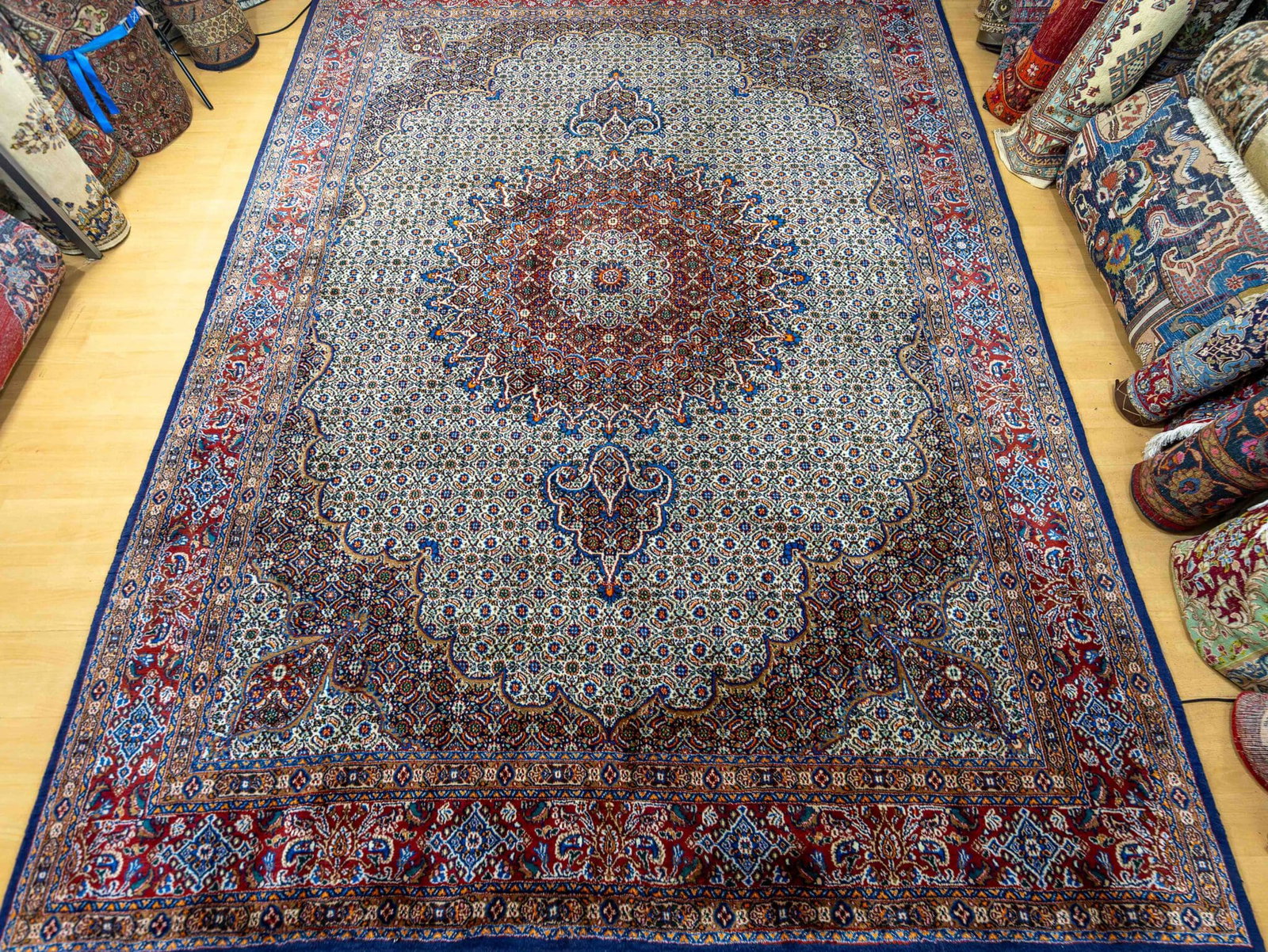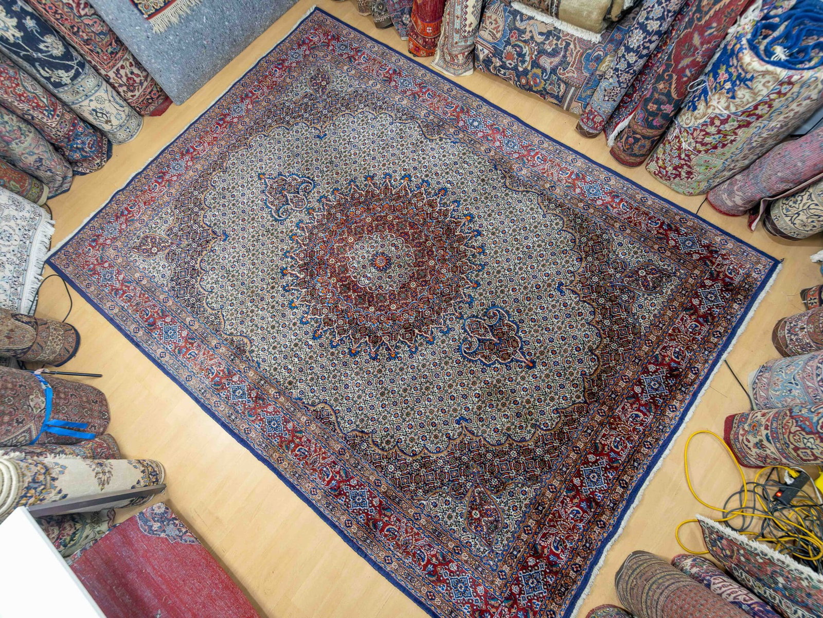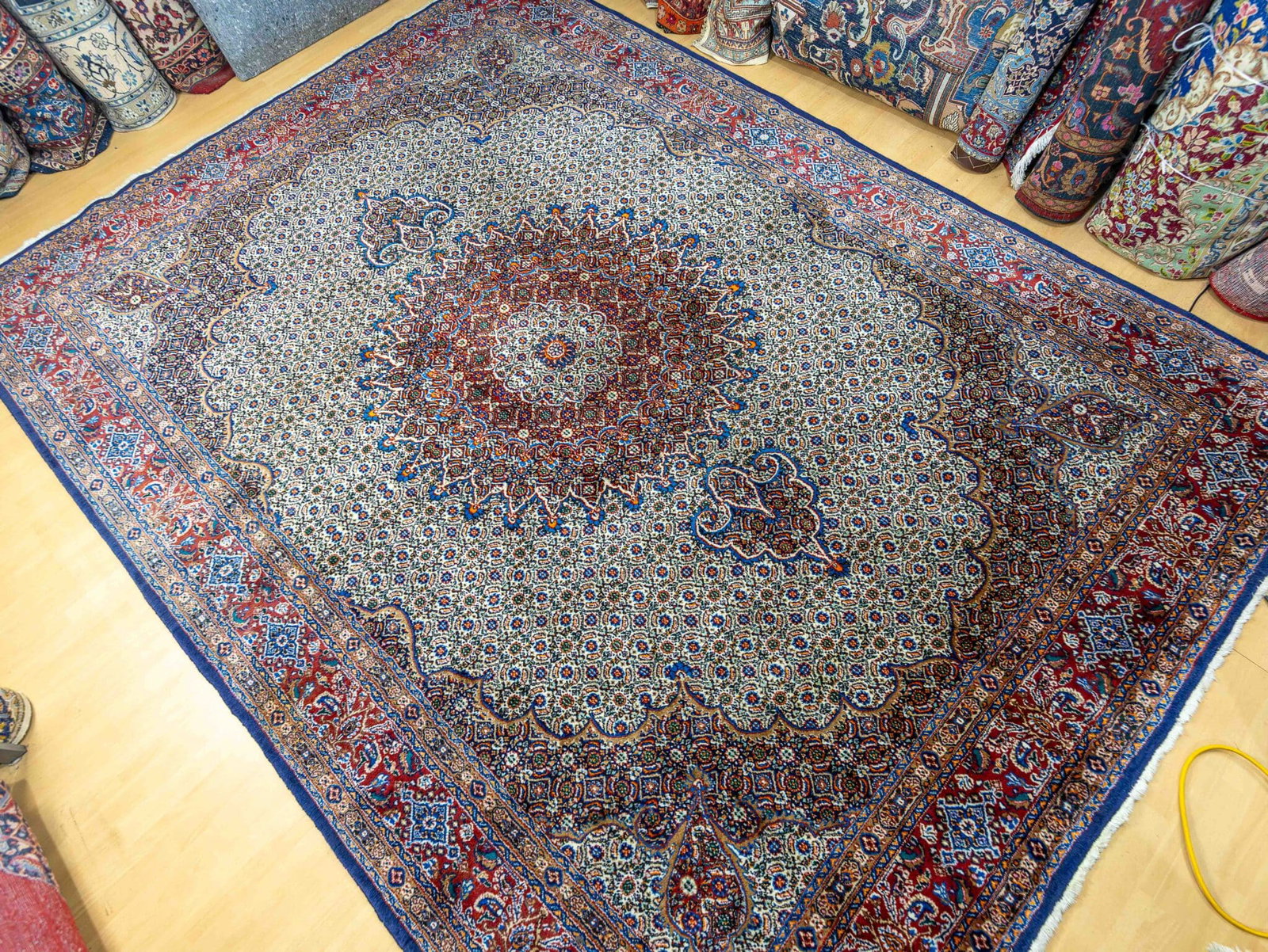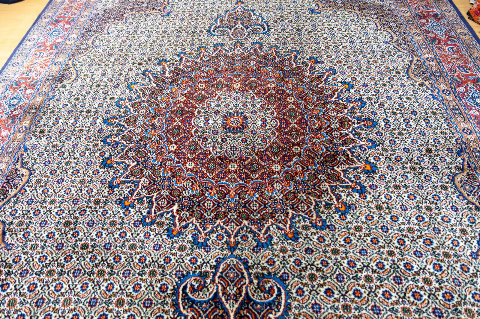 Moud-Teppiche sind traditionelle handgeknüpfte Perserteppiche aus der Region Moud im Iran. Sie sind bekannt für ihre feinen floralen Muster, die hohe Knotendichte und die elegante Gestaltung mit zentralem Medaillon.