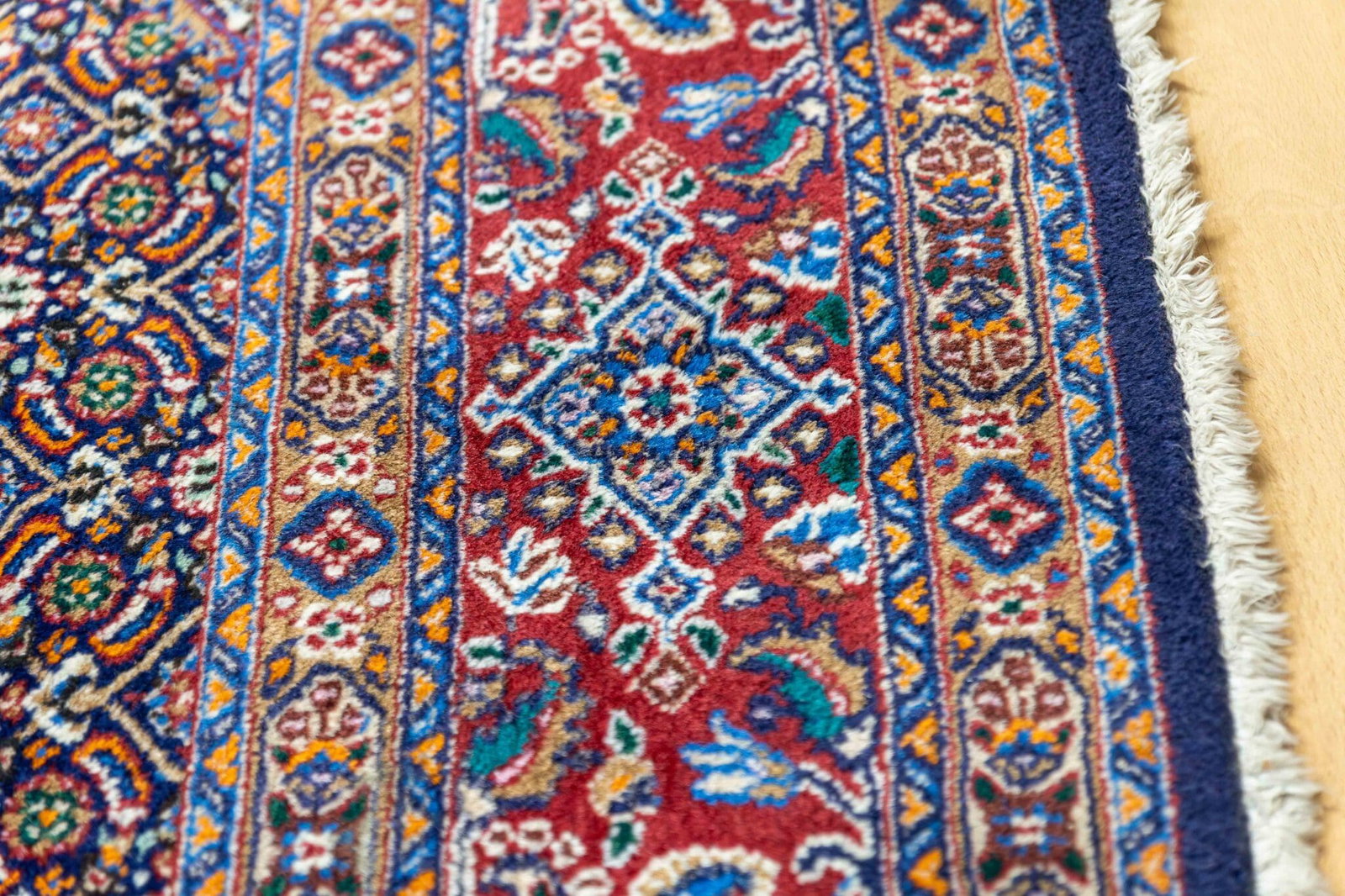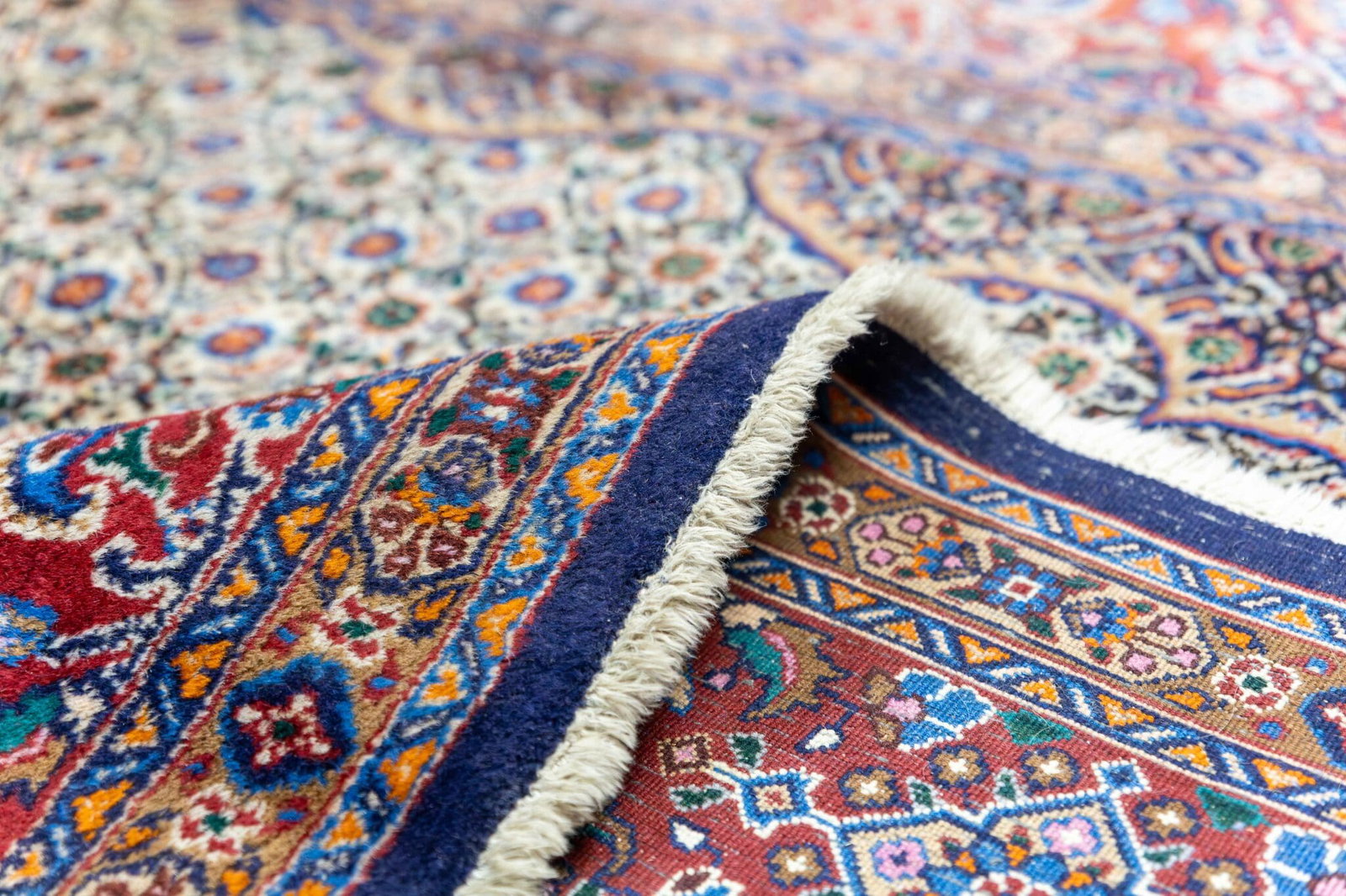 2556$Ursprünglicher Preis war: 2556$1132$Aktueller Preis ist: 1132$Handgeknüpfter Perserteppich Moud W1 (#471) | 341 x 250 cm | Sehr guter Zustand | Knotendichte: ca. 300.000 Knoten/m² | Klassisches persisches Design | Wolle auf Baumwolle | Gewaschen | Herkunft: Iran