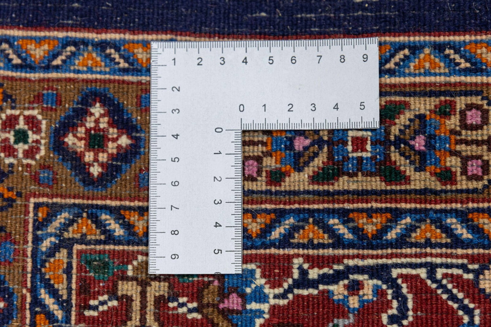 Dieser handgeknüpfte Perserteppich besteht aus hochwertiger Schurwolle auf einer stabilen Baumwollkette. Die Knotendichte beträgt ca. 300.000 Knoten pro Quadratmeter und ermöglicht eine besonders feine Darstellung der traditionellen Muster. Diese Knotendichte steht für hochwertige Handarbeit und sorgt gleichzeitig für eine langlebige und stabile Teppichstruktur.