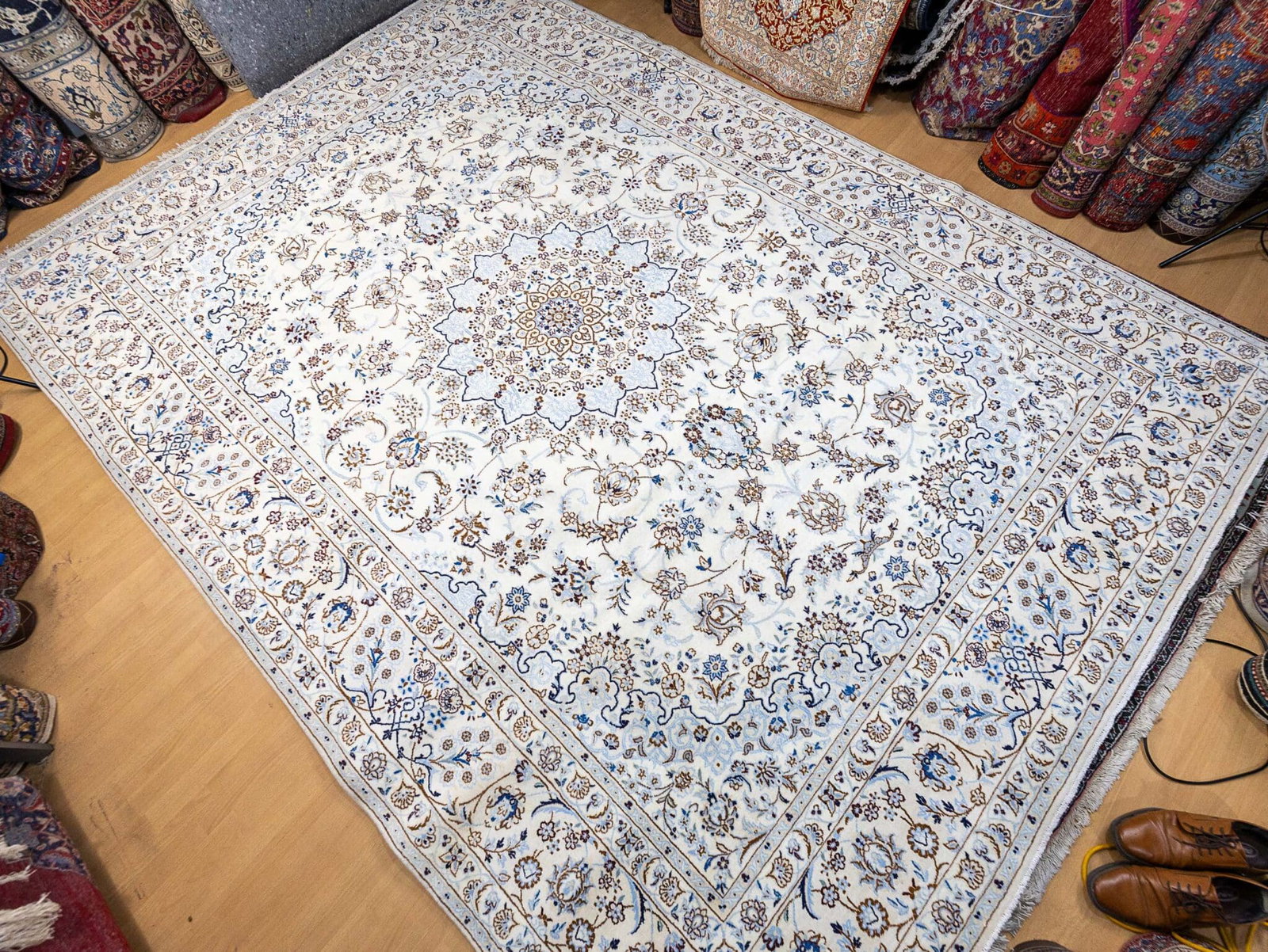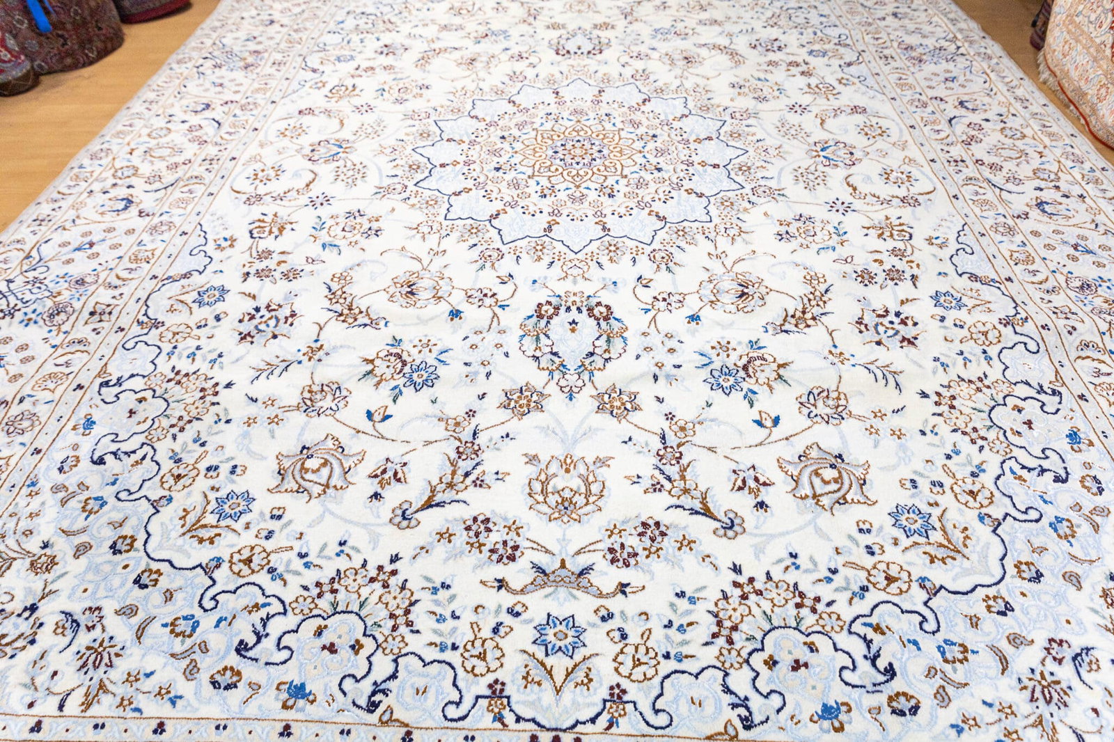Die Kombination aus traditioneller Handarbeit, feiner Knotendichte und edlen Materialien macht diesen Nain-Teppich zu einem hochwertigen Einzelstück. Durch seine Größe eignet er sich ideal für große Wohnräume oder repräsentative Bereiche.
