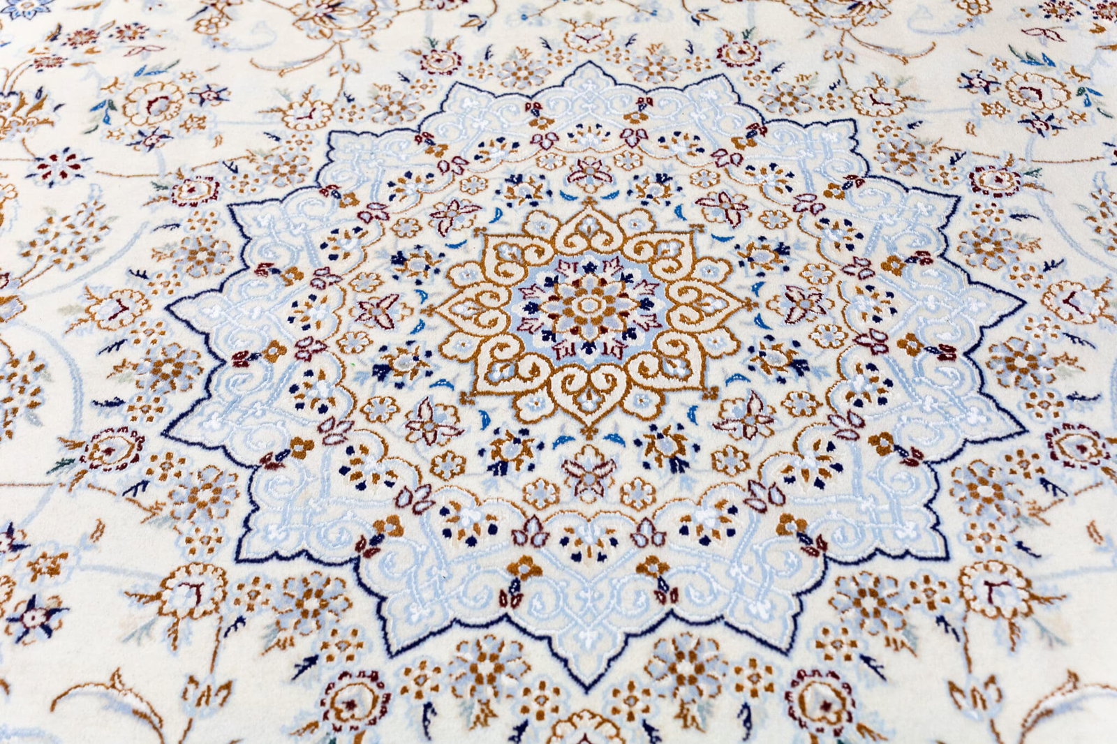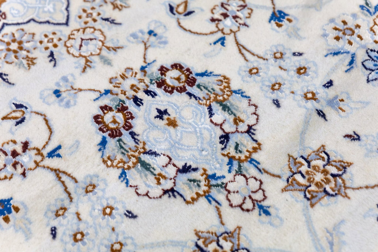 Dieser handgeknüpfte Perserteppich aus Nain besteht aus hochwertiger Wolle mit Seidenanteilen auf einer stabilen Baumwollkette. Die Knotendichte von ca. 300.000 Knoten pro Quadratmeter sorgt für eine feine und detailreiche Darstellung des Musters. Die Kombination aus Wolle und Seide verleiht dem Teppich sowohl Robustheit als auch einen eleganten Glanz.