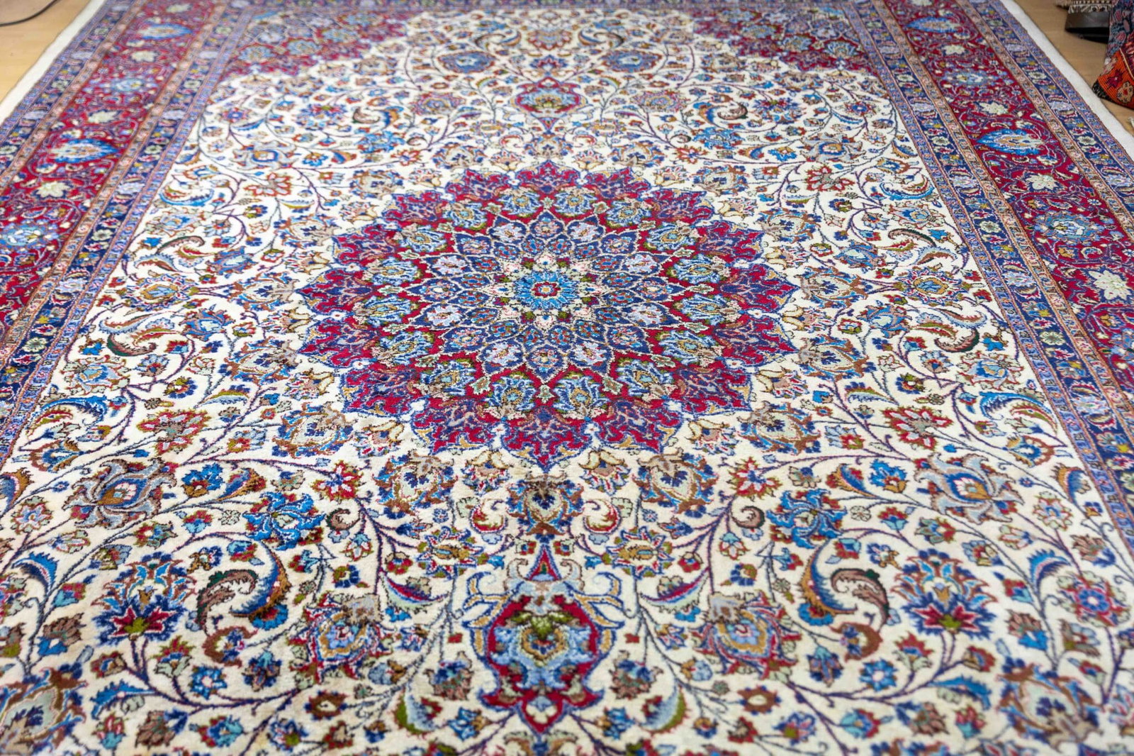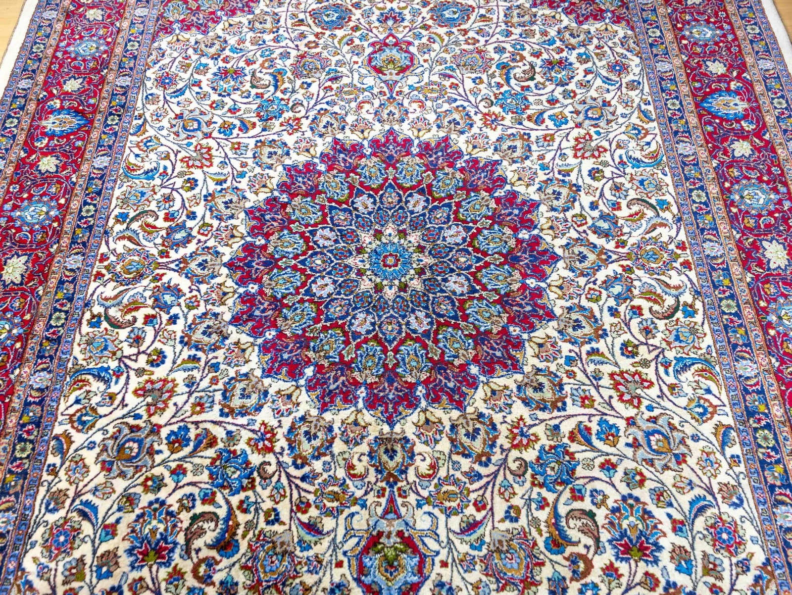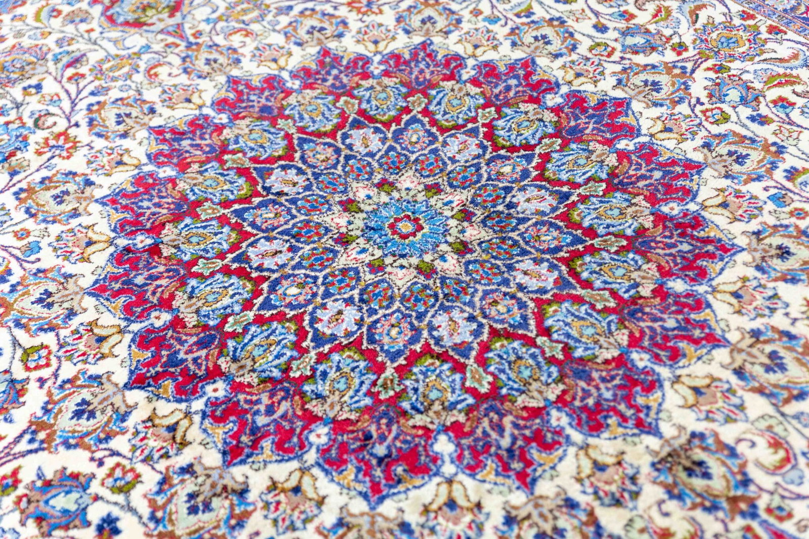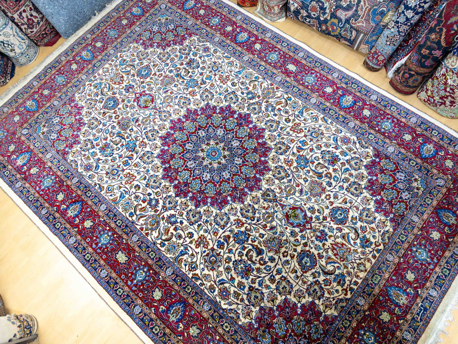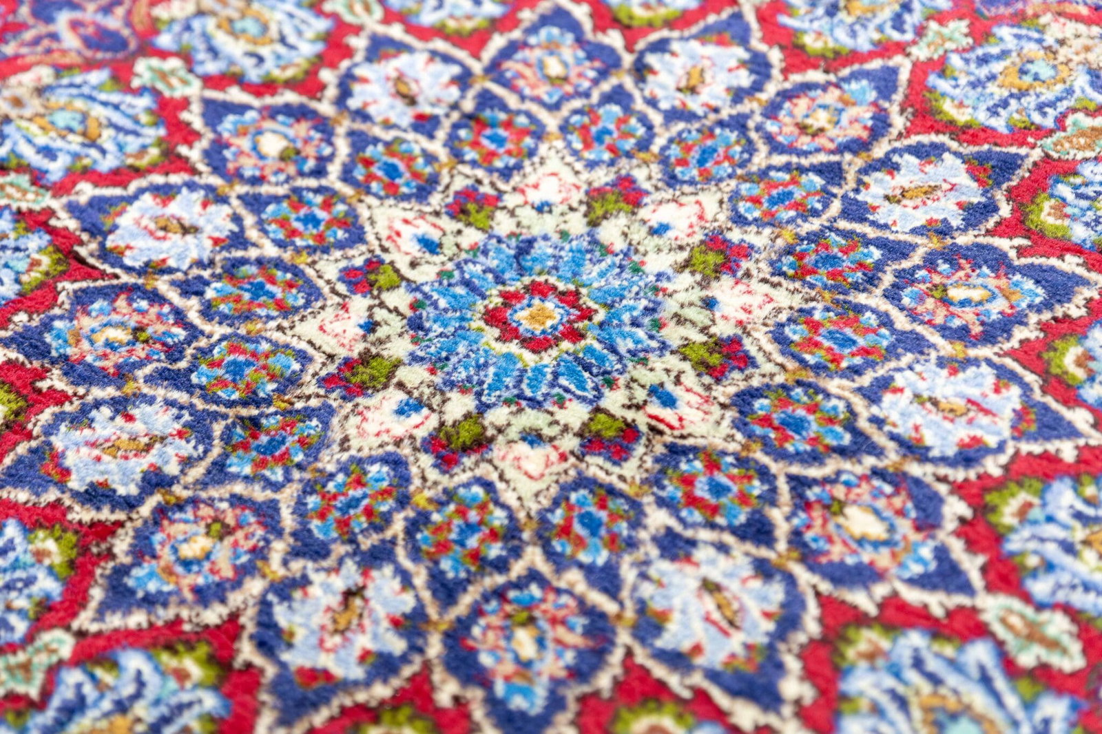Dieser Teppich zeigt das klassische und zeitlose Sheikh Safi Motiv, eines der bekanntesten Designs der persischen Teppichkunst. Das elegante zentrale Medaillon mit fein ausgearbeiteten Ornamenten und symmetrischen Elementen sorgt für eine besonders harmonische und repräsentative Wirkung. Dieses Design passt sowohl zu klassischen als auch zu modernen Einrichtungsstilen.