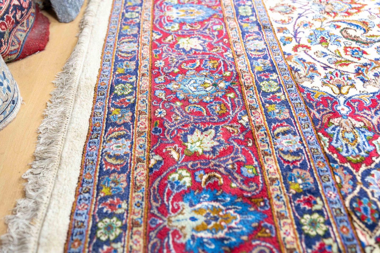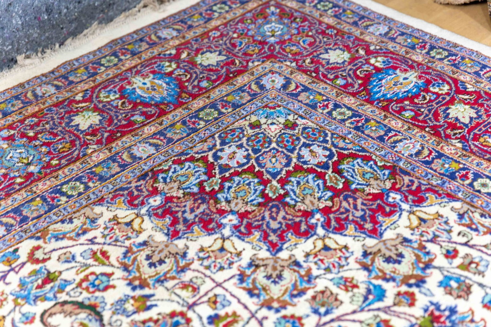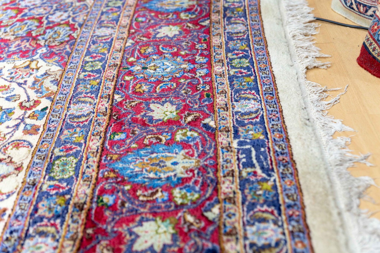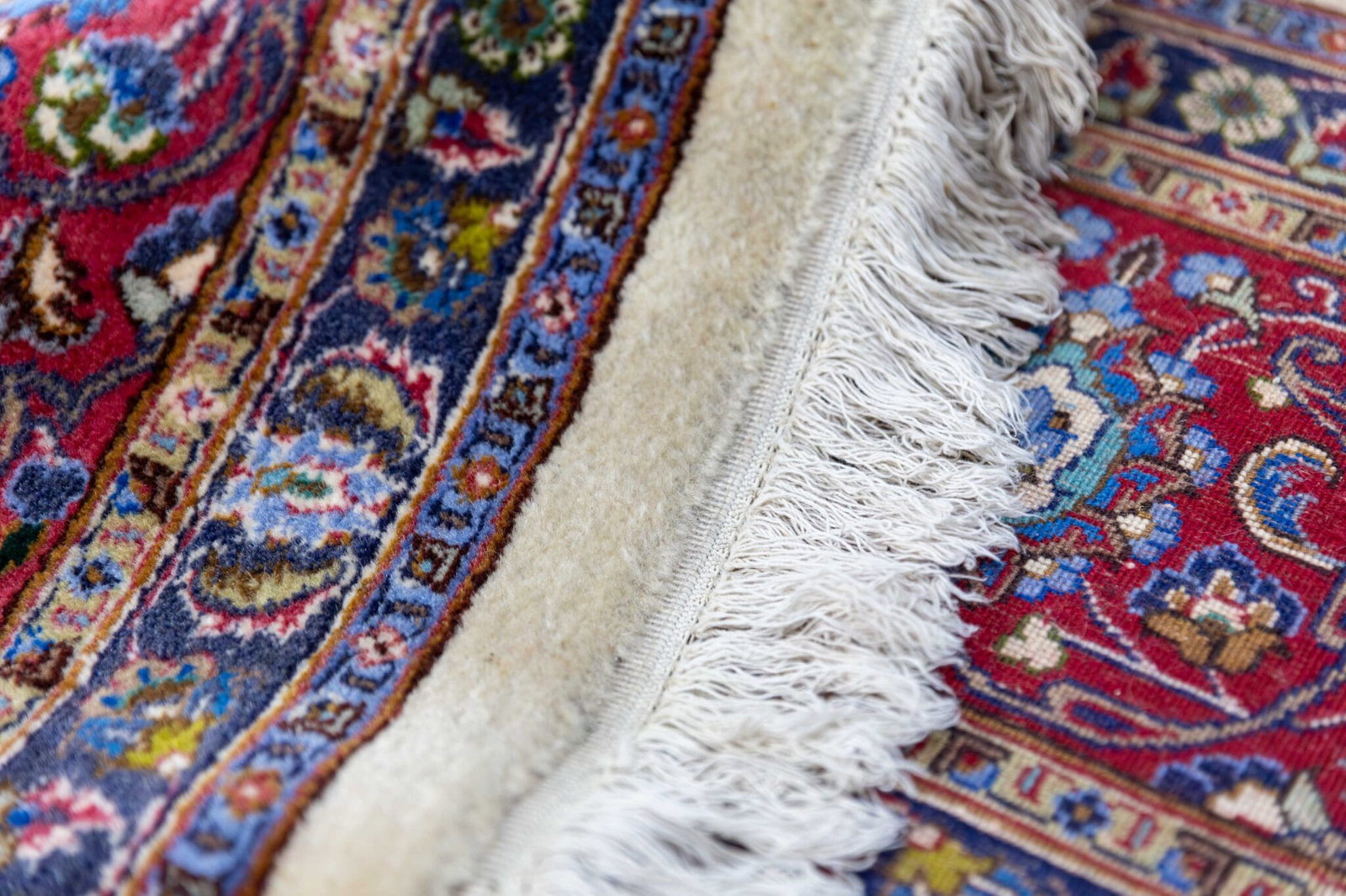 Der Teppich befindet sich insgesamt in sehr gutem Zustand. Es gibt jedoch kleinere Mängel an den Fransen sowie an einer Ecke des Teppichs (siehe Bilder). Diese können auf Wunsch fachgerecht restauriert werden.