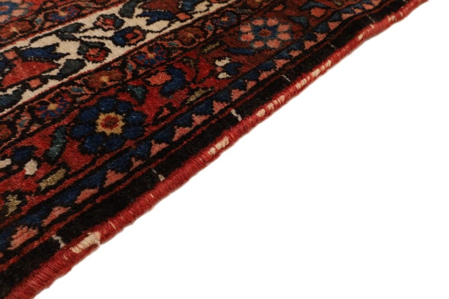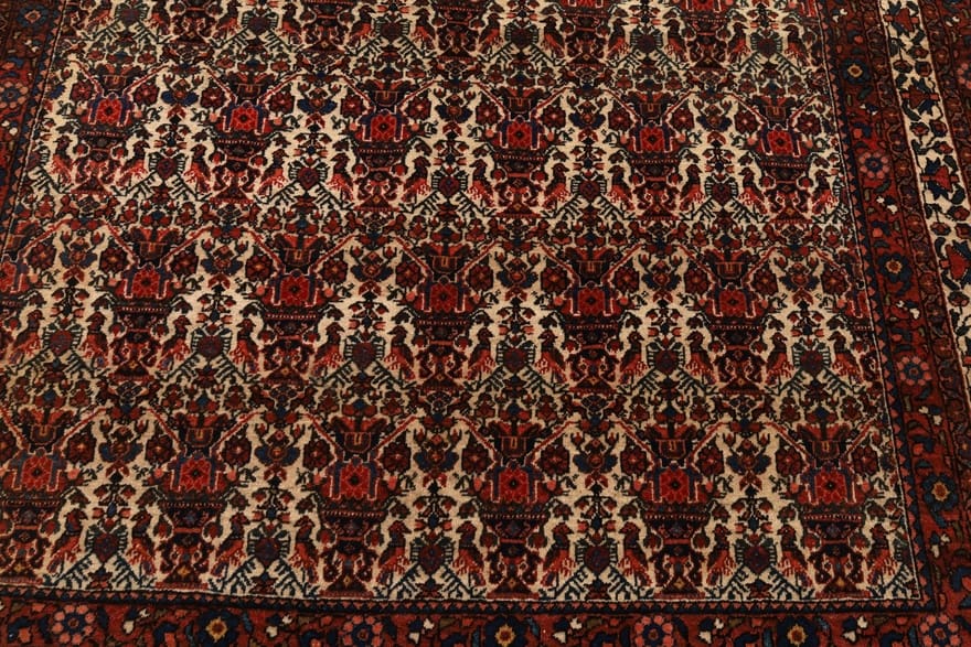 Handgewebter Abadeh-Teppich | Knotendichte: 160.000 – 200.000 Knoten/m² | Material: Wolle mit Baumwollkette | Größe: 202×131 cm | Ursprung: Iran/Persien | Alter: Antik | Farbe: Rot mit cremefarbenen Akzenten | Zustand: Sehr gut, regelmäßig gepflegt