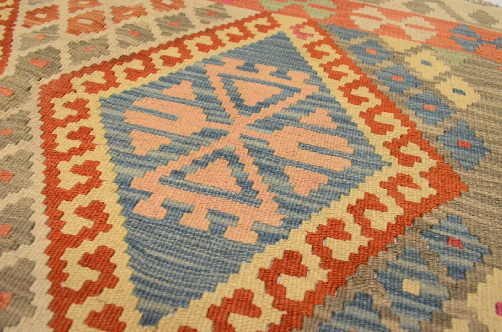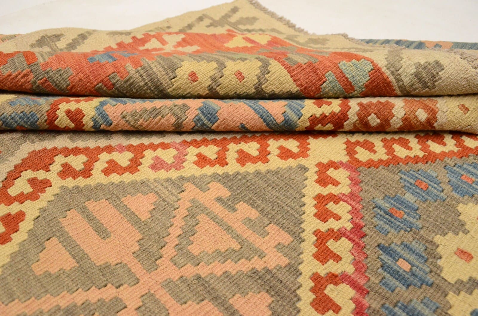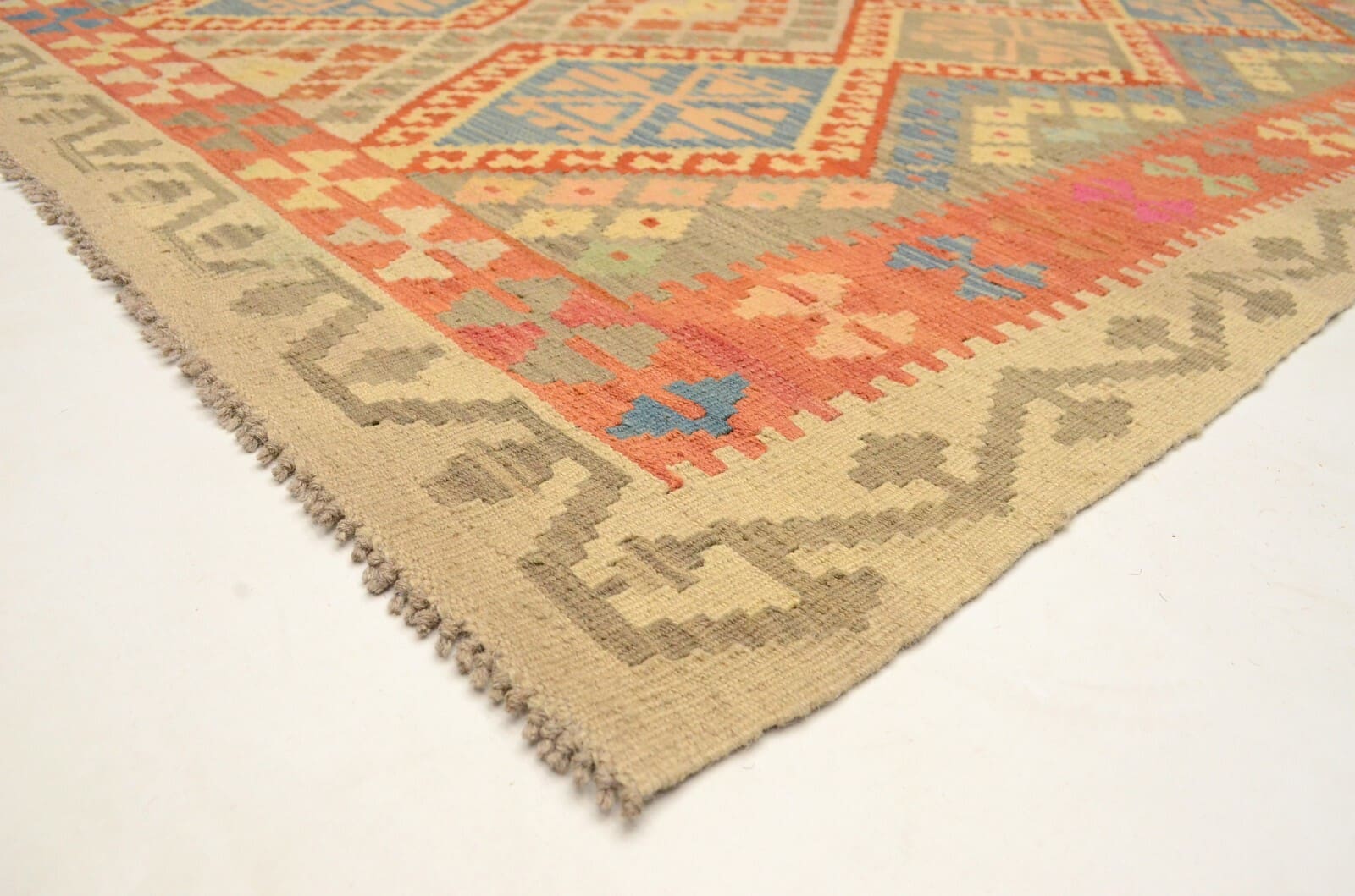 Handgewebter Afghan Kelim | Größe: 197 x 154 cm | Muster: Geometrisch in Pastellfarben | Material: 100% Schurwolle (handgesponnen, handgefärbt) | Zustand: Neu, perfekt | Herkunft: Afghanistan | Dicke: ca. 4 mm | Gewicht: ca. 2 kg/m² | Besonderheiten: Für Fußbodenheizung geeignet