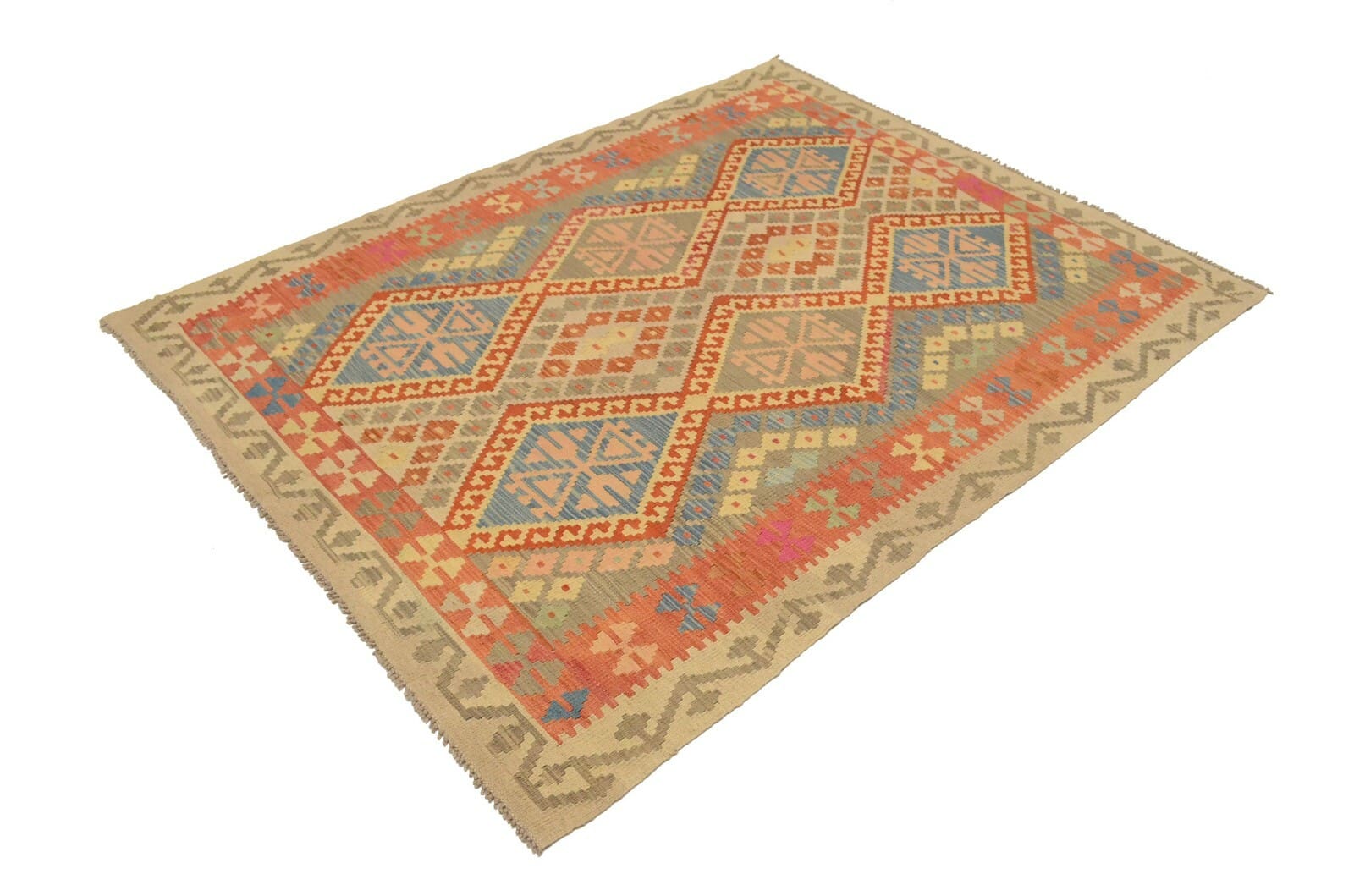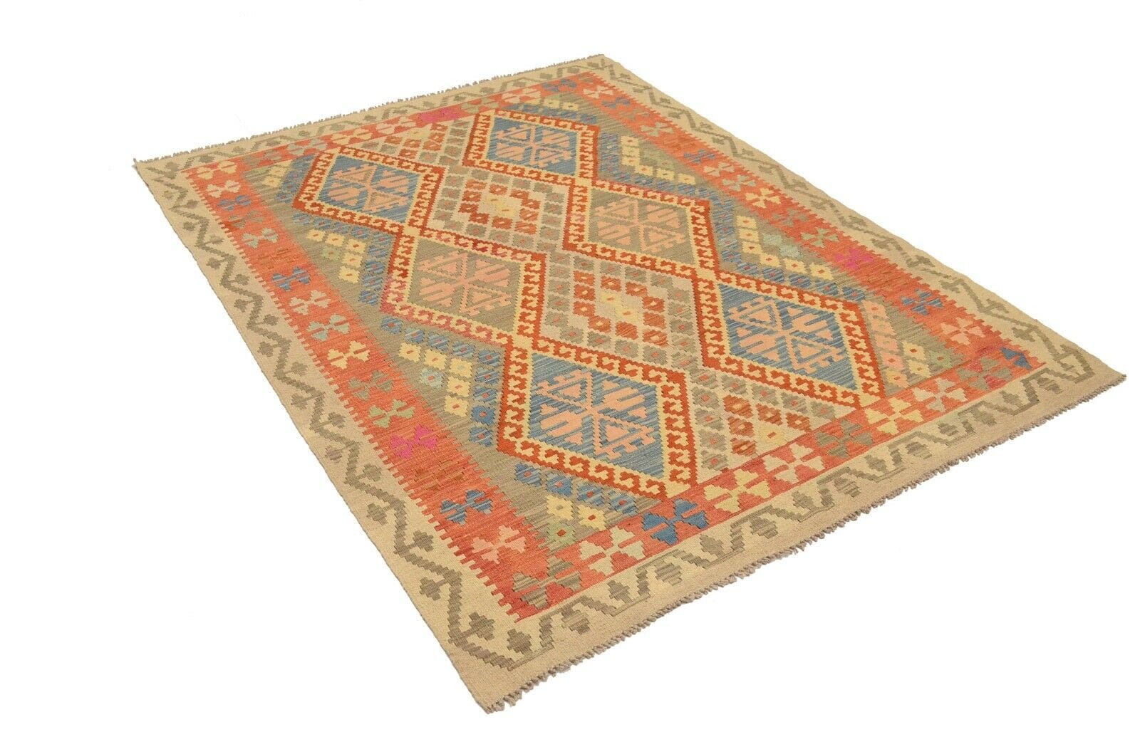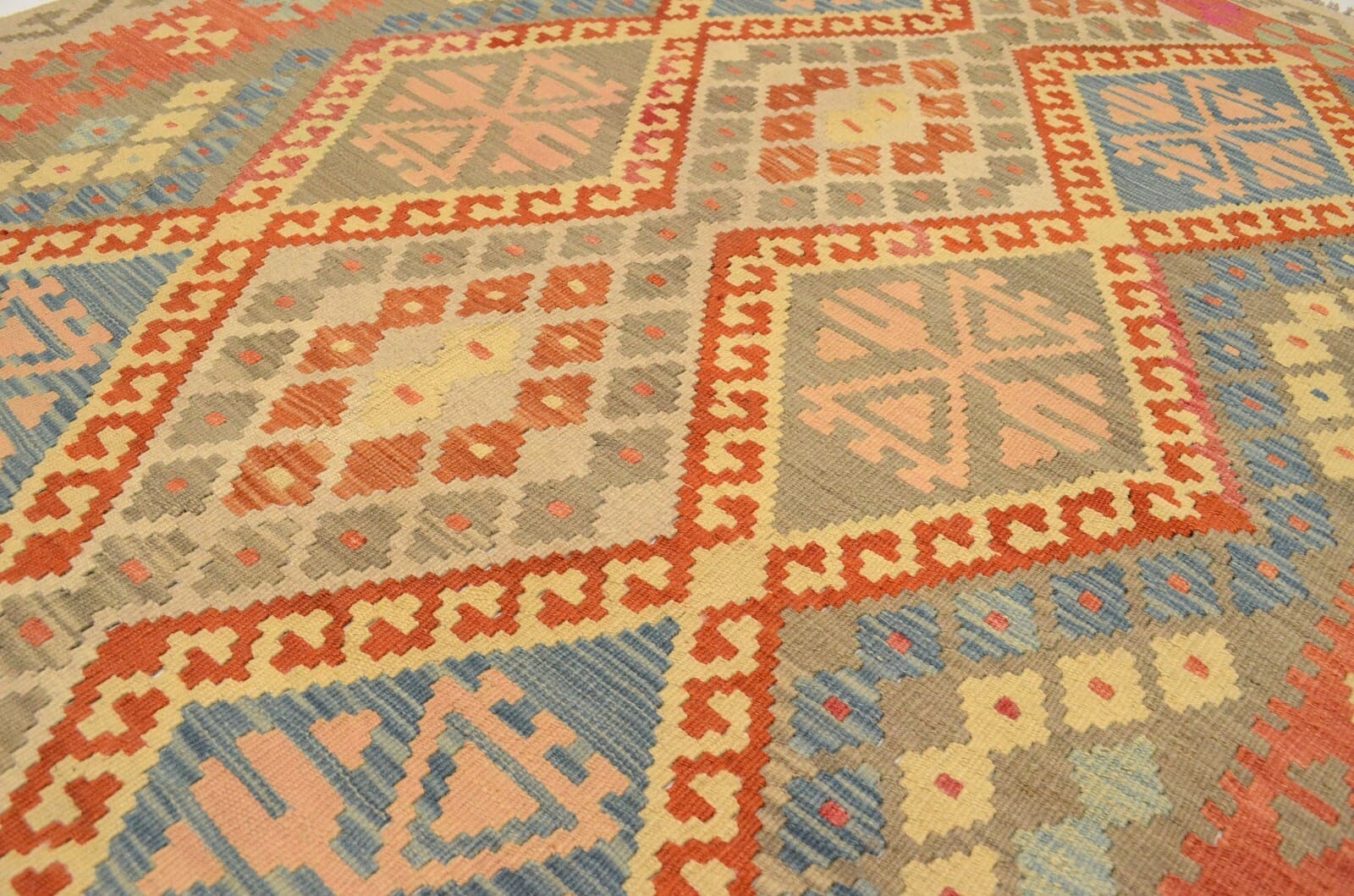 Handgewebter Afghan Kelim | Größe: 197 x 154 cm | Muster: Geometrisch in Pastellfarben | Material: 100% Schurwolle (handgesponnen, handgefärbt) | Zustand: Neu, perfekt | Herkunft: Afghanistan | Dicke: ca. 4 mm | Gewicht: ca. 2 kg/m² | Besonderheiten: Für Fußbodenheizung geeignet