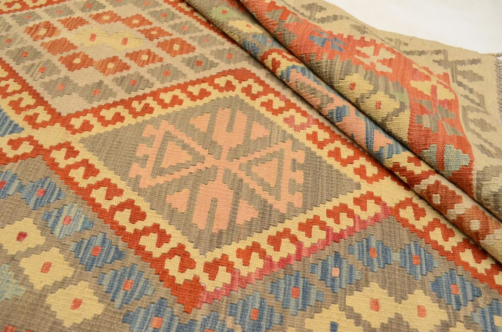 Das geometrische Muster des Afghan Kelim ist in sanften Pastellfarben gehalten, die harmonisch miteinander in Verbindung stehen und das Design lebendig wirken lassen. Solche Muster sind oft ein Ausdruck der kulturellen Identität und können verschiedene Bedeutungen haben – von symbolischen Darstellungen bis hin zu reinen ästhetischen Aspekten. Die Verwendung geometrischer Formen ist ein charakteristisches Merkmal vieler orientalischer Teppiche, die den Wunsch nach Ordnung und Struktur in der Natur widerspiegeln.
