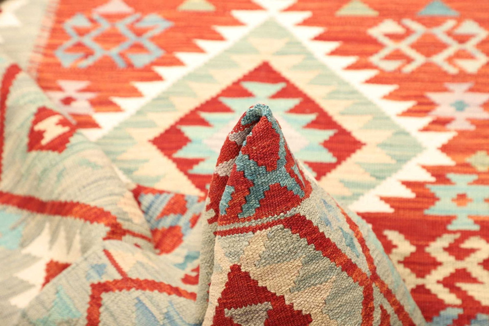 Geometrische Muster sind eines der markantesten Merkmale dieses afghanischen Kelims. Sie spiegeln die kulturellen Einflüsse und das Erbe der Region wider, und jedes Muster hat seine eigene Bedeutung. Diese Teppiche können in verschiedenen Farben und Designs erhältlich sein, aber der geometrische Stil verleiht jedem Raum eine moderne und dennoch traditionelle Note. Die Vielfalt an Symmetrie und formalen Elementen sorgt für einen spannenden Blickfang, der sowohl in minimalistischen als auch in klassischen Einrichtungsstilen hervorragend zur Geltung kommt.