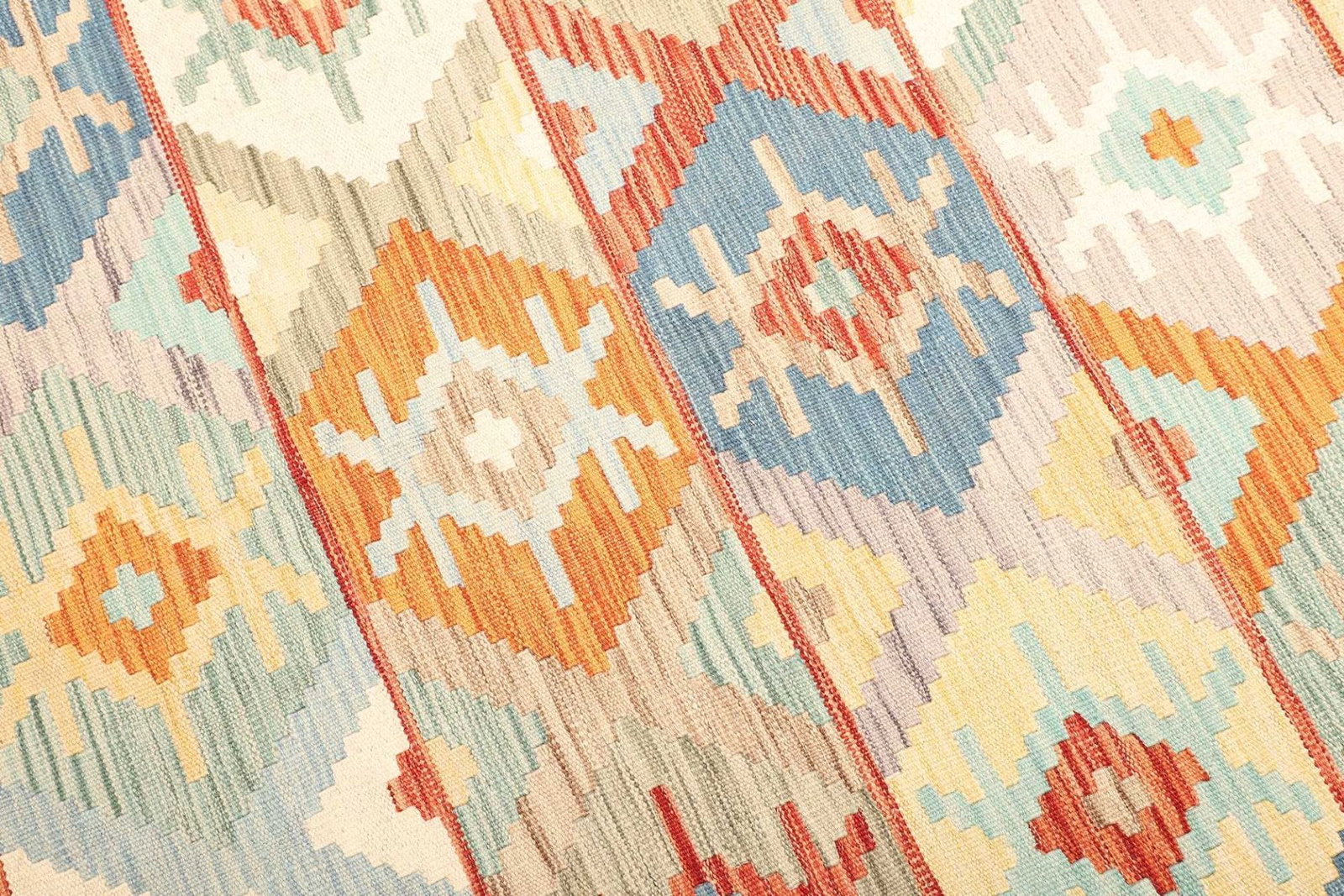 Bei diesem speziellen Kelim stehen geometrische Muster im Mittelpunkt des Designs. Solche Muster sind typisch für afghanische Teppiche und spiegeln oft die Ästhetik und das Weltbild der Völker in dieser Region wider. Die klaren Linien und kräftigen Farben sorgen für einen auffälligen Effekt, der sowohl modern als auch traditionell wahrgenommen wird. Ob als Teppich in Ihrem Wohnzimmer, als Wandbehang oder Dekorationselement, dieser Kelim wird sicherlich alle Blicke auf sich ziehen.