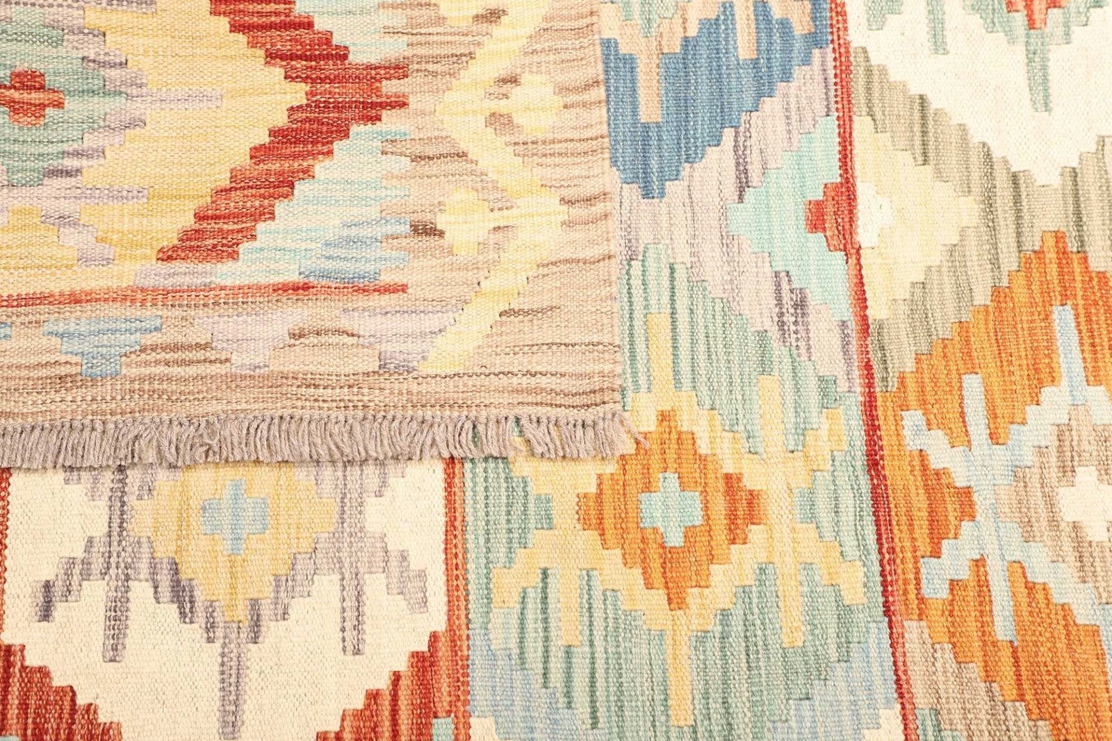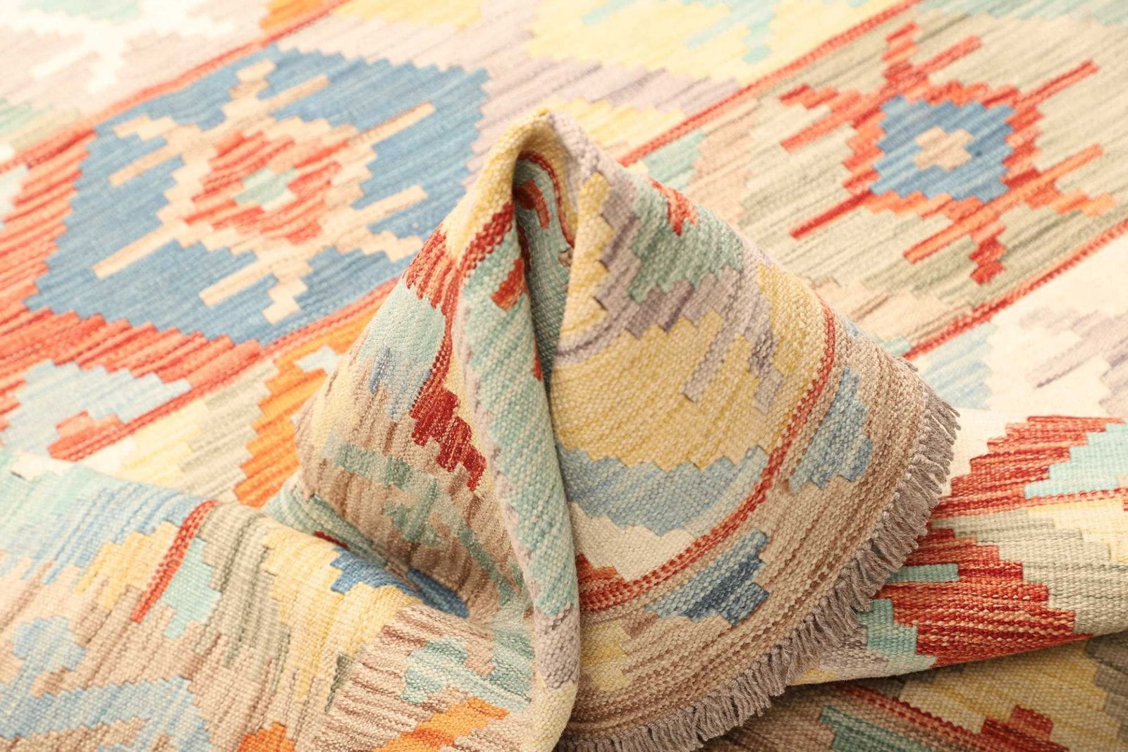 Ein weiterer einzigartiger Aspekt dieses afghanischen Kelims ist seine Vielseitigkeit. Er kann nicht nur als Bodenbelag verwendet werden, sondern auch als Wanddekoration oder Überwurf auf Möbeln. Die Kombination aus Funktionalität und Kunstfertigkeit macht ihn zu einer ausgezeichneten Wahl für jeden Raum. Zudem ist jeder Kelim ein handgefertigtes Unikat, was bedeutet, dass es keine zwei identischen Teppiche gibt. Diese Individualität macht solch einen Teppich zu einem ganz besonderen Element in Ihrem Zuhause.