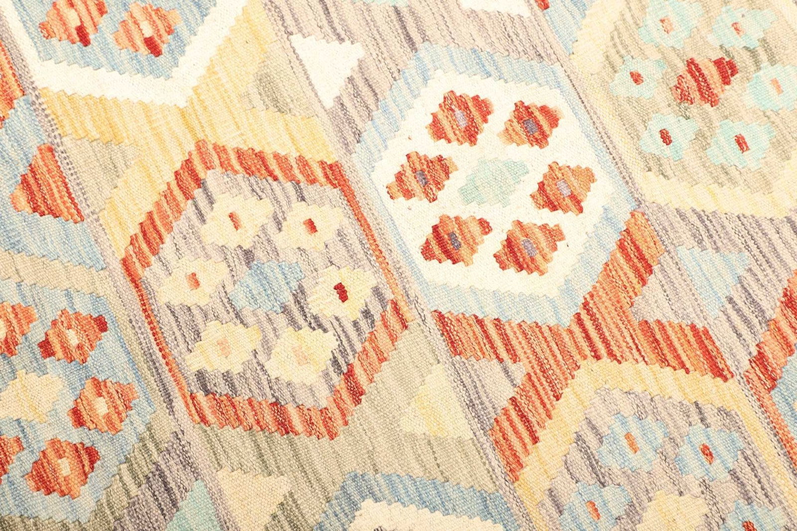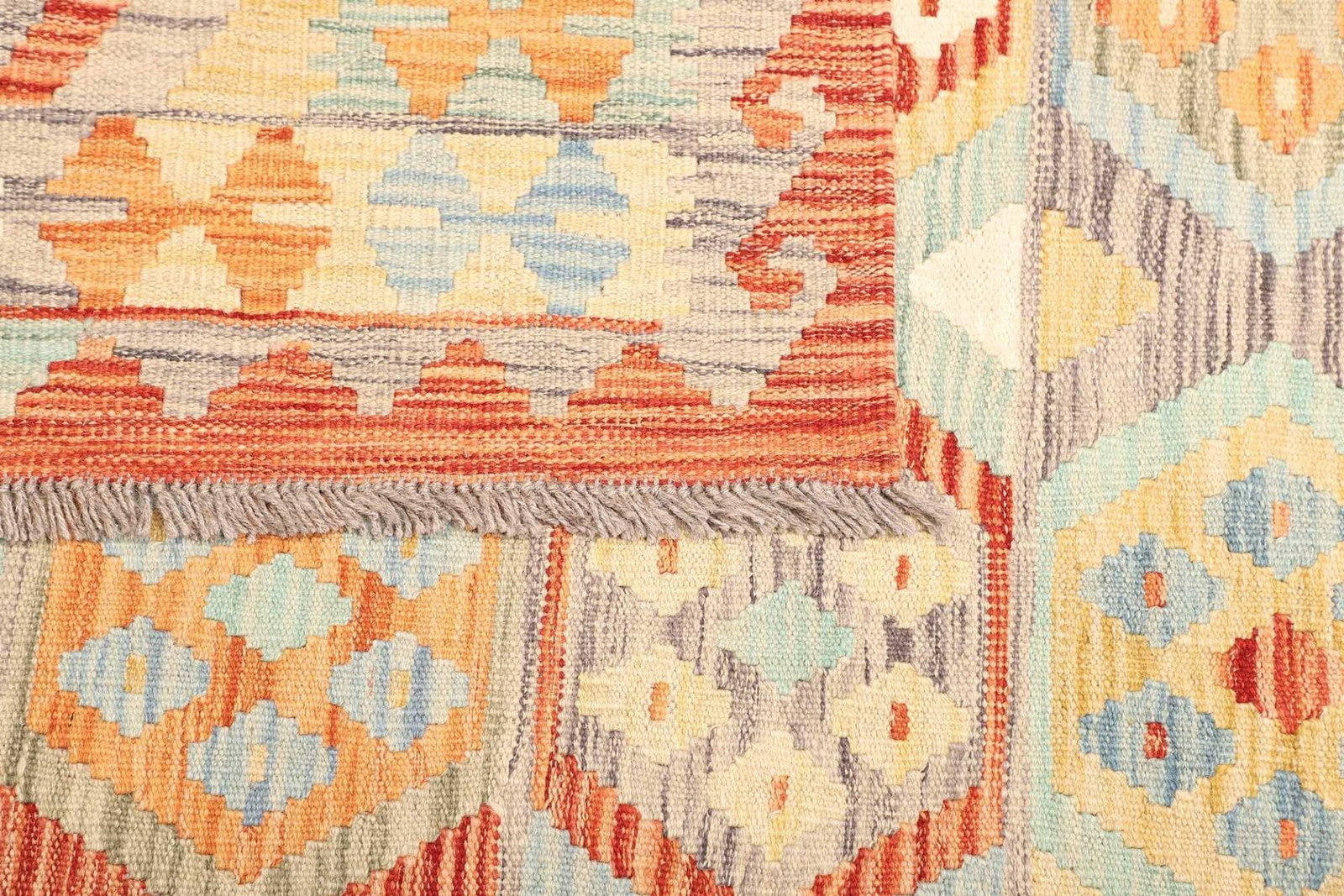 Der Afghanische Kelim wird aus hochwertigen natürlichen Materialien wie Wolle gefertigt, die für ihre Strapazierfähigkeit und Weichheit bekannt ist. Das handgewebte Verfahren sorgt dafür, dass jeder Teppich ein Unikat ist, der die Liebe und Hingabe der Kunsthandwerker widerspiegelt. Die Knotendichte spielt eine entscheidende Rolle in der Langlebigkeit und dem Komfort des Teppichs. Während Kelime in der Regel eine niedrigere Knotendichte als handgeknüpfte Teppiche aufweisen, bietet dieser Teppich dennoch hohe Strapazierfähigkeit und eine ansprechende Oberfläche.