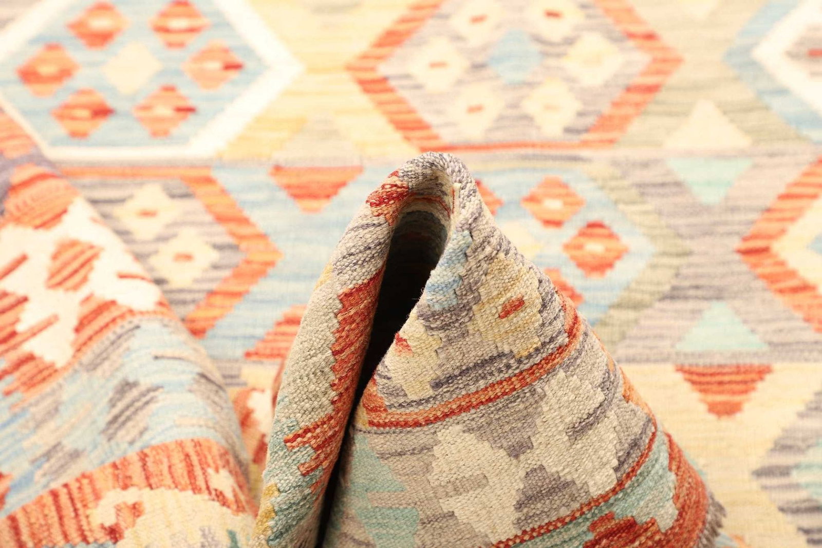 Das geometrische Muster des Afghanischen Kelims ist charakteristisch für die Teppiche dieser Region. Es ist nicht nur dekorativ, sondern auch symbolisch. Geometrische Formen werden oft als Ausdruck der Natur und der Emotionen interpretiert. Die klaren Linien und lebendigen Farben des Designs schaffen einen visuellen Fokus, der sowohl harmonisch als auch dynamisch ist.