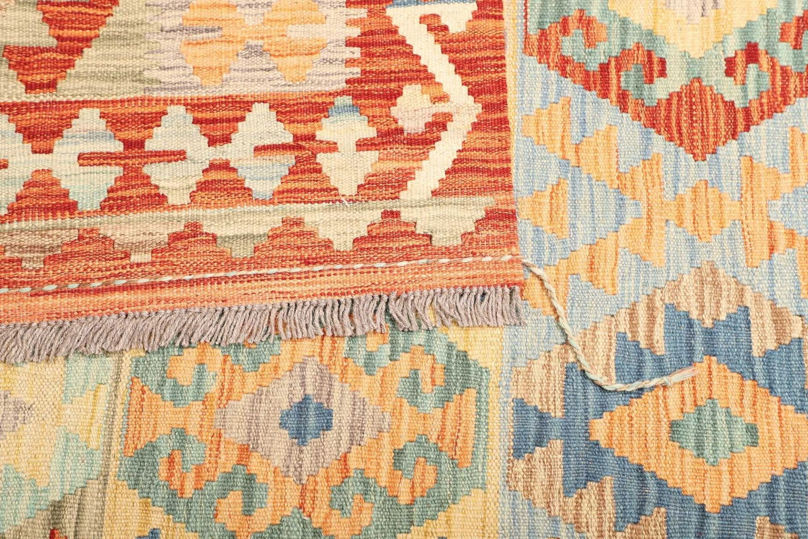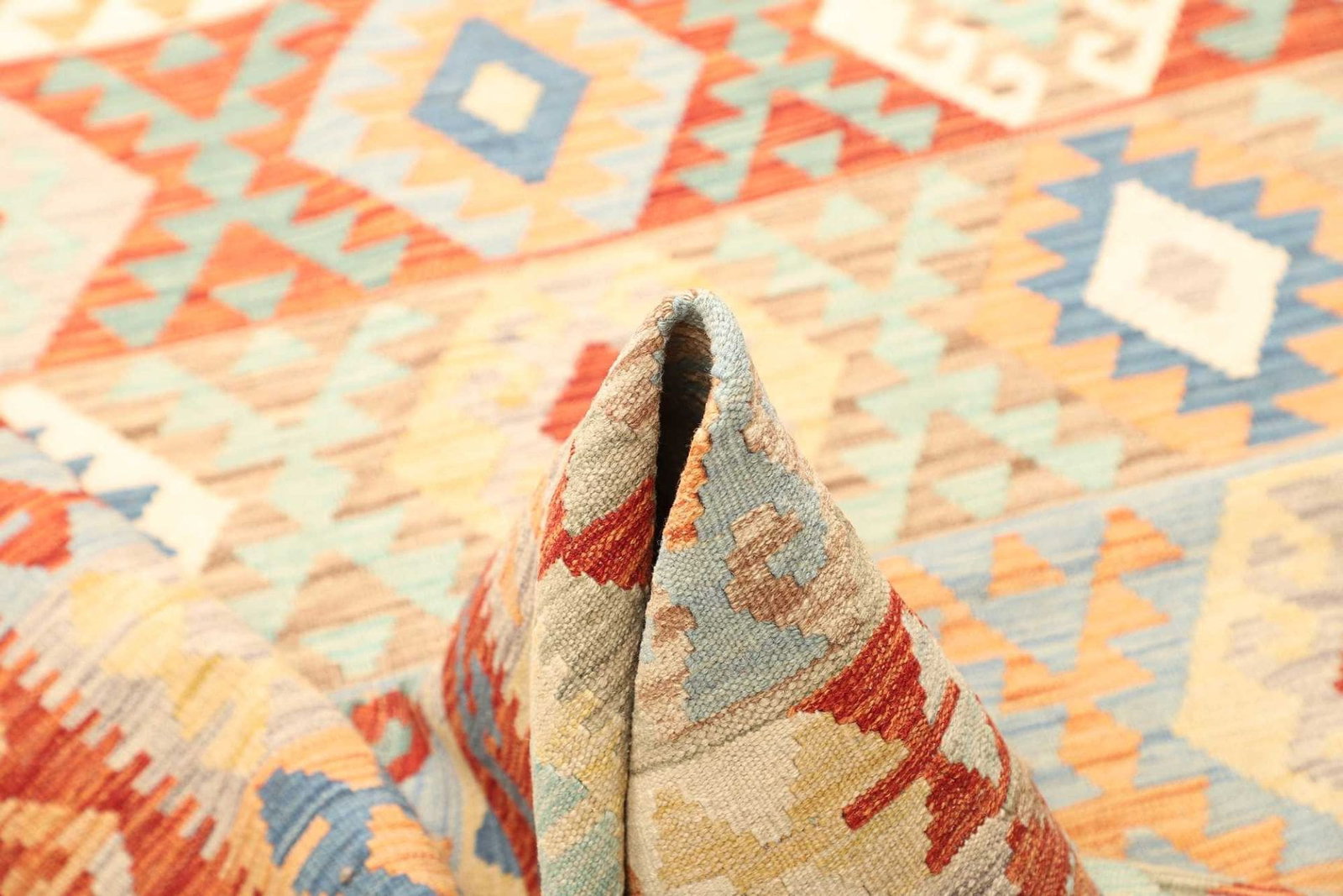 Ein besonderer Vorteil dieses afghanischen Kelims ist seine Pflegeleichtigkeit. Wolle ist schmutzabweisend und ermöglicht eine einfache Reinigung, wodurch der Teppich ideal für stark frequentierte Bereiche in Ihrem Zuhause ist. Zudem ist Wolle antistatisch und hält Staub und Schmutz von der Oberfläche fern, was die Lebensdauer des Teppichs verlängert.