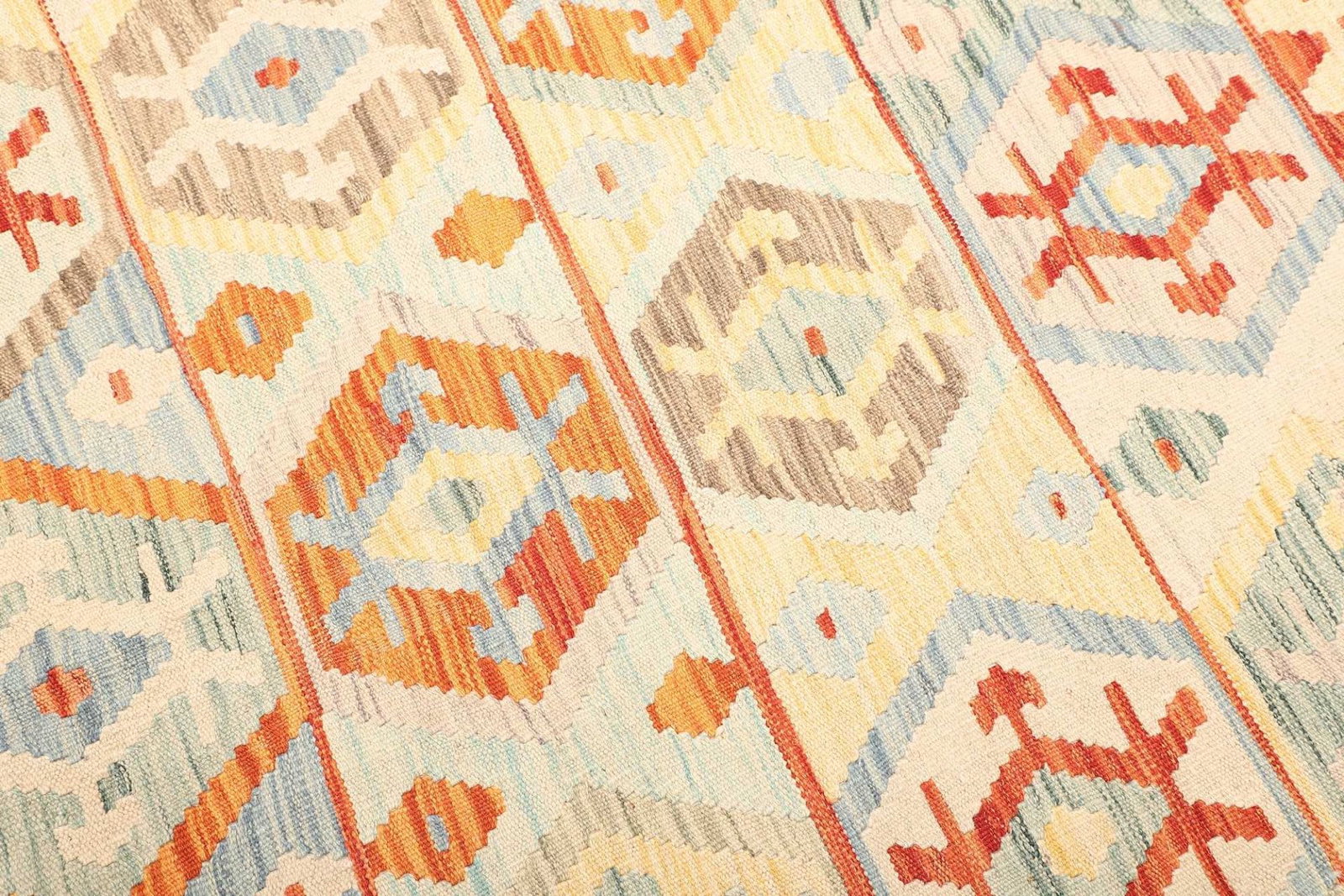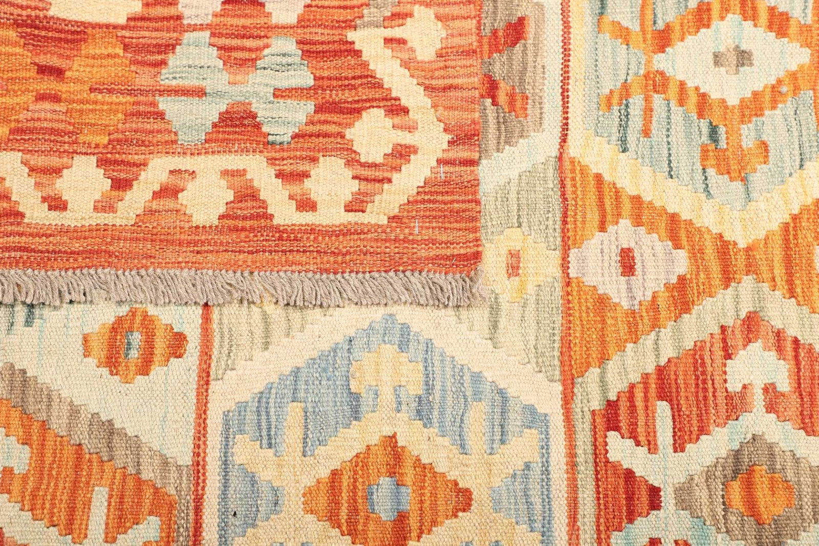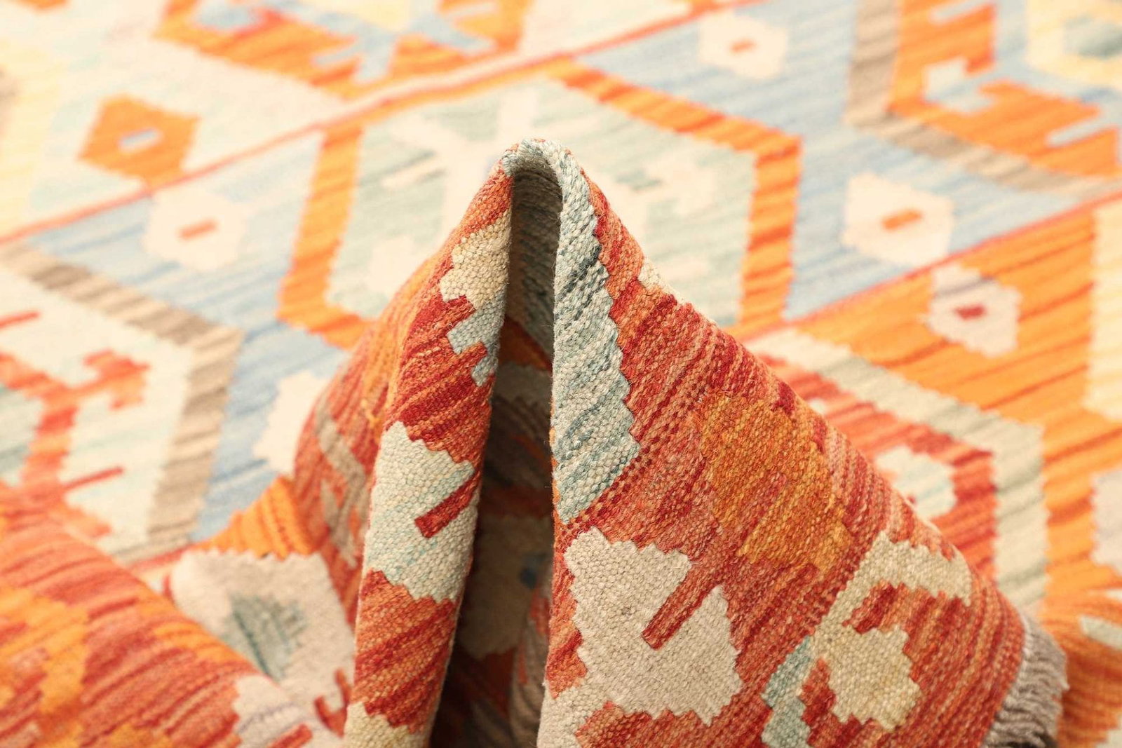 Ein markantes Merkmal dieses Kelims ist sein einzigartiges Muster, das traditionsreiche Designs aus der Region reflektiert und für eine warme, einladende Atmosphäre sorgt. Die meisten Afghanischen Kelims zeichnen sich durch geometrische Formen und kräftige Farben aus, die oft von der Natur und der lokalen Kultur inspiriert sind. Diese Muster erzählen Geschichten und haben oft eine symbolische Bedeutung, die tiefer in die afghanische Geschichte und Tradition verwurzelt ist.