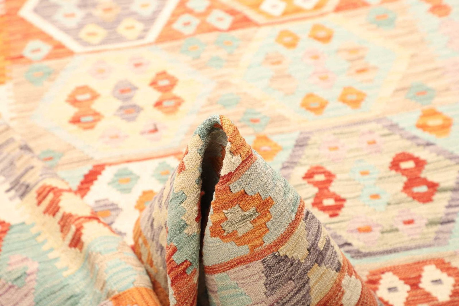 Der Teppich besteht aus reiner Schurwolle, einem Material, das für seine Strapazierfähigkeit und seine natürlichen Eigenschaften bekannt ist. Schurwolle ist nicht nur schmutzabweisend, sondern außerdem hypoallergen und eignet sich somit hervorragend für verschiedene Wohnräume, einschließlich Kinderzimmer oder Wohnräume mit Allergikern. Die handgewebte Technik, die bei der Herstellung dieses Kelims zum Einsatz kommt, sorgt für eine besondere Langlebigkeit und verleiht dem Teppich einen einzigartigen Charakter.