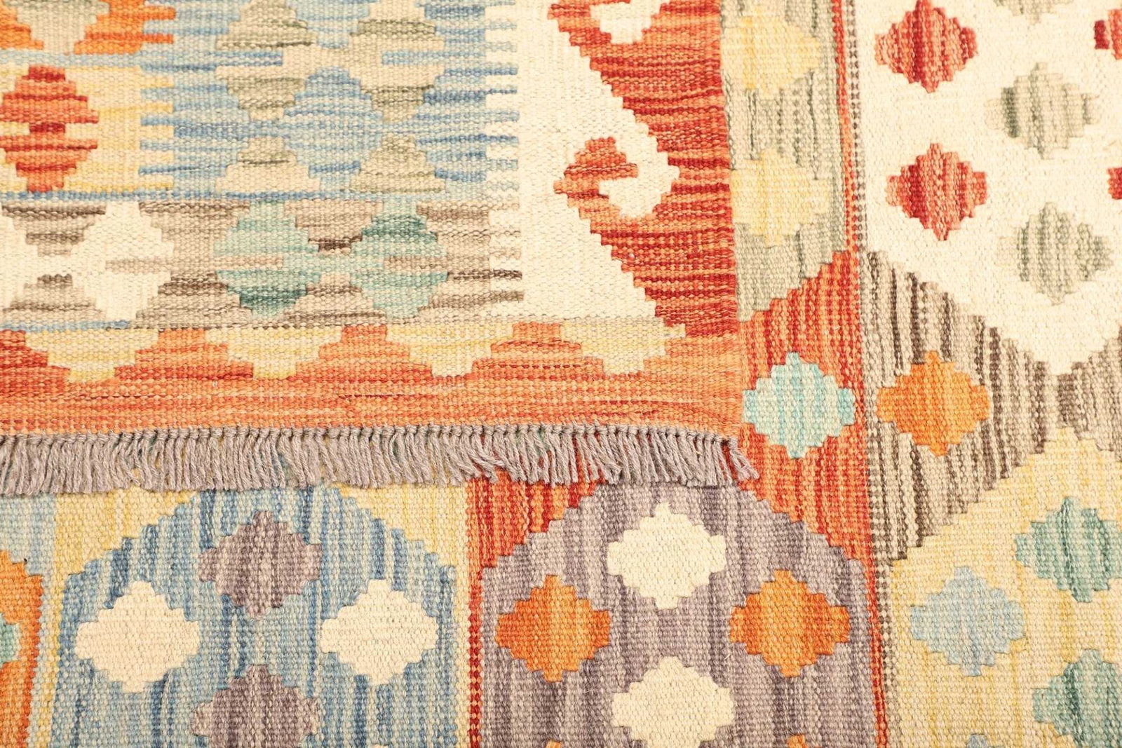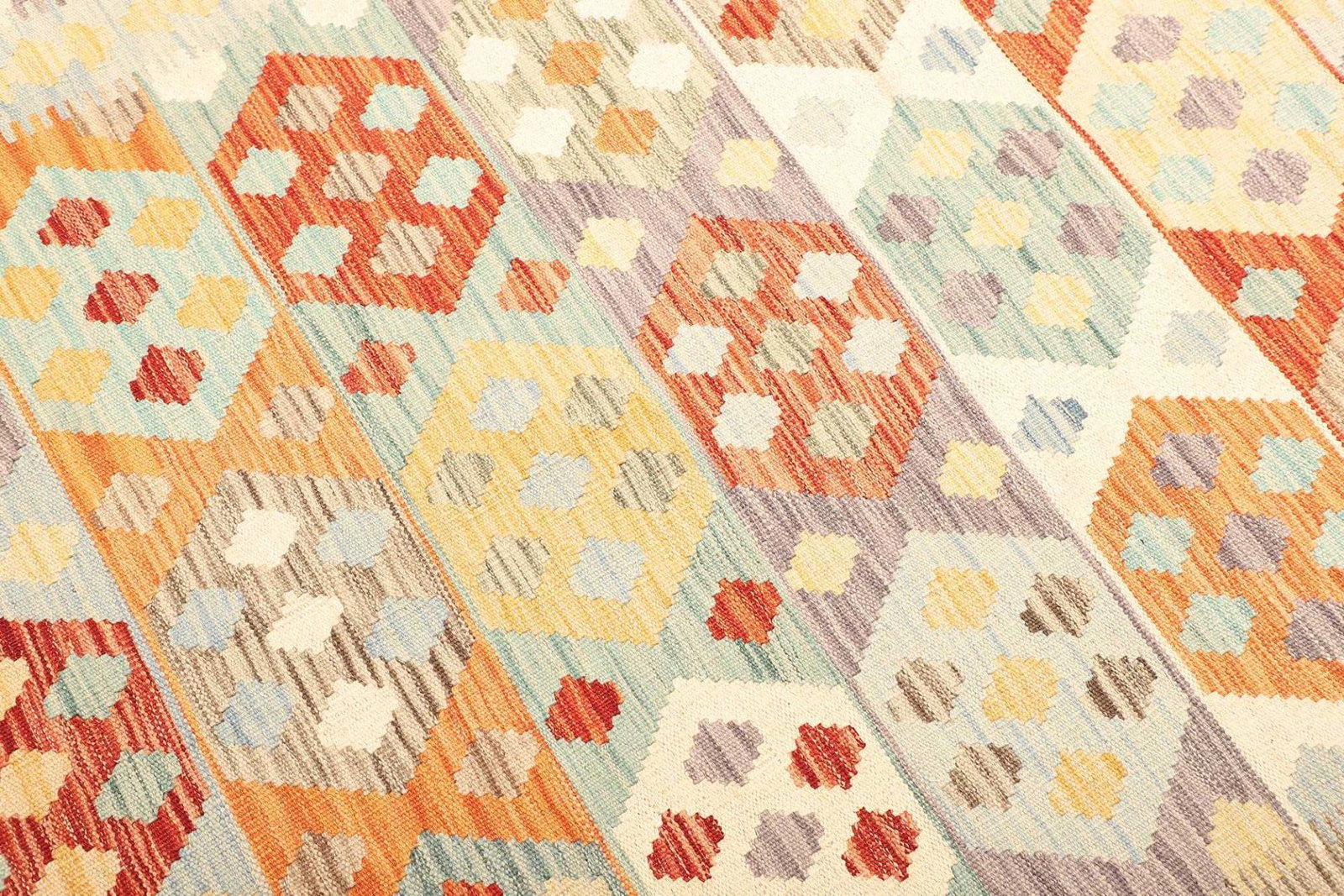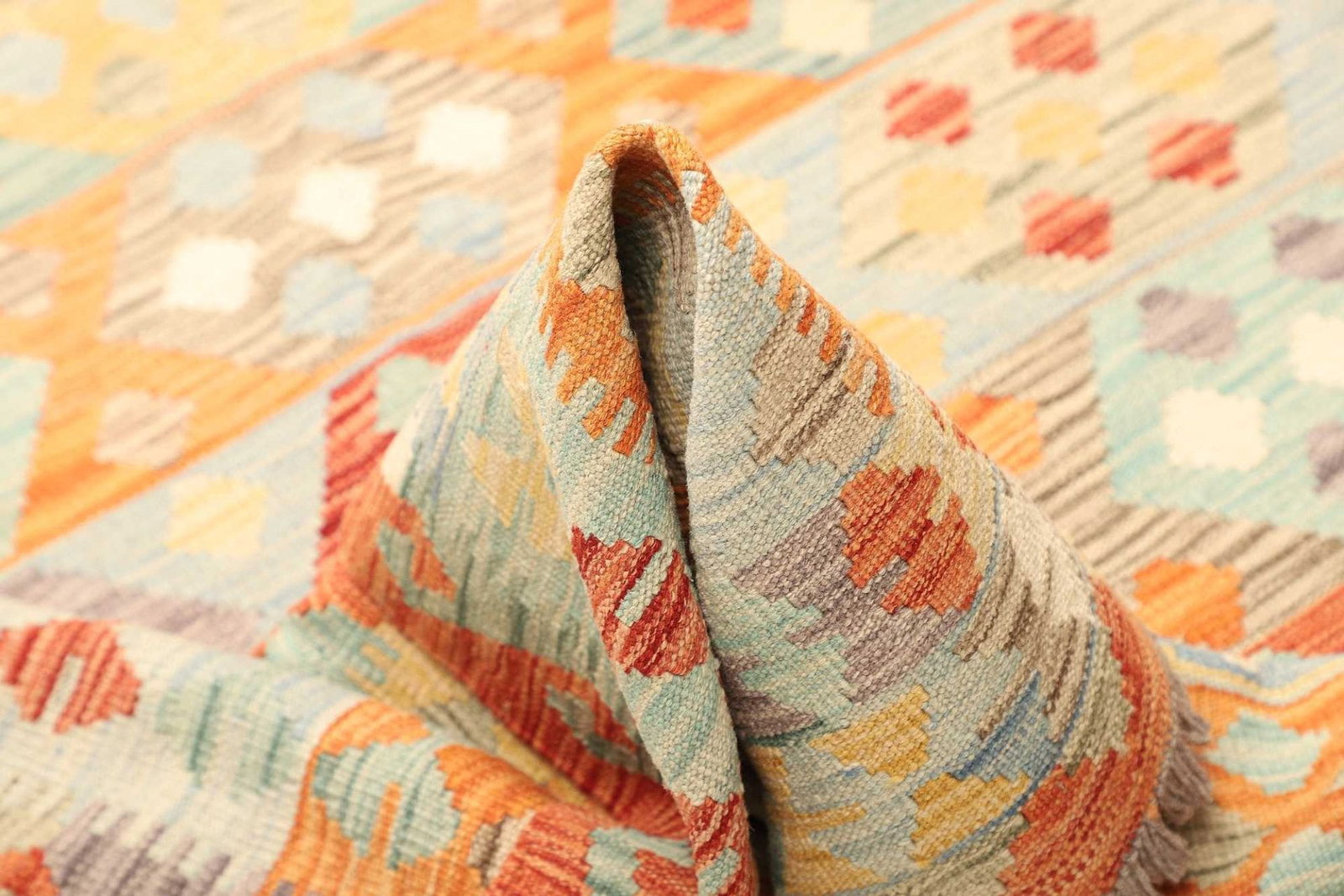 Farben wie Rot, Blau, Beige und verschiedene Erdtöne sind typisch für afghanische Kelims und bringen Wärme und Gemütlichkeit in jeden Raum. Der Teppich fügt sich perfekt in verschiedene Einrichtungsstile ein, sei es Boho-Chic, modern, oder traditionell, und lässt sich sowohl in Wohn- als auch Schlafzimmern hervorragend kombinieren.