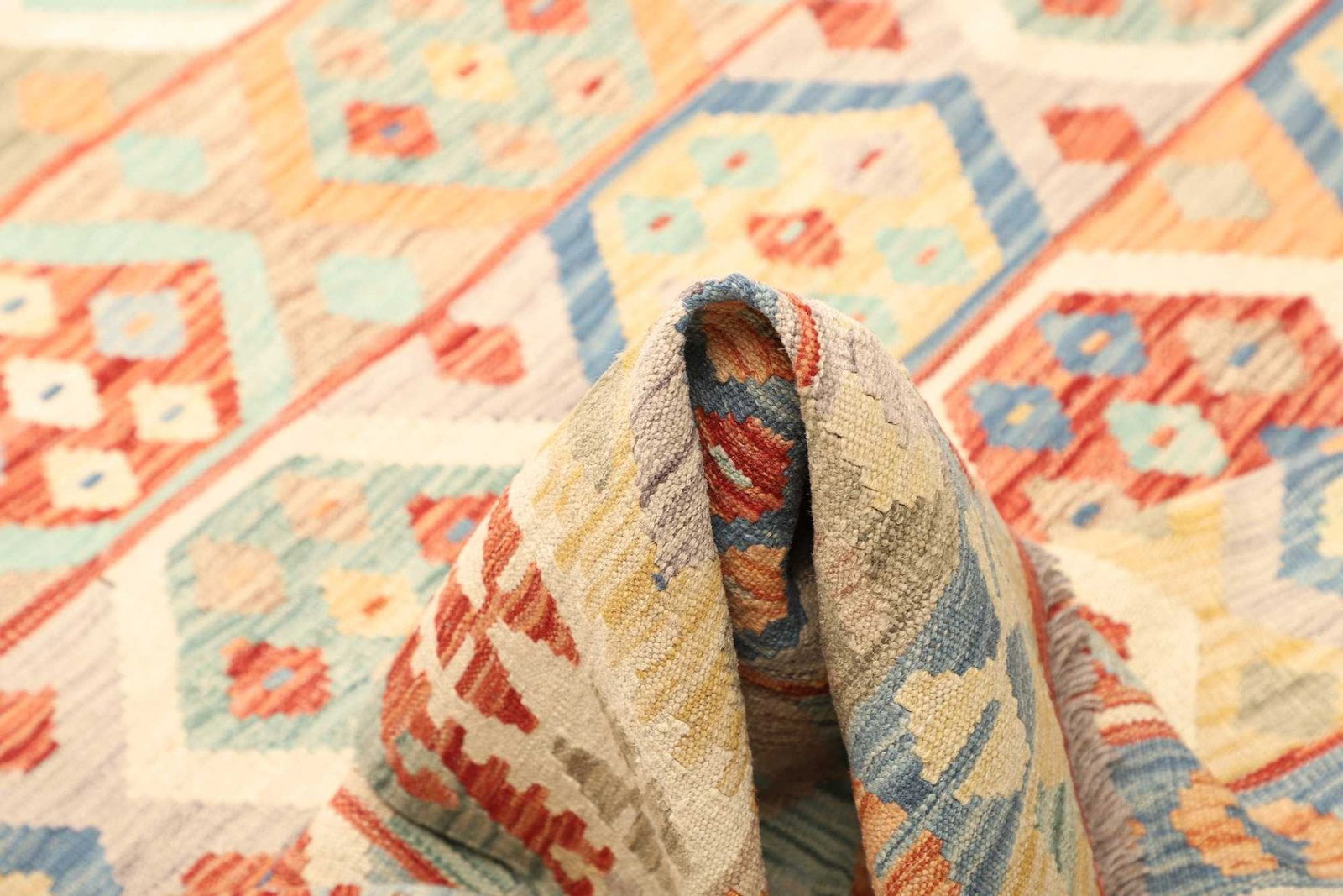 Willkommen in der Welt der exquisiten Teppichkunst! Der Afghanische Kelim ist ein Meisterwerk, das nicht nur Ihr Zuhause verschönert, sondern auch eine reiche kulturelle Geschichte in sich trägt. Mit seinem geometrischen Muster und der handgewebten Technik hebt sich dieser Orientteppich von jeder Massenware ab. Er repräsentiert die exquisite Handwerkskunst, die in der Region Afghanistan tief verwurzelt ist.