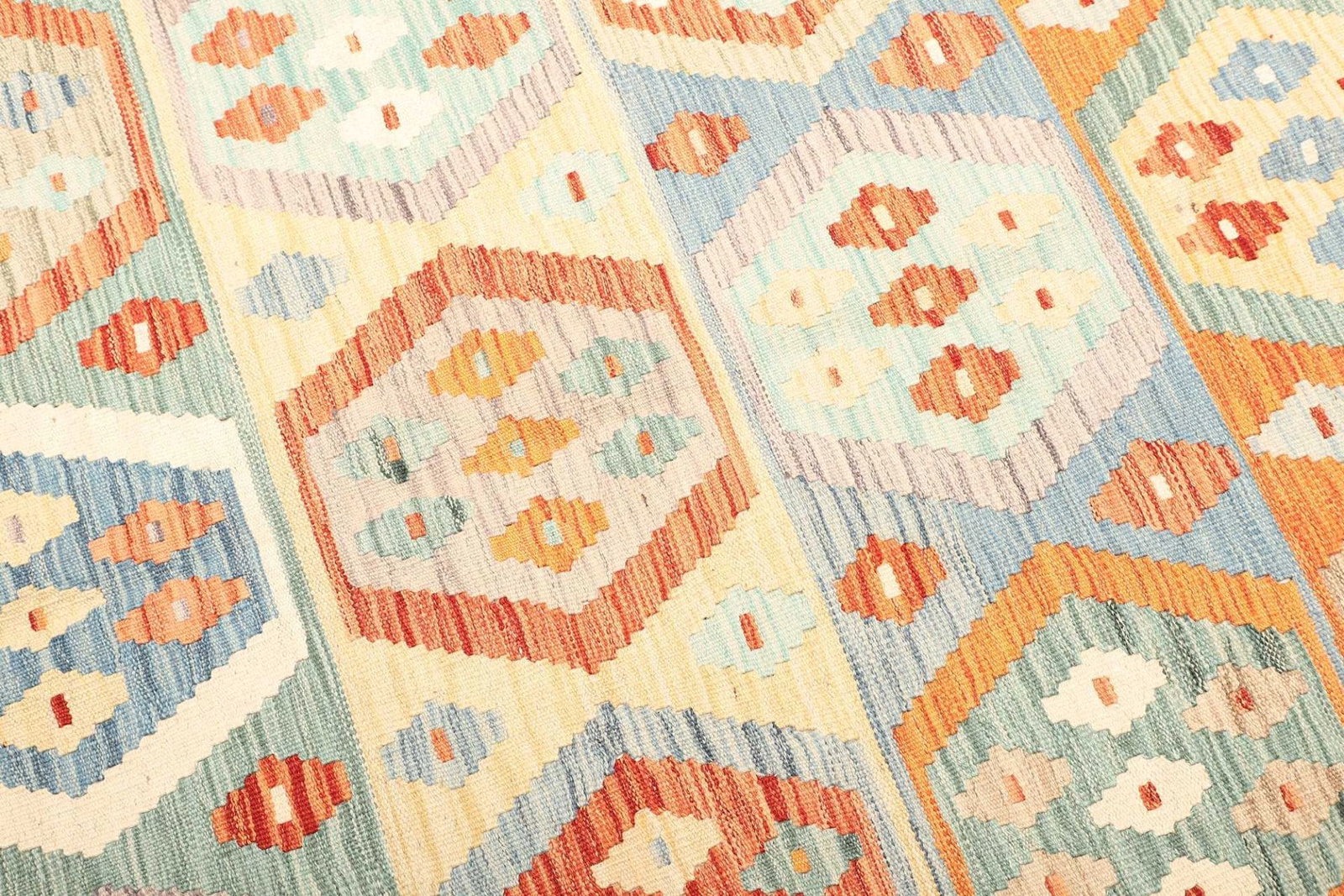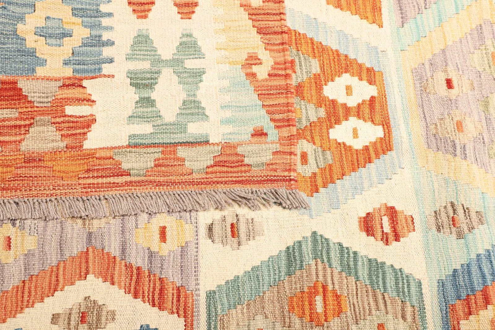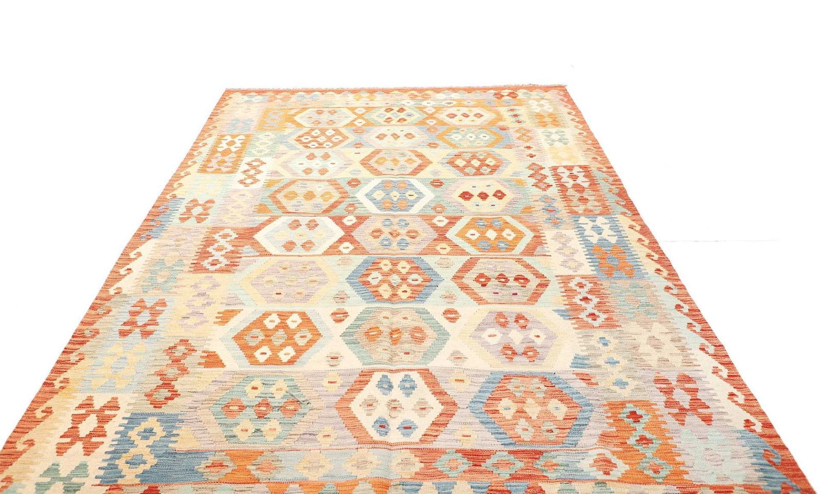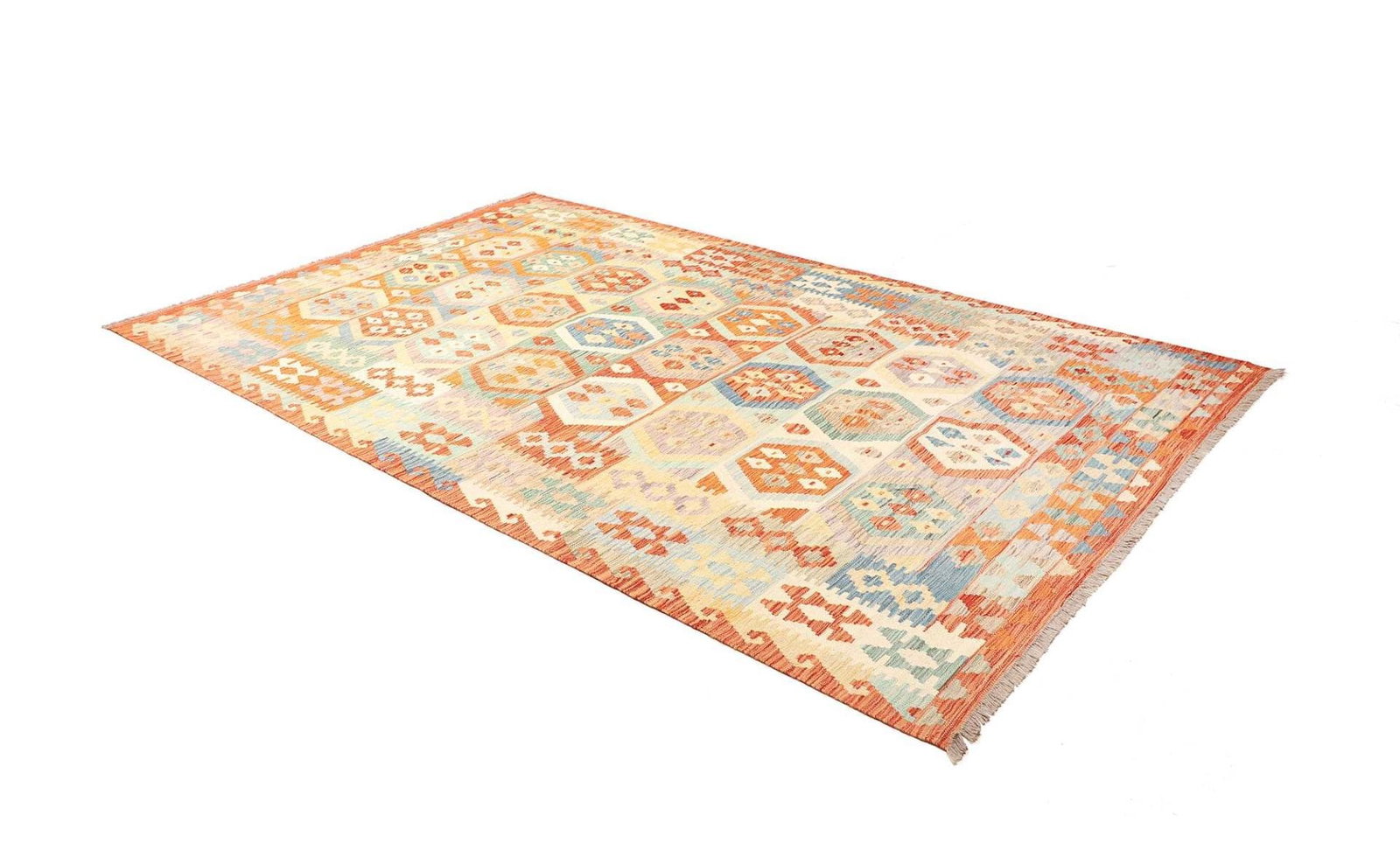 Kelim Teppich | Knotendichte: ca. 200.000 Knoten/m² | Material: 100% Schurwolle (Flor) und 100% Baumwolle (Kette) | Größe: 193 x 308 cm | Herkunft: Afghanistan | Zustand: Handgewebte Qualität | Höhe: ca. 5 mm | Beidseitig verwendbar