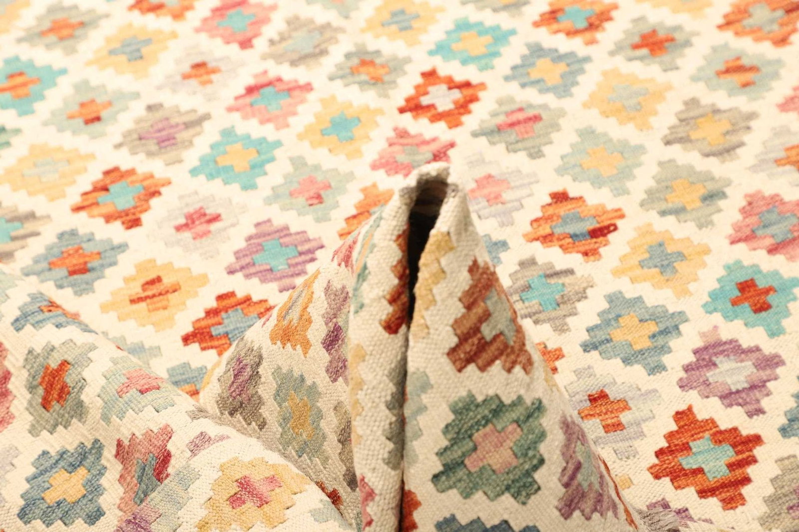 Die afghanische Teppichkunst wird oft durch den Einfluss verschiedener ethnischer Gruppen geprägt. Diese Teppiche reflektieren die Kunstfertigkeit und den Einfallsreichtum der nomadischen Stämme, die noch heute gewoben werden. Als Teil der „Kelim“-Tradition entstehen helle, geometrische Muster und lebendige Farben, die das einzigartige Erbe Afghanistans verkörpern.