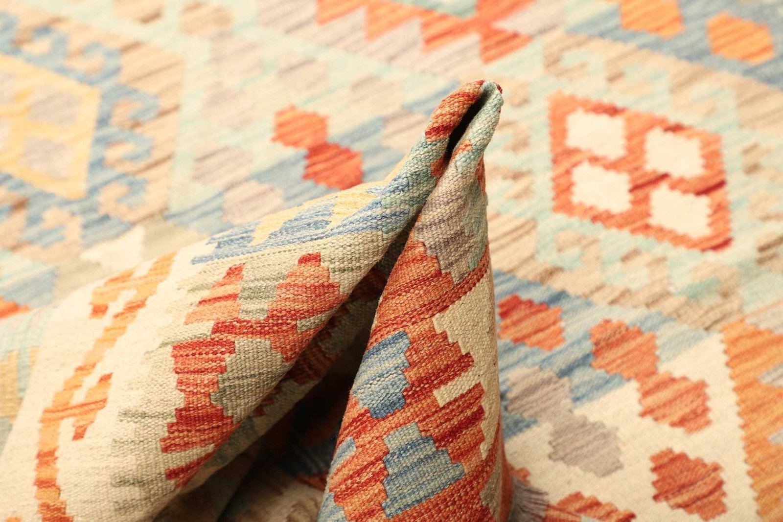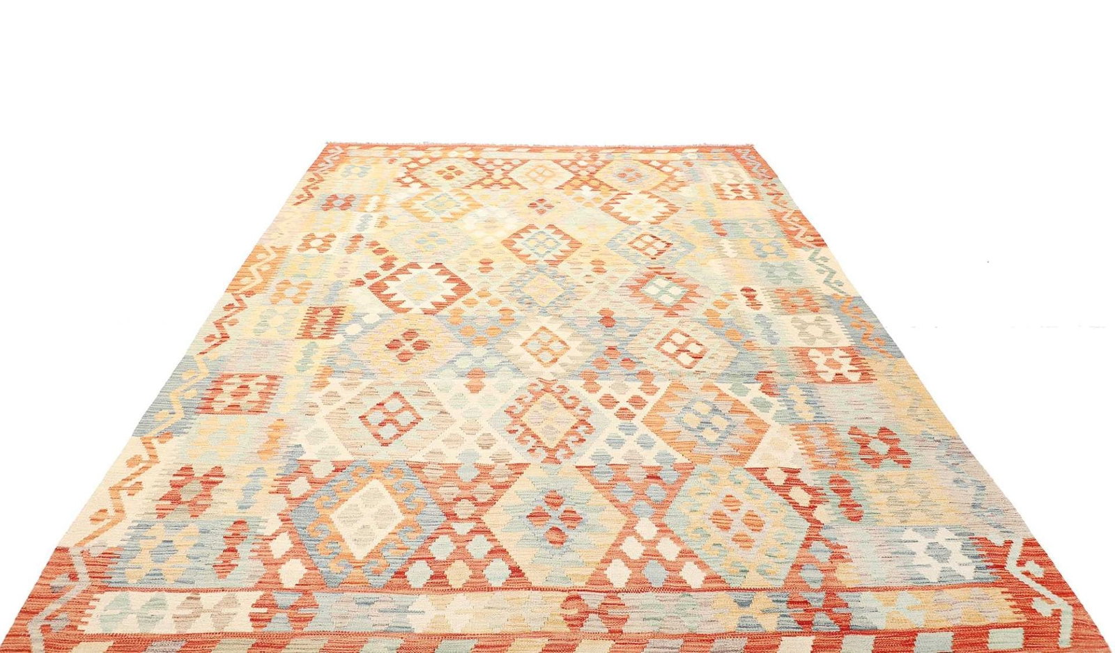 1022$Ursprünglicher Preis war: 1022$880$Aktueller Preis ist: 880$Kelim Teppich | Knotendichte: ca. 200.000 Knoten/m² | Material: 100% Schurwolle (Flor), 100% Baumwolle (Kette) | Größe: 207×294 cm | Herkunft: Afghanistan | Zustand: Handgewebt | Höhe: ca. 5mm | Beidseitig verwendbar