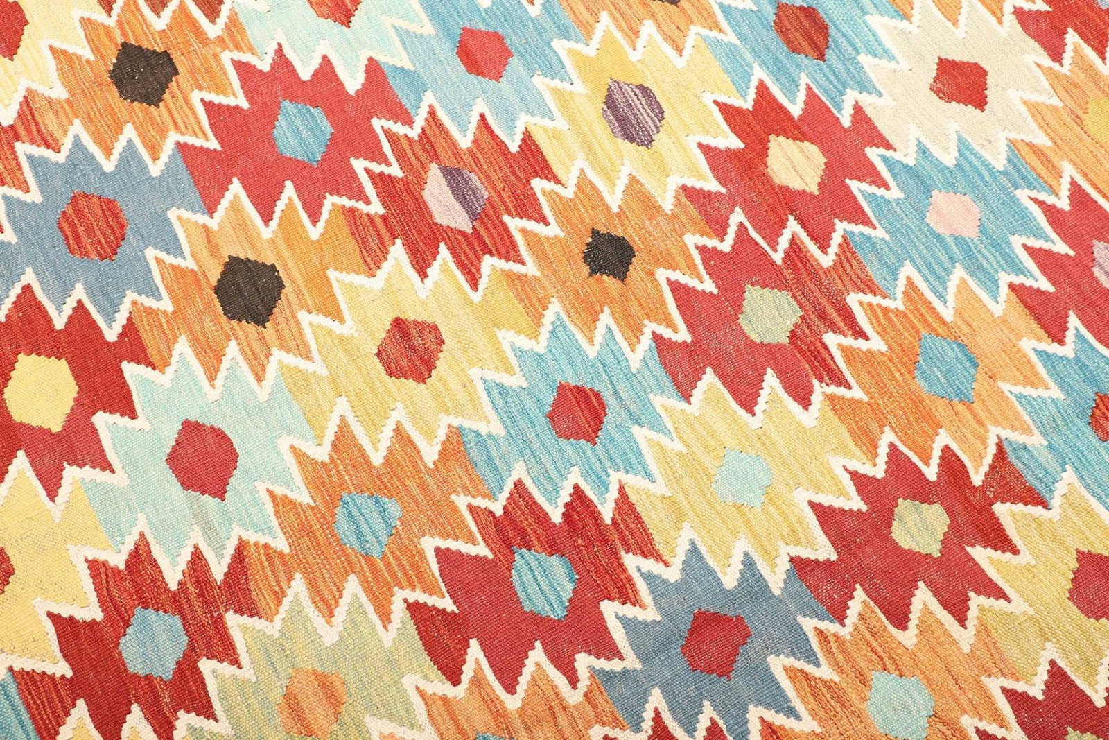 Der Charakter des Kelims wird maßgeblich durch sein einzigartiges Design geprägt. Typisch für afghanische Kelims sind die bunten geometrischen Muster und lebhaften Farbtöne, die dem Teppich eine dynamische und ansprechende Optik verleihen. Oft beinhalten diese Muster Symboliken, die verschiedene Aspekte des Lebens zelebrieren, sei es die Verbundenheit zur Natur, zum Glauben oder der Gemeinschaft. Die kunstvollen Designs machen diesen Teppich zu einem echten Blickfang und bieten zahlreiche Möglichkeiten zur Integration in verschiedene Einrichtungsstile, von traditionell bis modern.