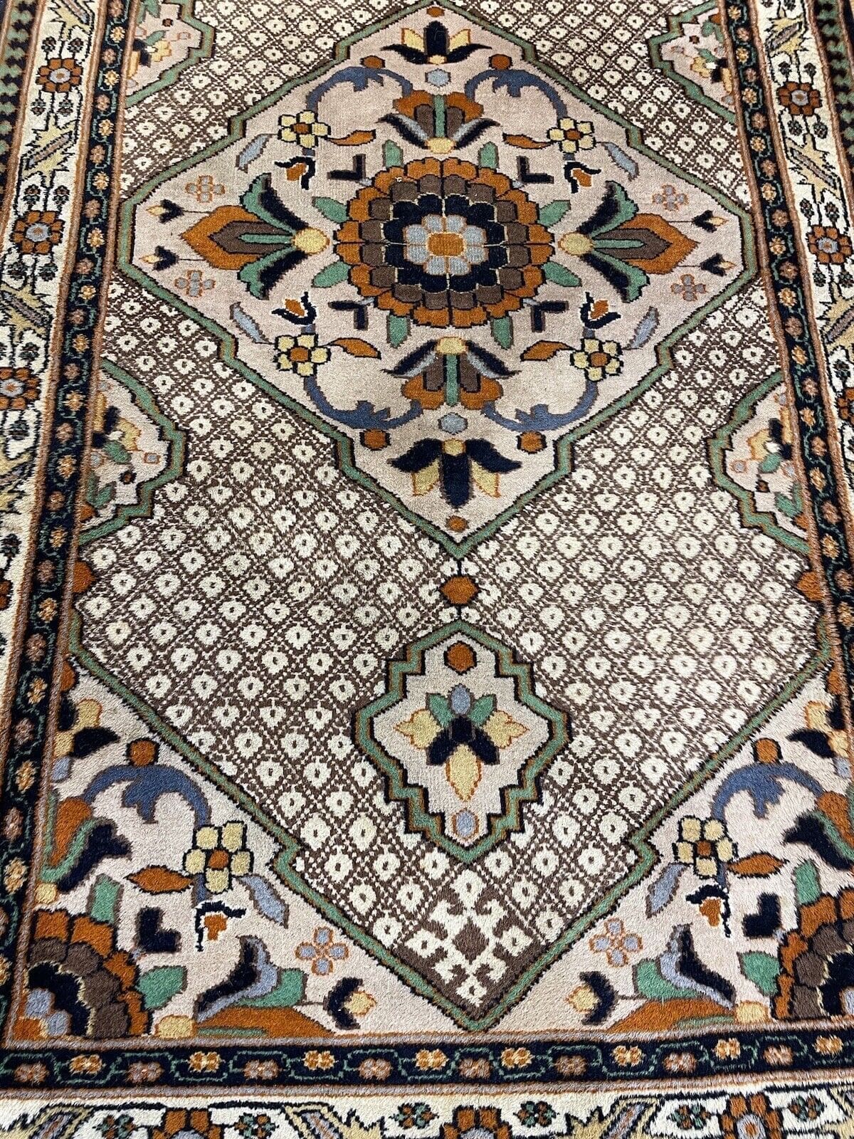 Das Design des Teppichs zeichnet sich durch mehrere anmutige Medaillons aus, die kunstvoll in das Gesamtbild integriert sind. Diese Medaillons sind nicht nur dekorativ, sondern erzählen auch Geschichten aus der reichen Kultur der Teppichknüpfkunst. Die dekorierten Ecken des Teppichs runden das elegante Muster ab und verleihen ihm eine harmonische Ausstrahlung. Mit einer schmalen Bordüre, die das Design dezent einrahmt, eignet sich dieser Teppich perfekt für moderne Wohnräume, die eine Prise Tradition und Klasse benötigen.
