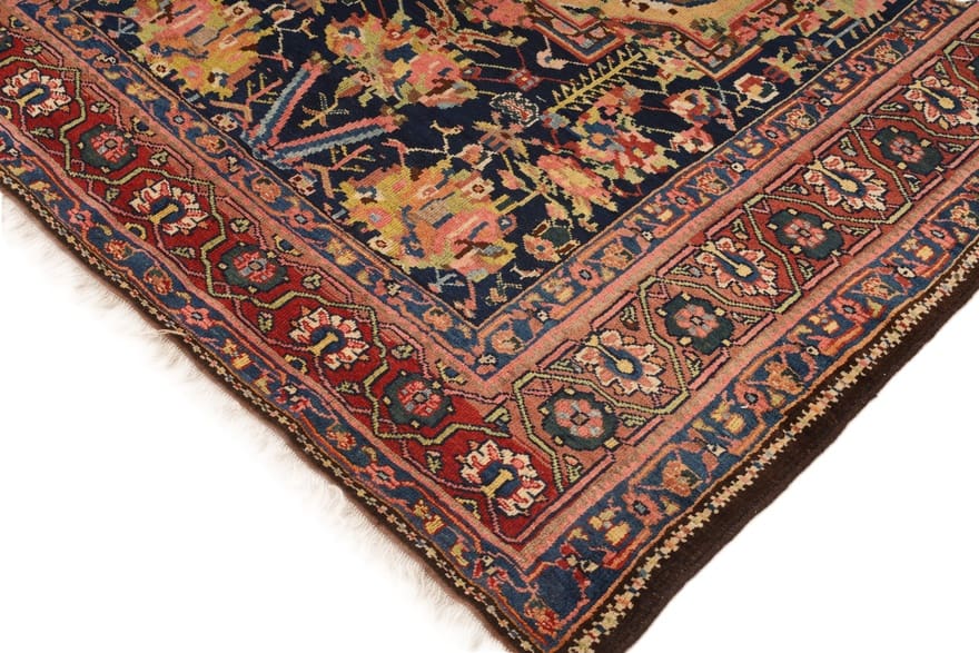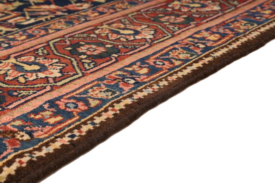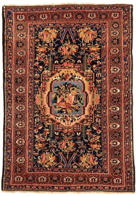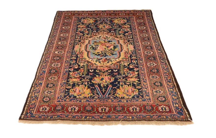 Antiker Bakhtiari Farah Dombeh Teppich | Knotendichte: 160.000 – 200.000 Knoten/m² | Material: Reine Wolle | Größe: 213×149 cm | Alter: Über 70 Jahre | Ursprung: Iran / Persien | Zustand: Antik | Pflegeleicht und nachhaltig | Florales Design in tiefem Mitternachtsblau mit rotem Rahmen