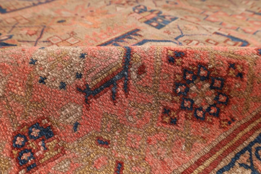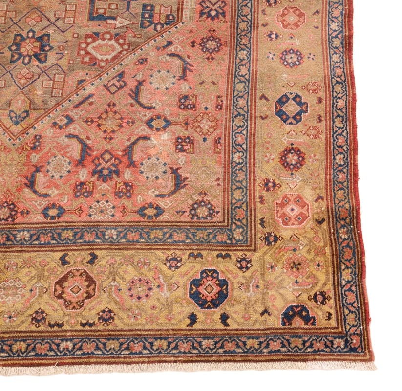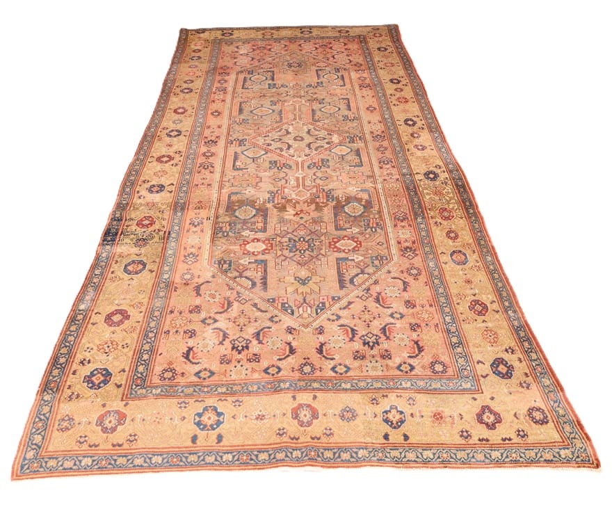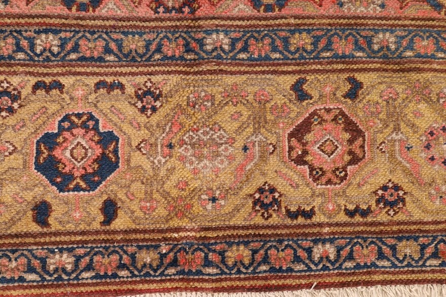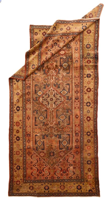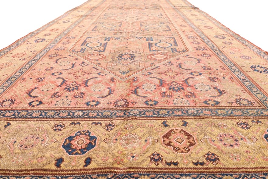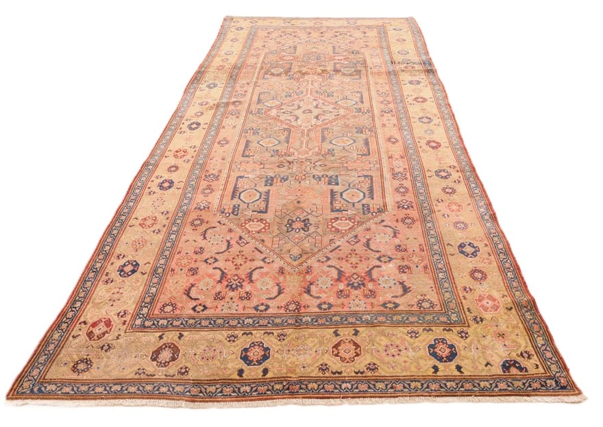 Antiker Malayer Teppich | Knotendichte: 320.000 – 360.000 Knoten/m² | Material: Hochwertige Schurwolle | Größe: 367×165 cm | Zustand: Antik, mind. 95 Jahre alt | Ursprung: Iran / Persien | Farben: Ocker, Rostrot, Blau, Oliv, Creme | Verarbeitung: Handgeknüpft | Dicke: ca. 10 mm | Gewicht: ca. 12 kg