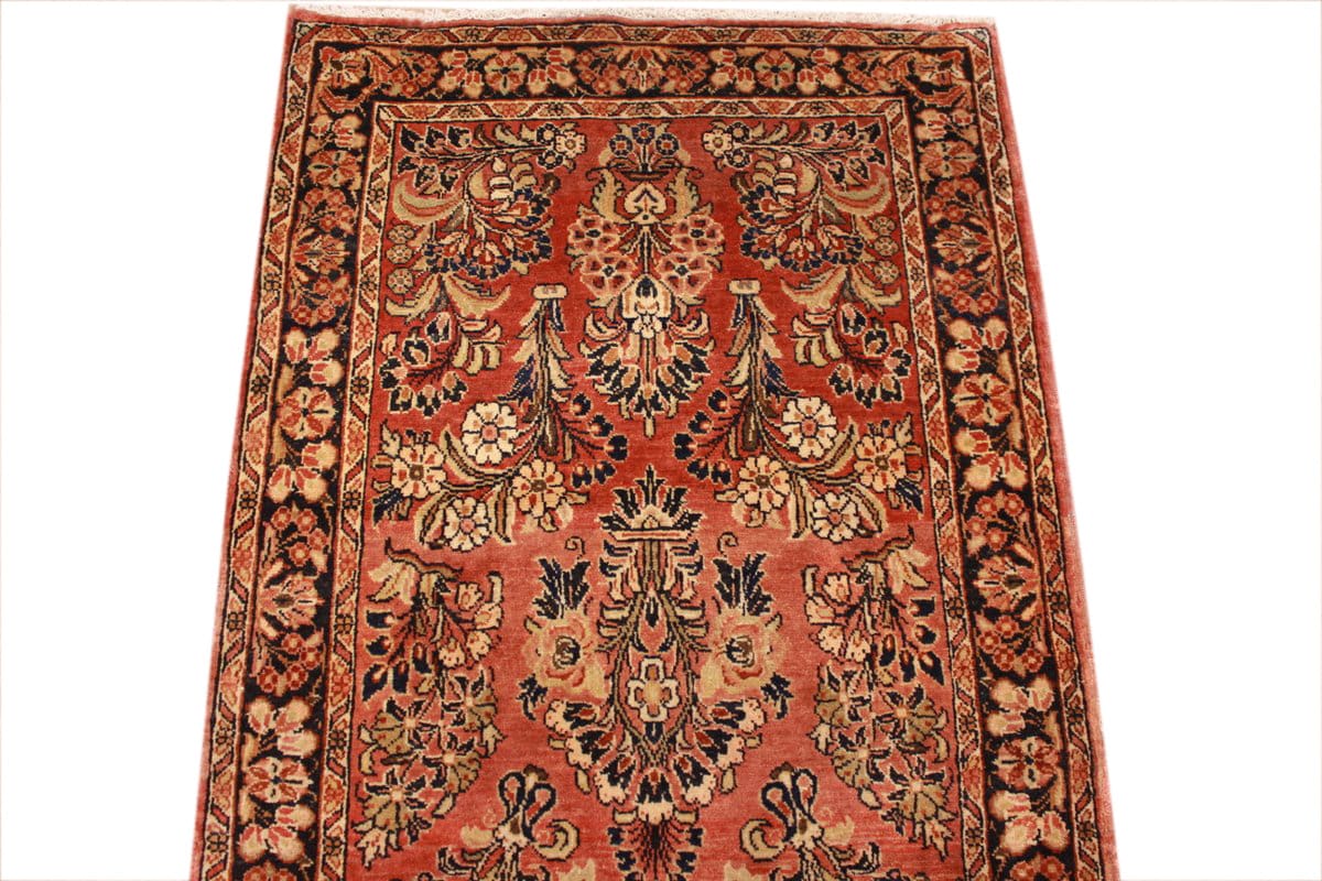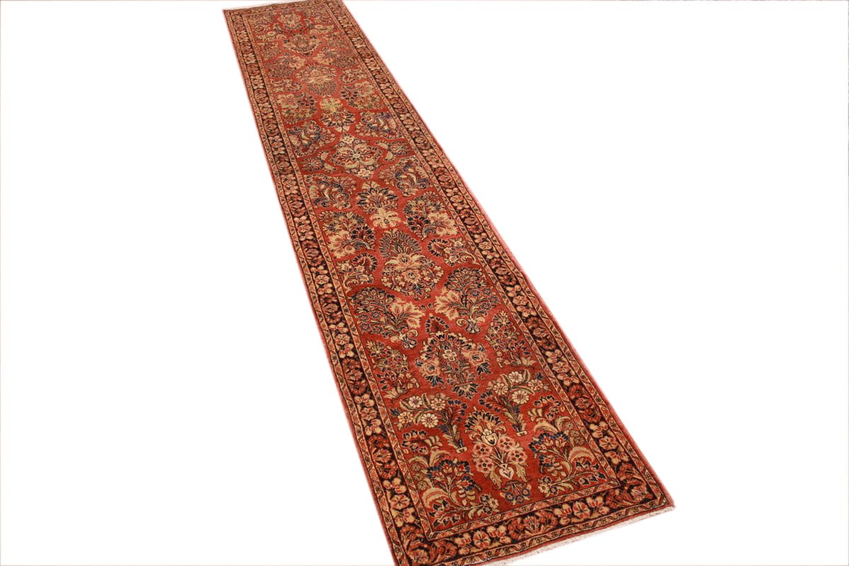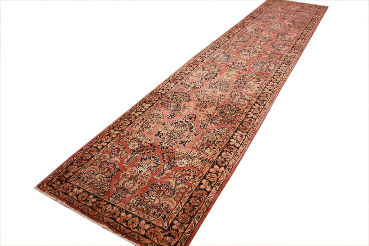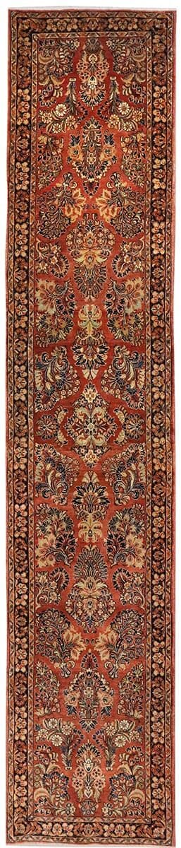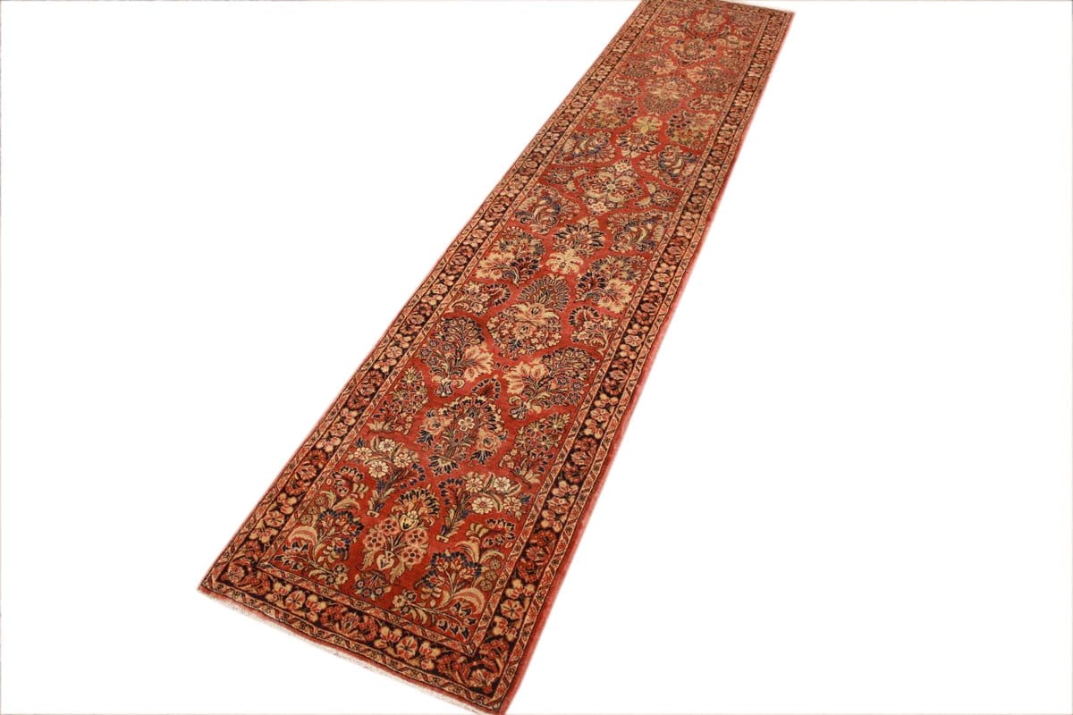 Antiker Perserteppich Sarough | Knotendichte: Hoch, genaue Zahl nicht angegeben | Muster: Farbenfrohe Blatt- und Blumenmotive | Größe: 416×85 cm | Material: Hochwertige Wolle | Zustand: Antik, gut erhalten | Ursprung: Sarough, Orient