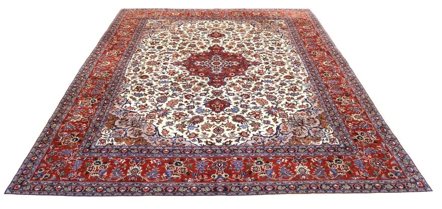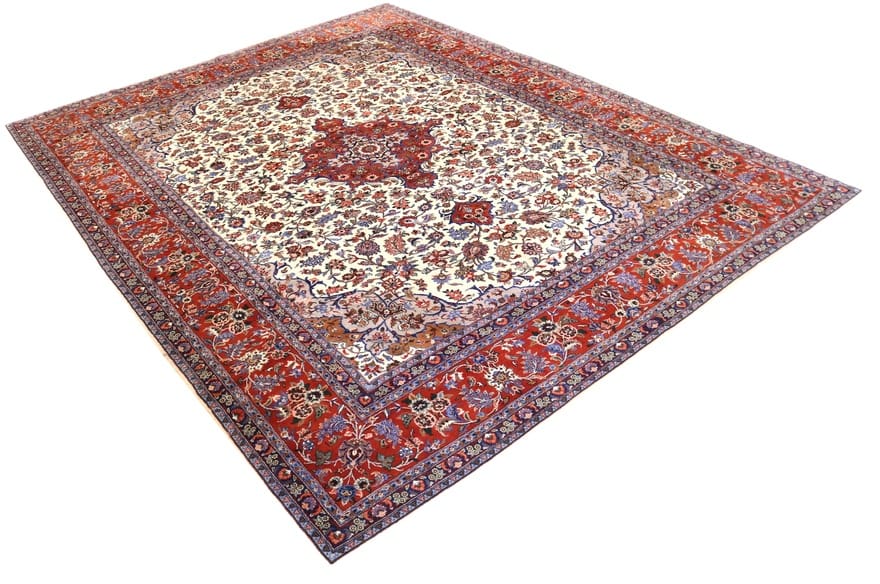 Handgeknüpfter Sarough Teppich | Knotendichte: 200.000 – 250.000 Knoten/m² | Material: Wolle mit Baumwollkette | Größe: 386×305 cm | Farbe: Weiß/Beige | Zustand: Neuzeitlich (0-20 Jahre) | Ursprung: Iran / Persien