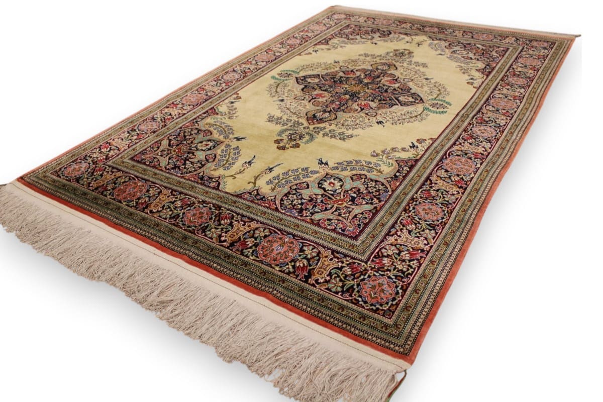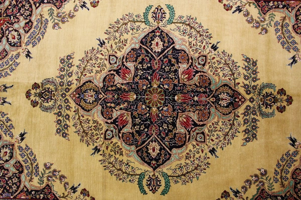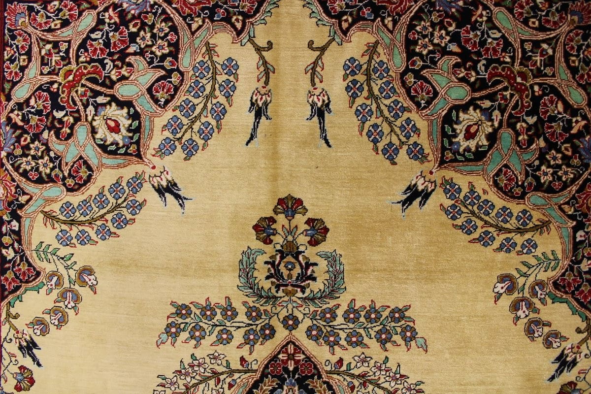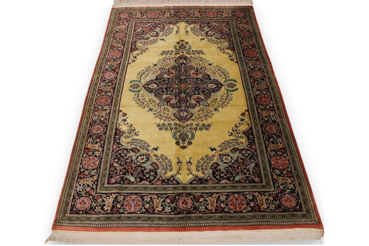 Antiker Seidenteppich Ghom 204×139 cm Gold, handgeknüpft, Perserteppich