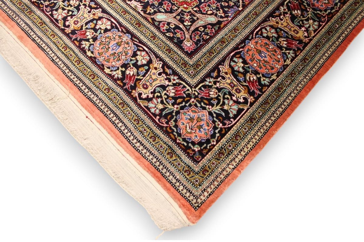 Antiker Seidenteppich Ghom | Knotendichte: 400.000 Knoten/m² | Material: Hochwertige Seide | Größe: 204×139 cm | Farben: Elfenbein, Rot, Türkis, Lichtblau, Grün, Braun | Zustand: Sehr gut erhalten | Ursprung: Iran