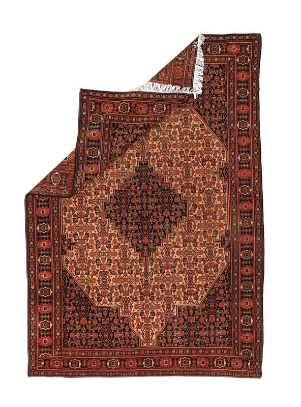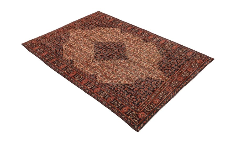 Antiker Senneh Teppich | Knotendichte: 450.000 – 500.000 Knoten/m² | Material: Hochwertige Wolle | Größe: 192×132 cm | Zustand: Antik | Ursprung: Iran/Persien | Muster: Medaillon-Design mit Herati-Muster | Dicke: ca. 8 mm | Gewicht: ca. 9 kg